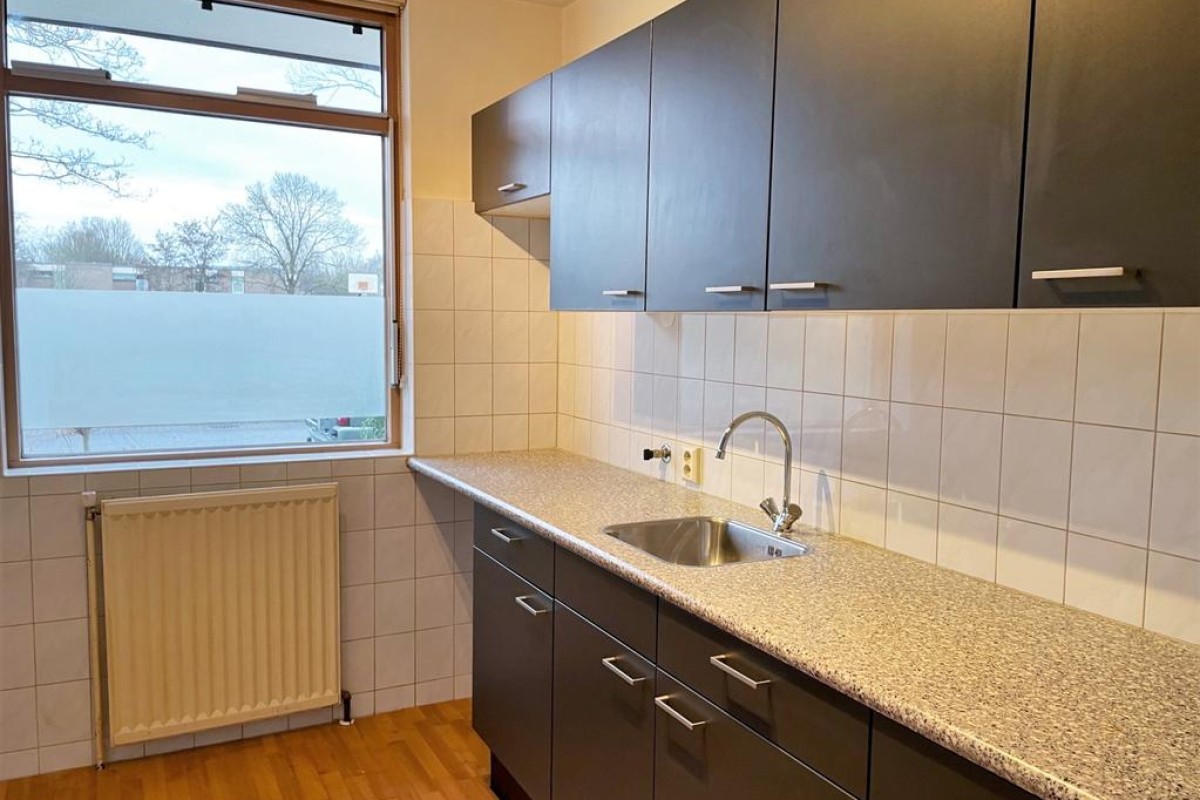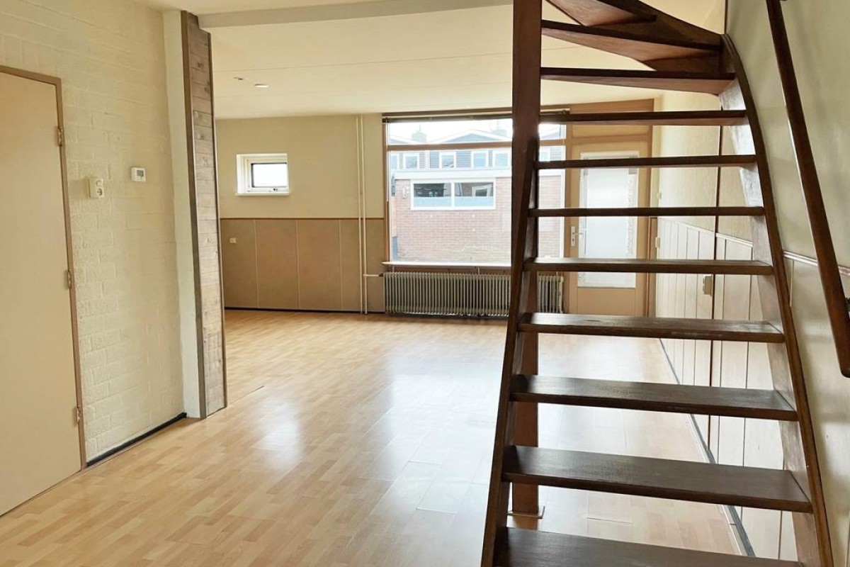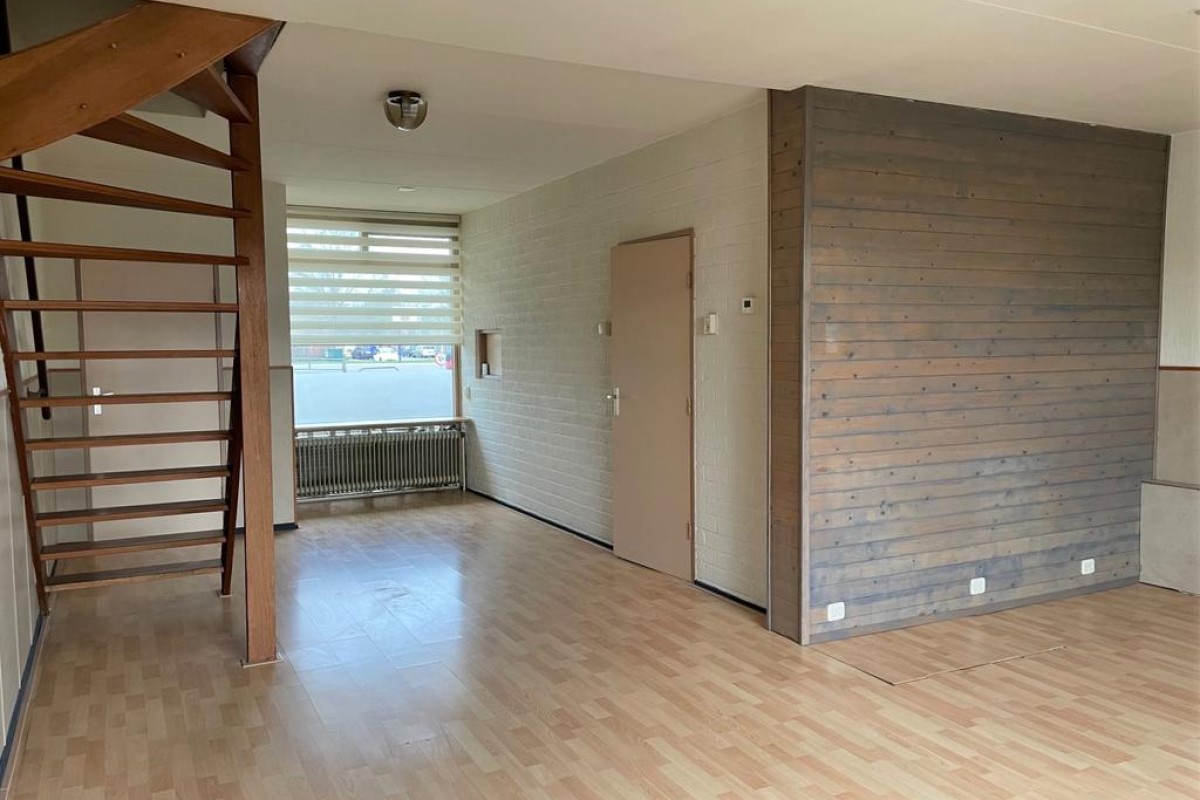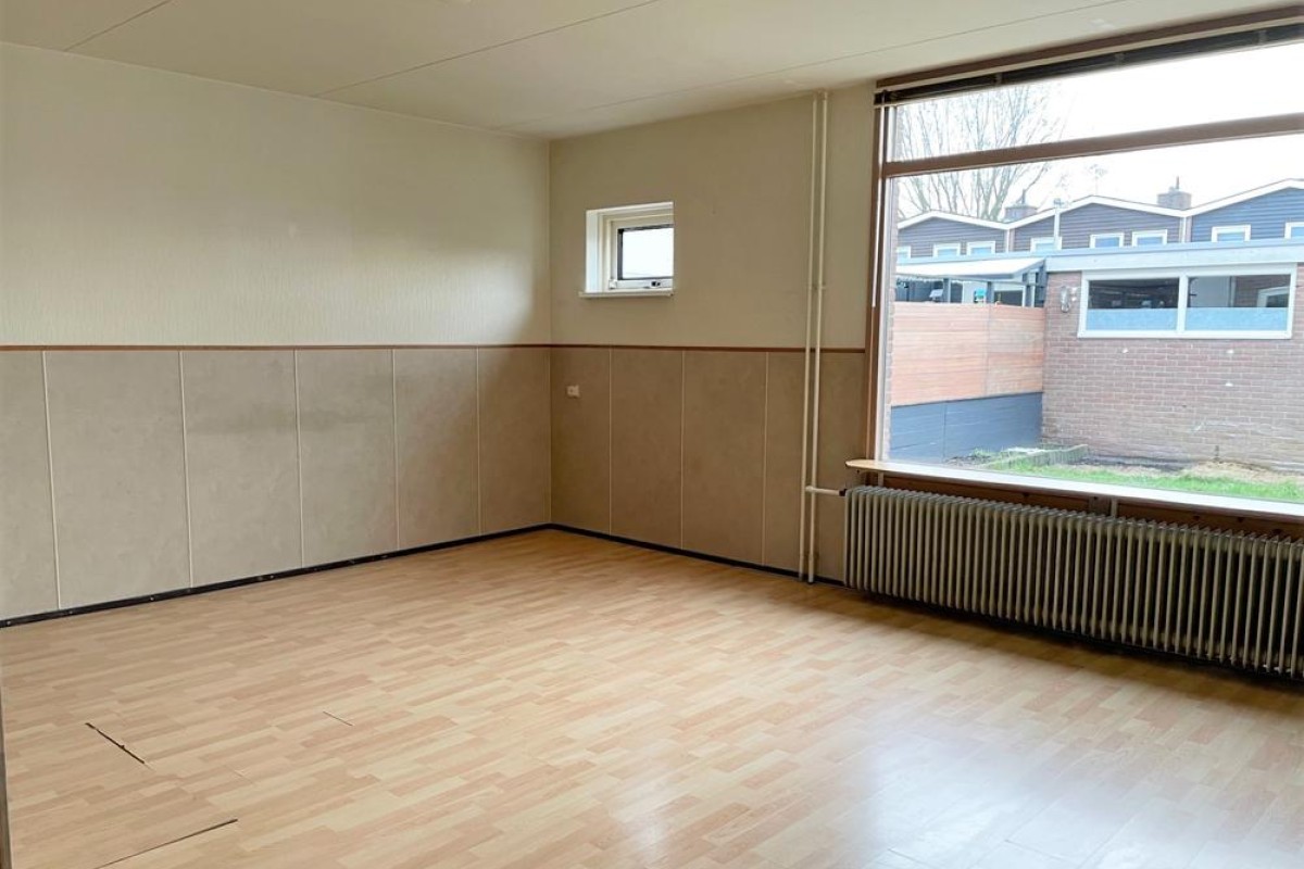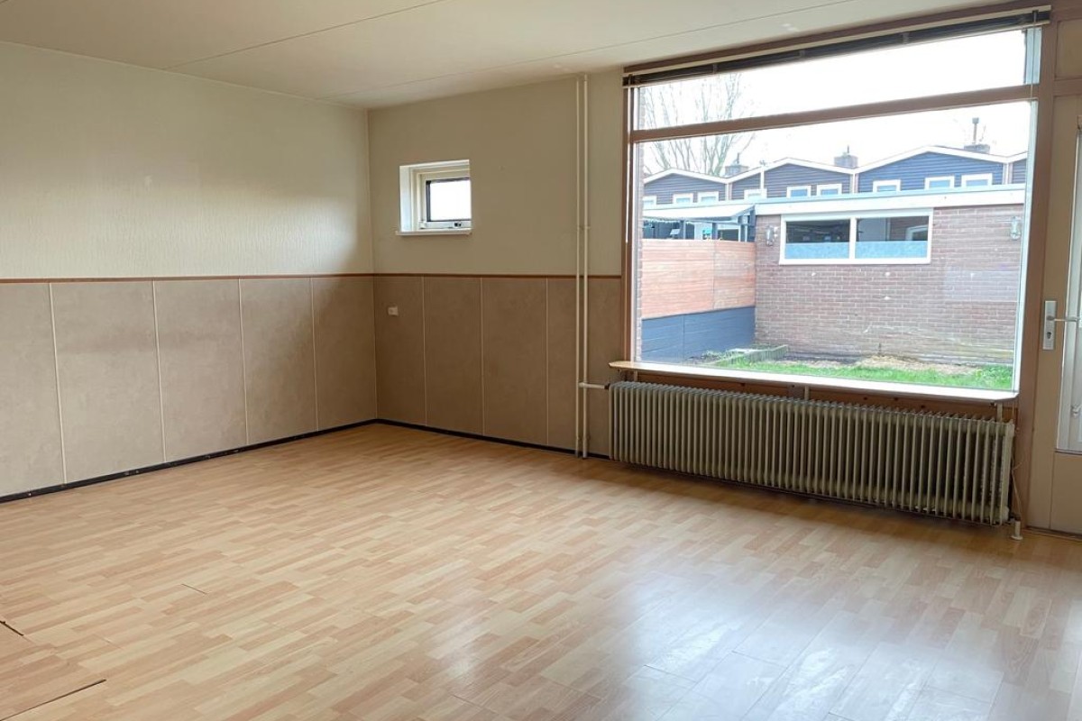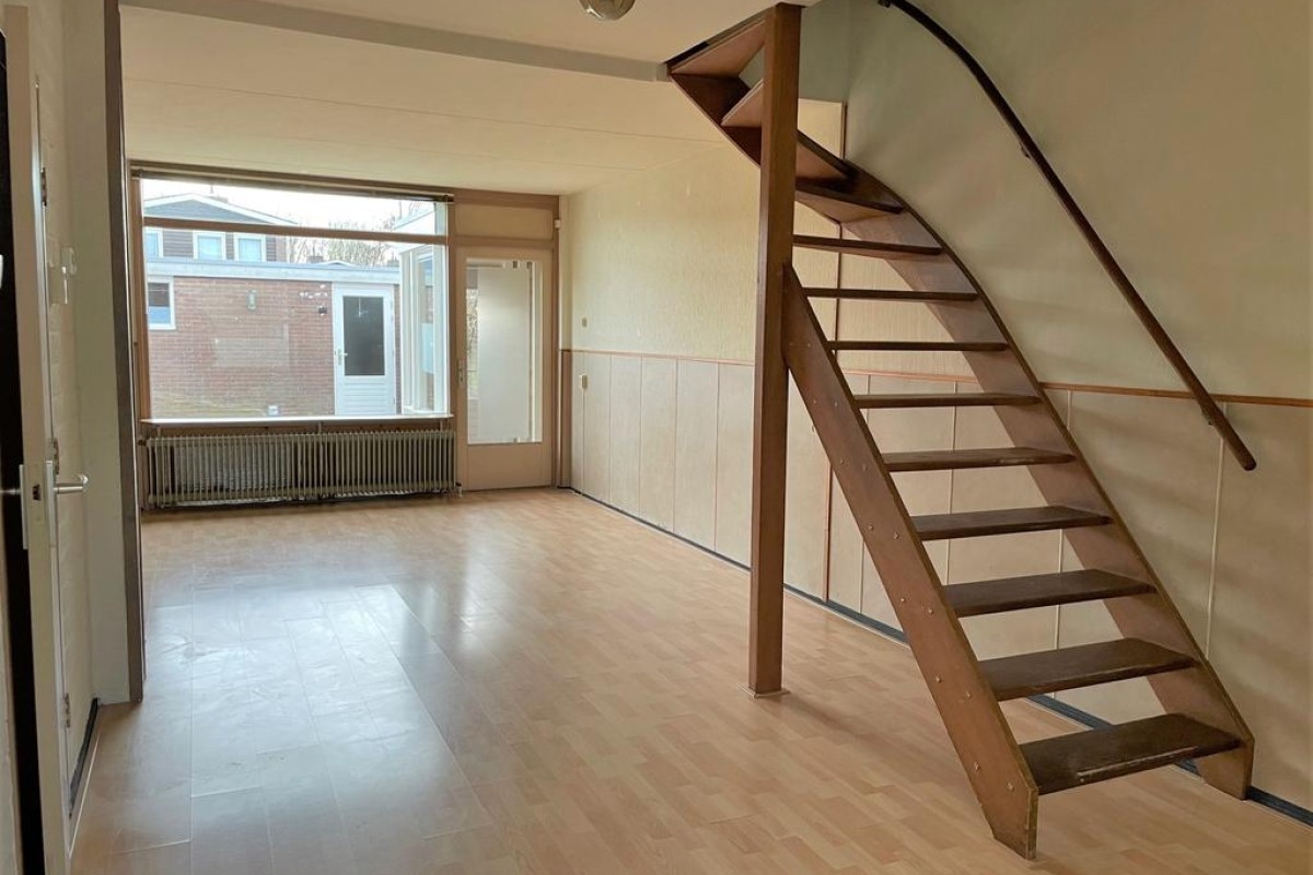 Begane grond: Entree, hal, tuingerichte L-vormige woonkamer, tussenhal met toegang tot toilet, aparte bergkast en de dichte keuken.
