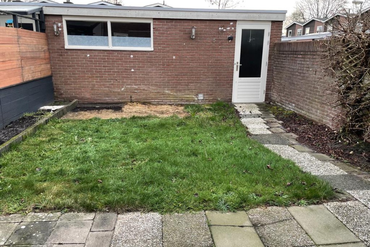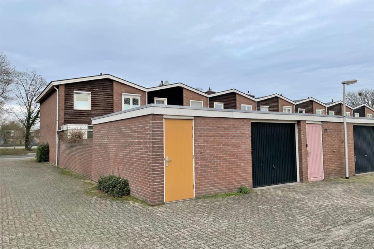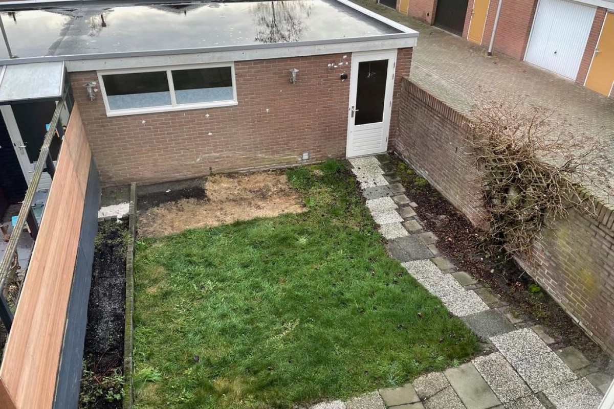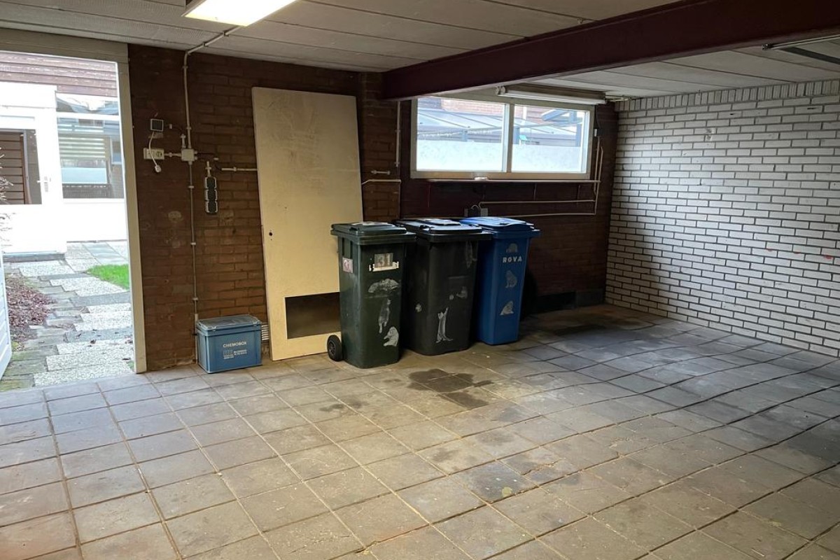 Aan de achterzijde bevindt zich een bijzonder ruime garage/berging over de gehele breedte met stalen kanteldeur alsmede een separate loopdeur.