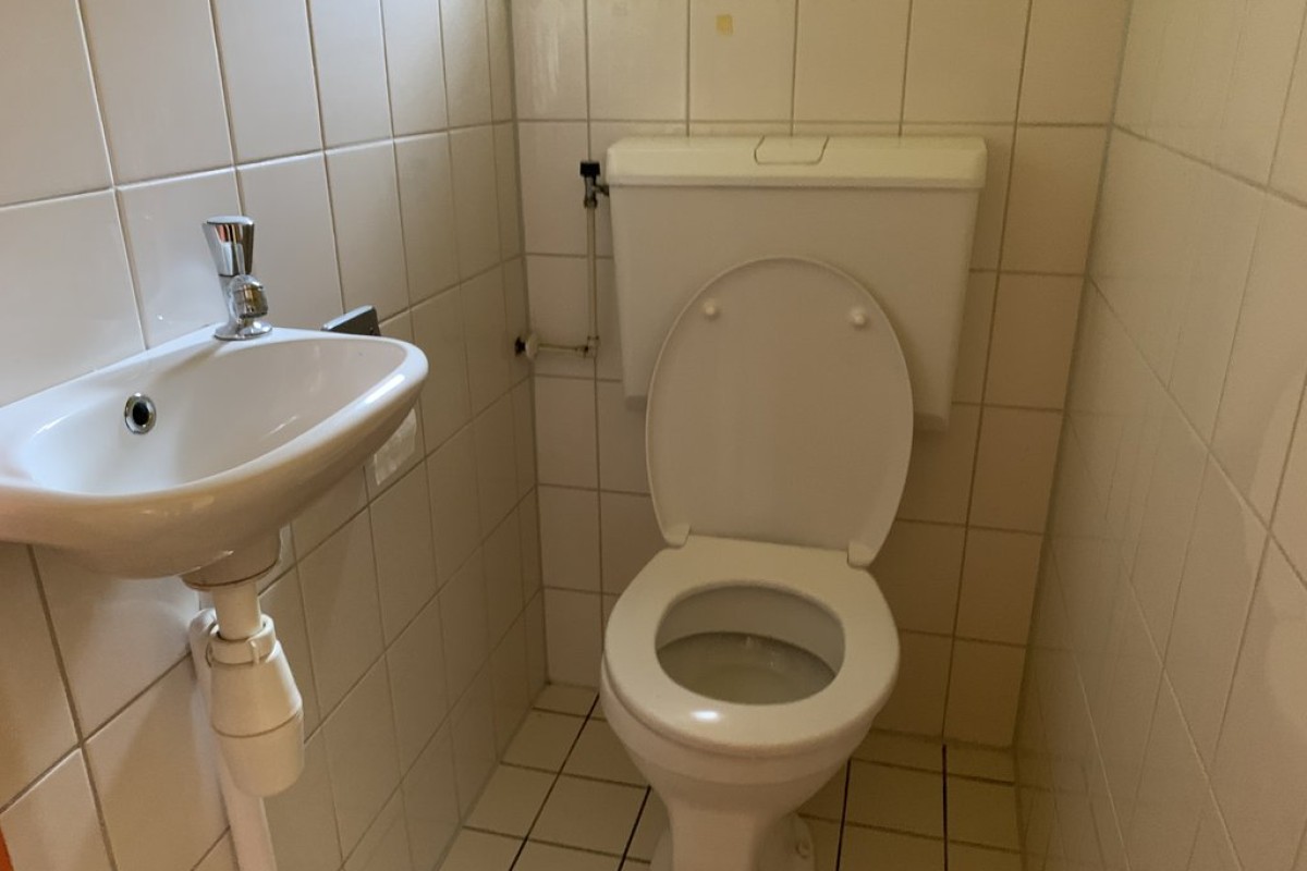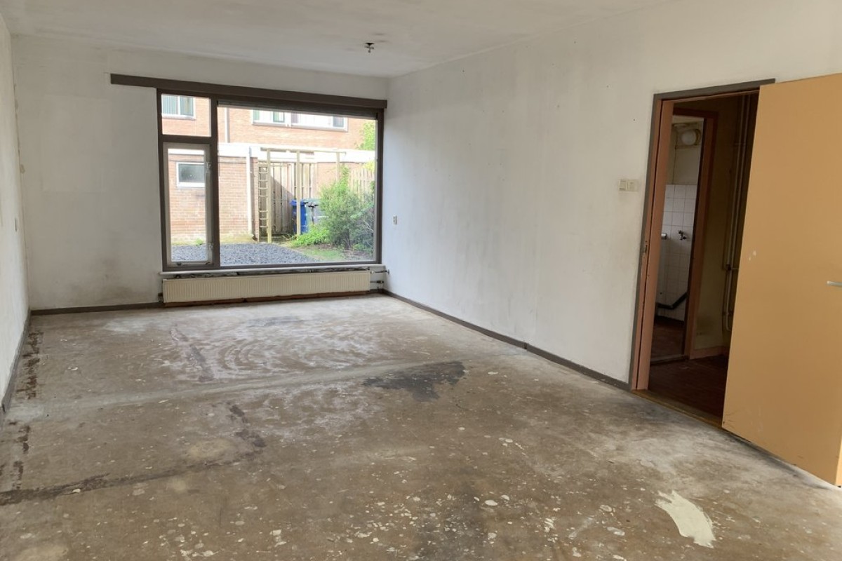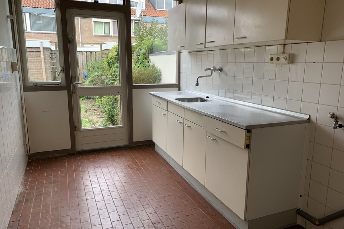 Tochtportaal, gang, toilet met fontein, meterkast, ruime doorzon woonkamer, dichte keuken voorzien van eenvoudig keukenblok en deur naar achtertuin.