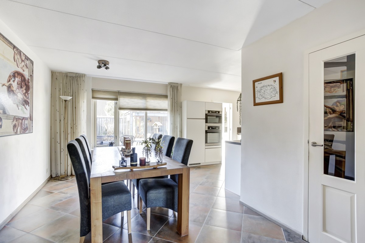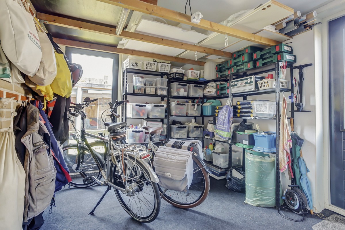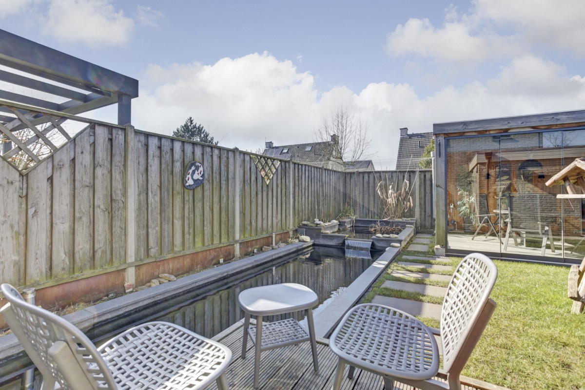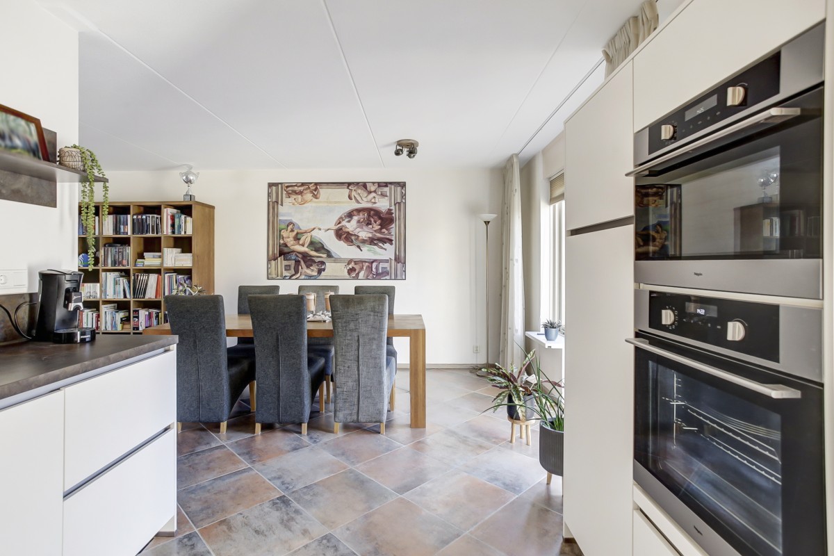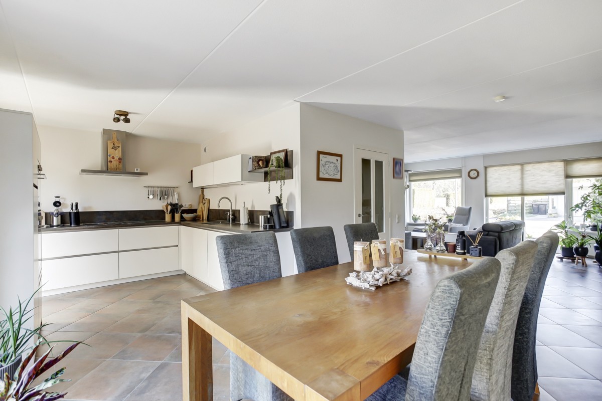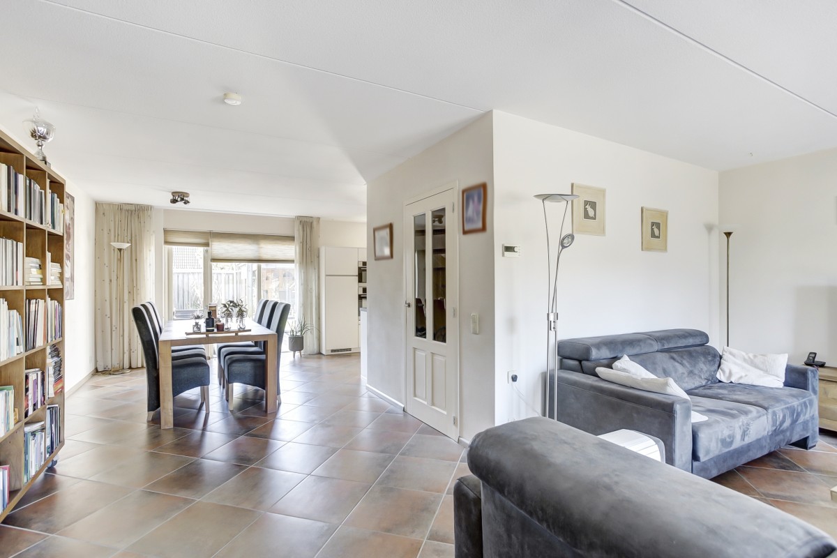 Begane grond: overdekte entree, hal met uitgebreide vernieuwde meterkast, garderobe, licht betegelde toiletruimte met hangcloset en fonteintje, trapopgang en doorgang naar de aangebouwde werkkamer op de begane grond. De straatgerichte woonkamer is voorzien van een moderne tegelvloer met vloerverwarming. Aan de achterzijde is een ruime eethoek met uitzicht op de tuin gesitueerd. Aansluitend is de vernieuwde moderne keuken in een hoek opgesteld. De keuken beschikt over korflades, een groot werkblad en een ingebouwde koelkast, vaatwasser, stoomoven, Quooker en inductiekookplaat met afzuiging. De aangrenzende bijkeuken is eveneens voorzien van een extra gedeelte van de keuken waar een extra koelkast met vrieskast ingebouwd zijn. In de bijkeuken is ook de wasmachine opgesteld. Binnendoor is de aangebouwde fietsenberging bereikbaar. Vanuit de bijkeuken en berging is de achtertuin bereikbaar. De achtertuin is mooi aangelegd en voorzien van een diepe heldere vijver met filtersysteem alsmede een grote vrijstaande houten schuur met overkapping. Middels glazen schuifdeuren is de overkapping afsluitbaar als een heuse winterkamer.