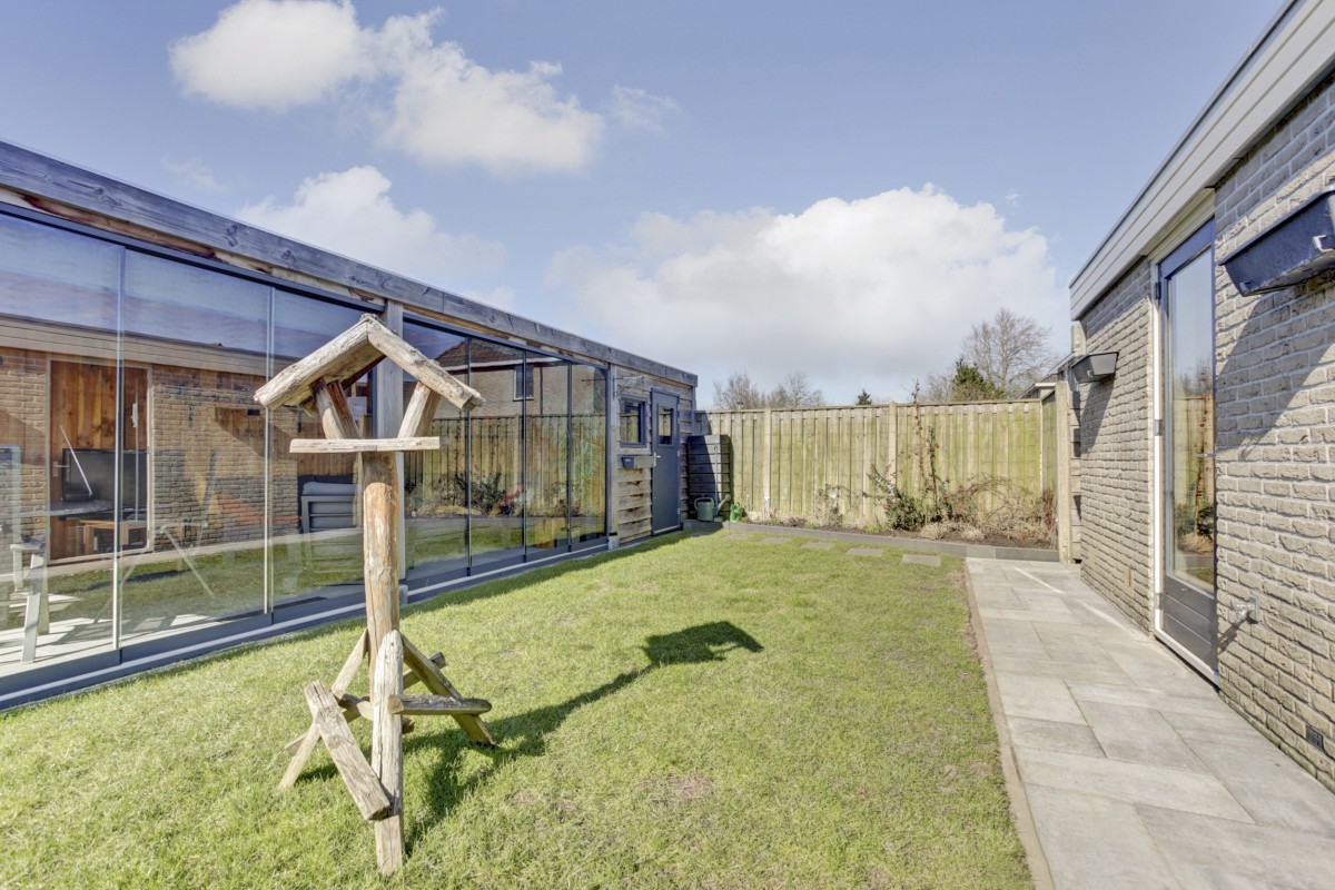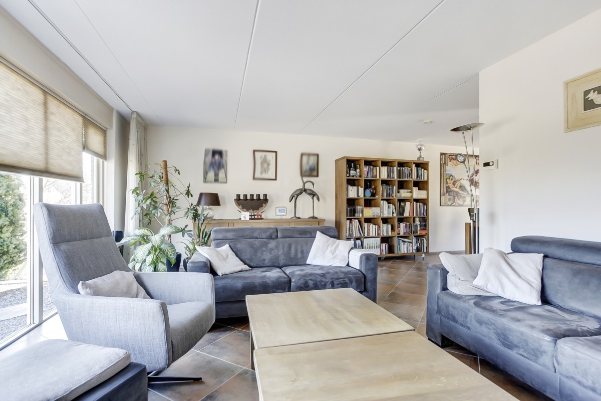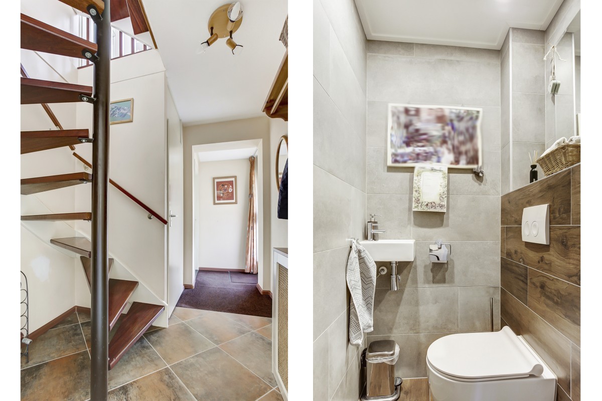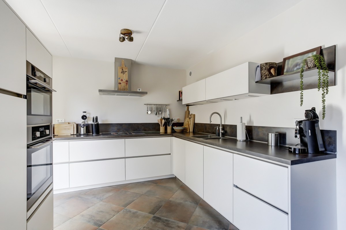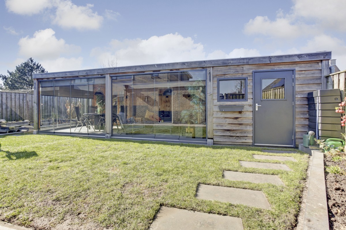 Begane grond: overdekte entree, hal met uitgebreide vernieuwde meterkast, garderobe, licht betegelde toiletruimte met hangcloset en fonteintje, trapopgang en doorgang naar de aangebouwde werkkamer op de begane grond. De straatgerichte woonkamer is voorzien van een moderne tegelvloer met vloerverwarming. Aan de achterzijde is een ruime eethoek met uitzicht op de tuin gesitueerd. Aansluitend is de vernieuwde moderne keuken in een hoek opgesteld. De keuken beschikt over korflades, een groot werkblad en een ingebouwde koelkast, vaatwasser, stoomoven, Quooker en inductiekookplaat met afzuiging. De aangrenzende bijkeuken is eveneens voorzien van een extra gedeelte van de keuken waar een extra koelkast met vrieskast ingebouwd zijn. In de bijkeuken is ook de wasmachine opgesteld. Binnendoor is de aangebouwde fietsenberging bereikbaar. Vanuit de bijkeuken en berging is de achtertuin bereikbaar. De achtertuin is mooi aangelegd en voorzien van een diepe heldere vijver met filtersysteem alsmede een grote vrijstaande houten schuur met overkapping. Middels glazen schuifdeuren is de overkapping afsluitbaar als een heuse winterkamer.