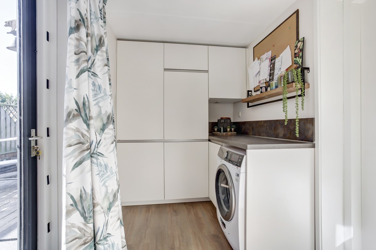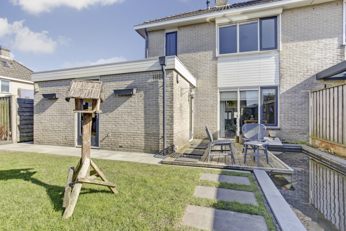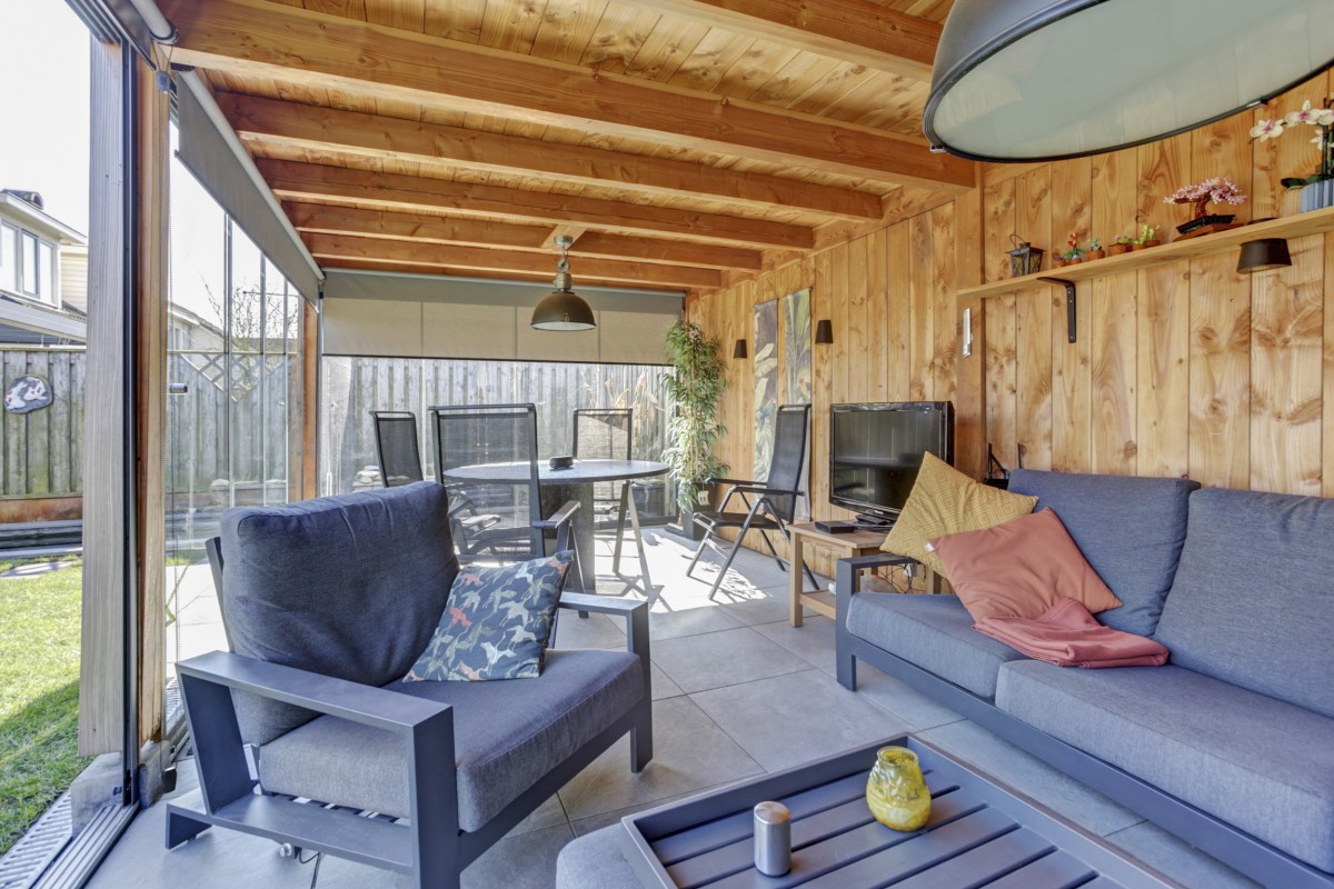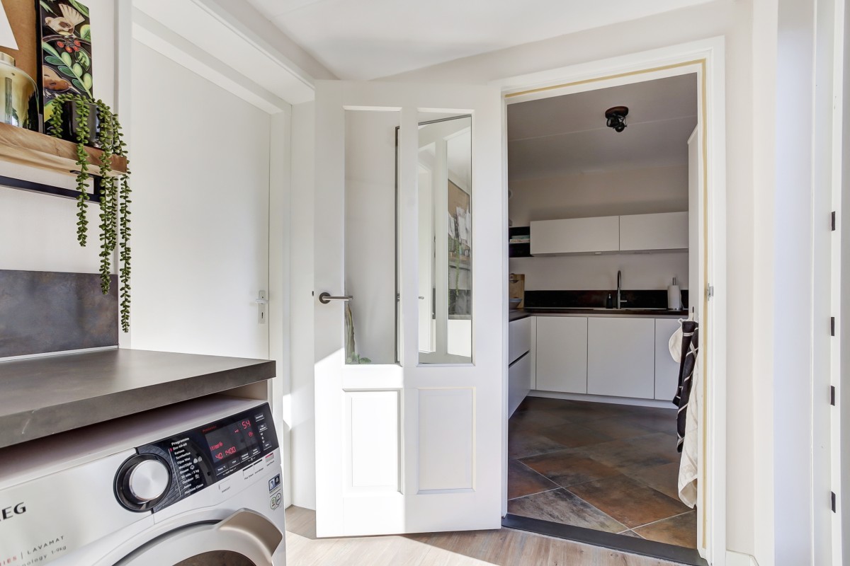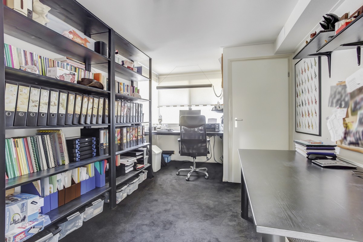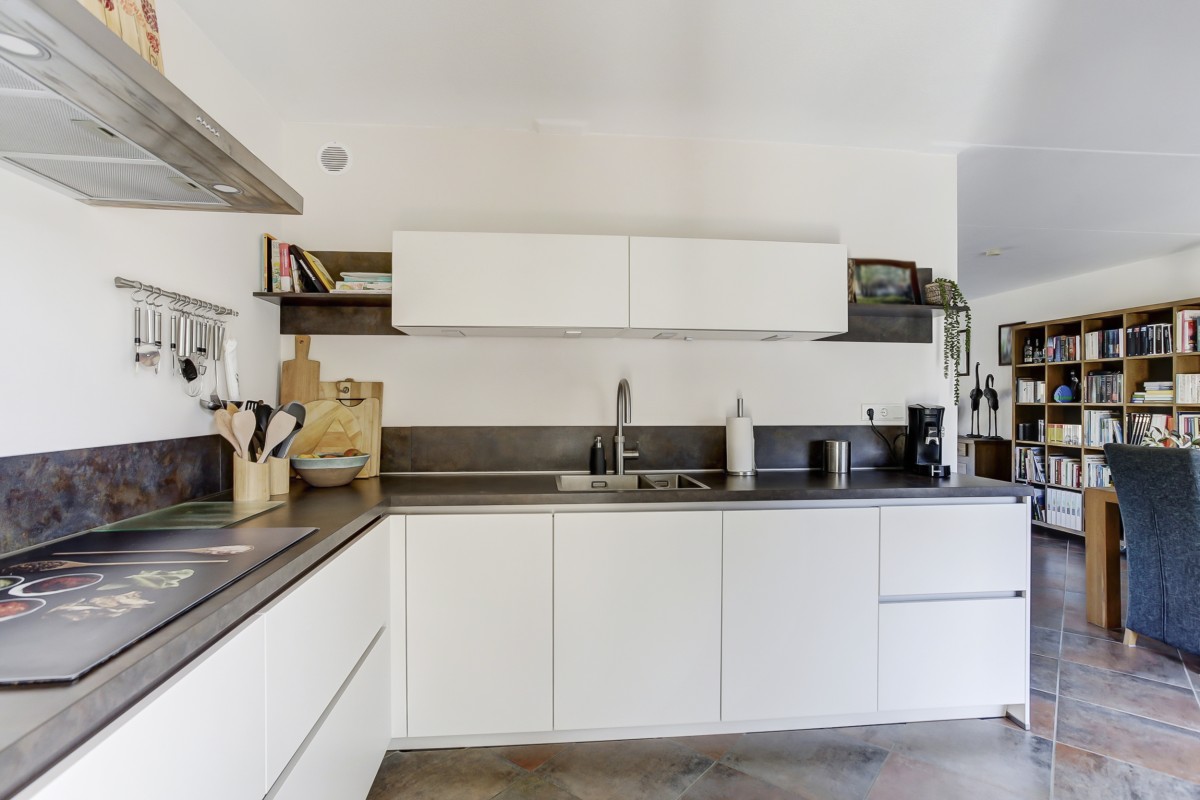 Begane grond: overdekte entree, hal met uitgebreide vernieuwde meterkast, garderobe, licht betegelde toiletruimte met hangcloset en fonteintje, trapopgang en doorgang naar de aangebouwde werkkamer op de begane grond. De straatgerichte woonkamer is voorzien van een moderne tegelvloer met vloerverwarming. Aan de achterzijde is een ruime eethoek met uitzicht op de tuin gesitueerd. Aansluitend is de vernieuwde moderne keuken in een hoek opgesteld. De keuken beschikt over korflades, een groot werkblad en een ingebouwde koelkast, vaatwasser, stoomoven, Quooker en inductiekookplaat met afzuiging. De aangrenzende bijkeuken is eveneens voorzien van een extra gedeelte van de keuken waar een extra koelkast met vrieskast ingebouwd zijn. In de bijkeuken is ook de wasmachine opgesteld. Binnendoor is de aangebouwde fietsenberging bereikbaar. Vanuit de bijkeuken en berging is de achtertuin bereikbaar. De achtertuin is mooi aangelegd en voorzien van een diepe heldere vijver met filtersysteem alsmede een grote vrijstaande houten schuur met overkapping. Middels glazen schuifdeuren is de overkapping afsluitbaar als een heuse winterkamer.