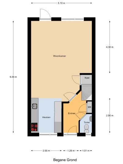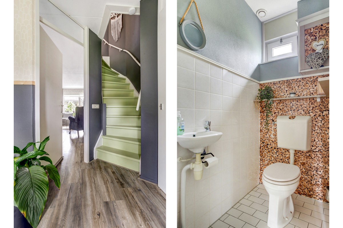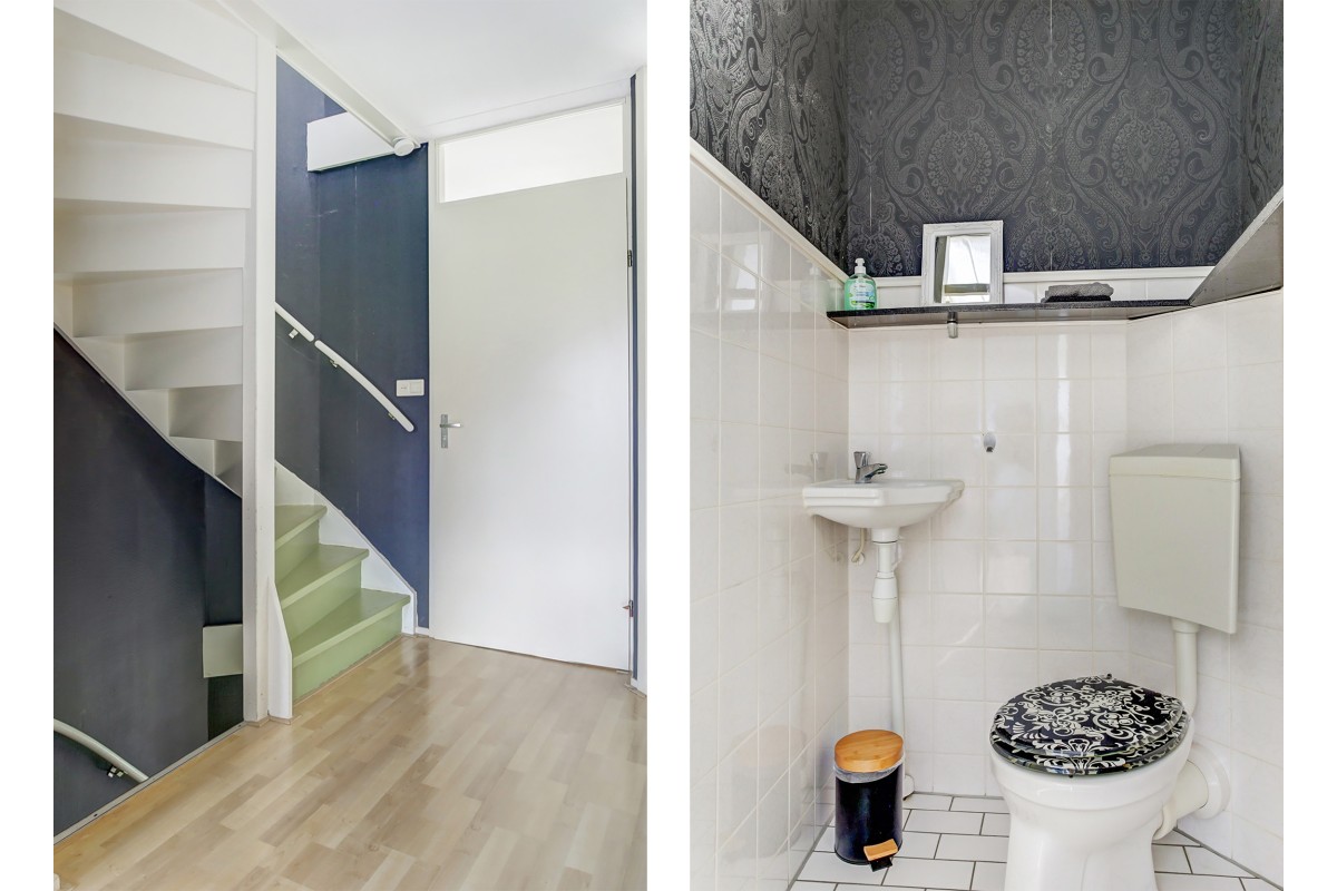 Begane grond: entree, hal met meterkast, lichte toiletruimte met toilet en wastafel, trapopgang en doorgang naar de woonkamer.