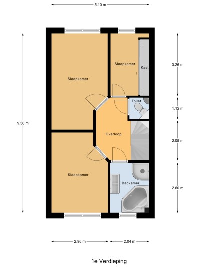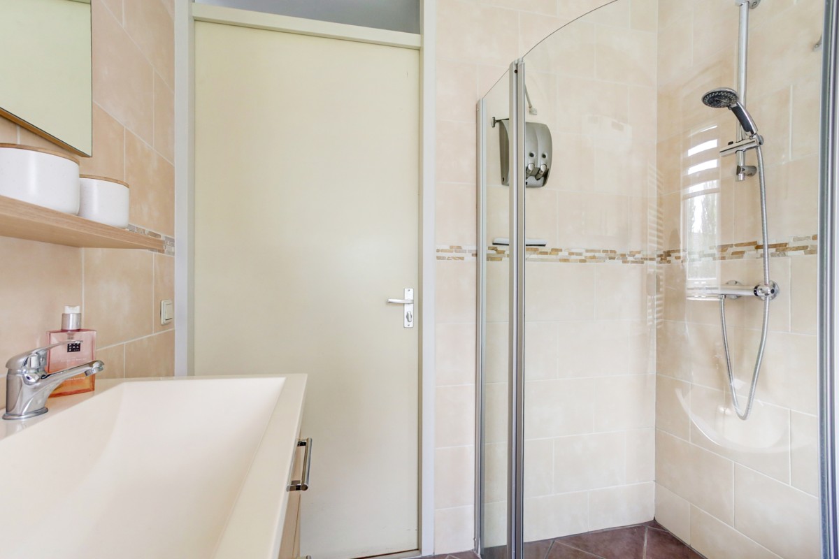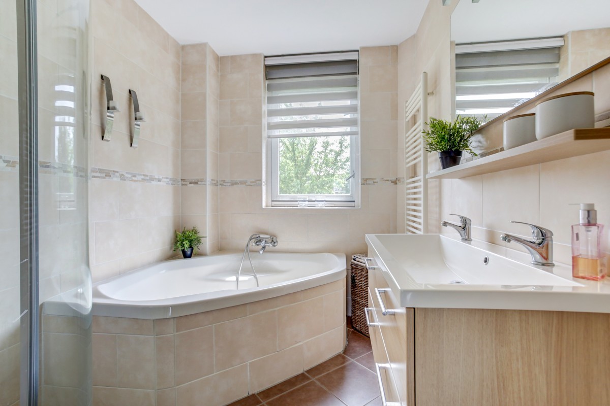 Eerste verdieping: royale overloop met aansluitend drie goede slaapkamers, de badkamer en een separate toiletruimte. De moderne badkamer beschikt over een ligbad, een douche met cabine, designradiator en een wastafel met meubel. Aan de overloop is een separate toiletruimte gesitueerd. De slaapkamers op de eerste etage zijn voorzien van een laminaatvloer en de hoofdslaapkamer is voorzien van een raamhor.