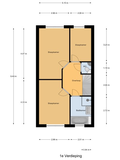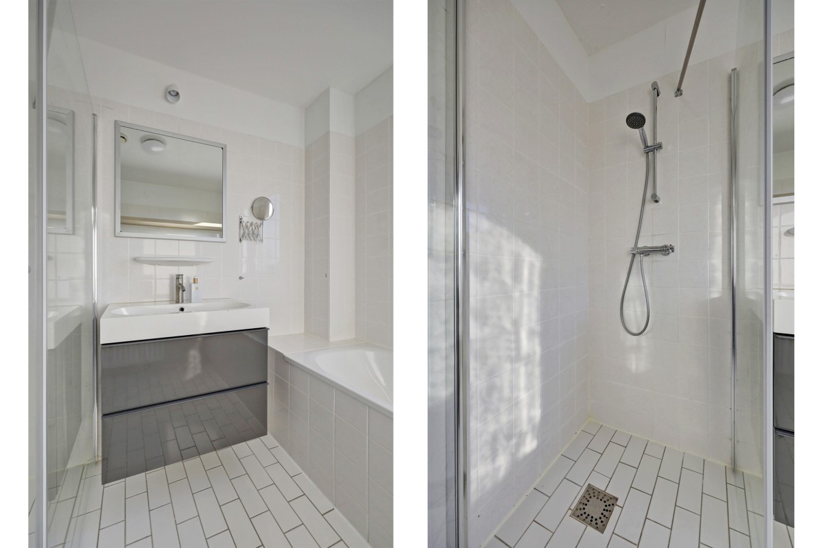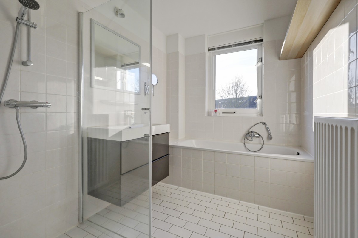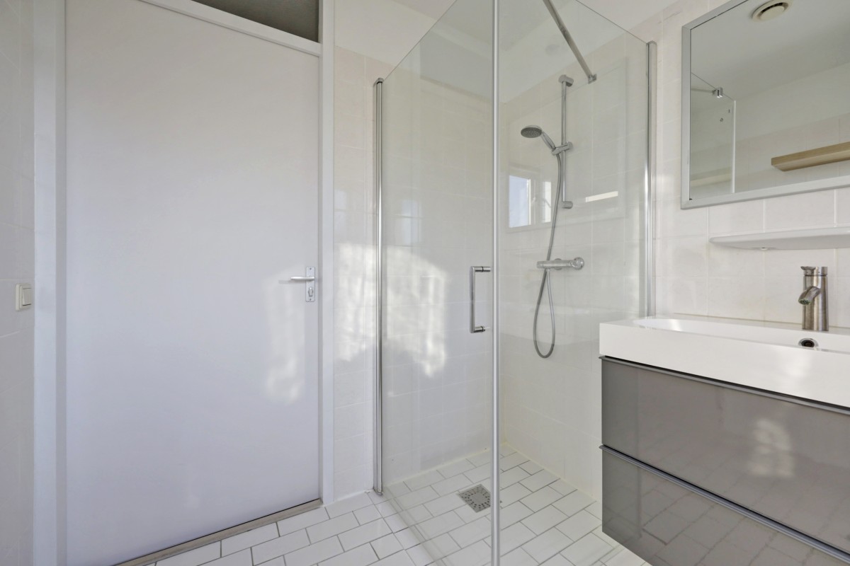Eerste verdieping: royale overloop met aansluitend drie slaapkamers en de badkamer. De grote slaapkamer aan de achterzijde van de woning is, evenals de slaapkamer aan de voorzijde, voorzien van een brede nis geschikt voor een grote kastenwand. De badkamer beschikt over een ligbad, een douche met cabine en een wastafel met meubel. Het geheel is in 2019 gemoderniseerd. Aan de overloop is een separate toiletruimte gesitueerd.