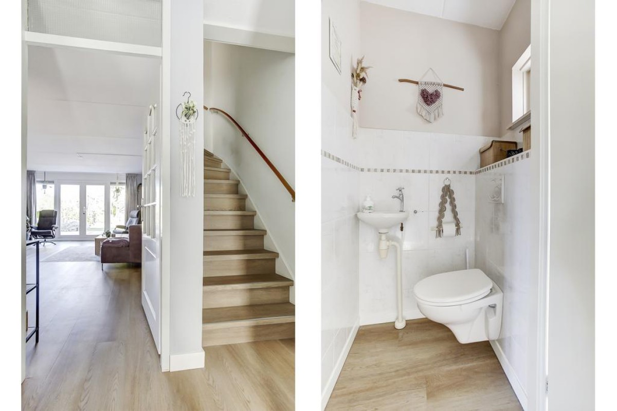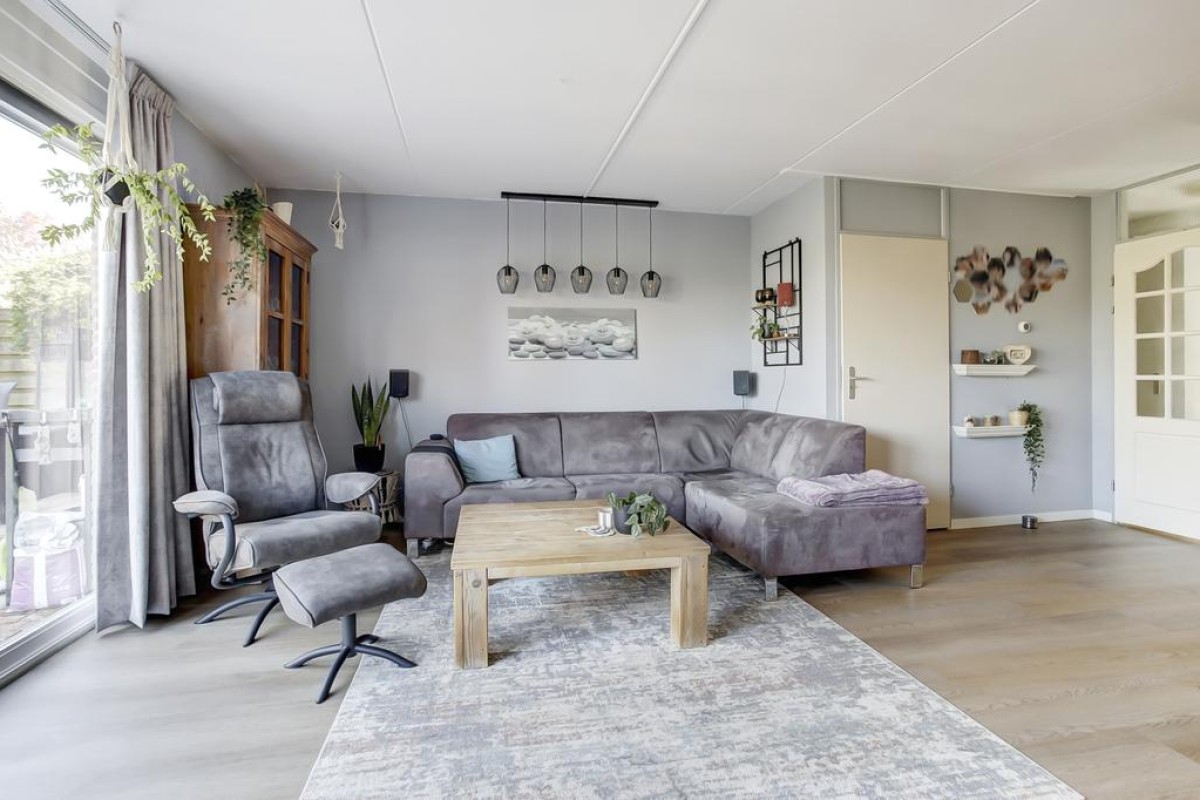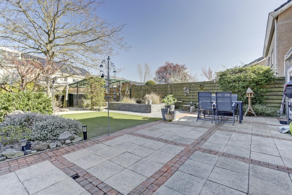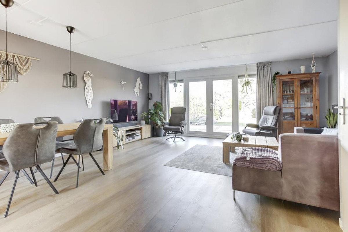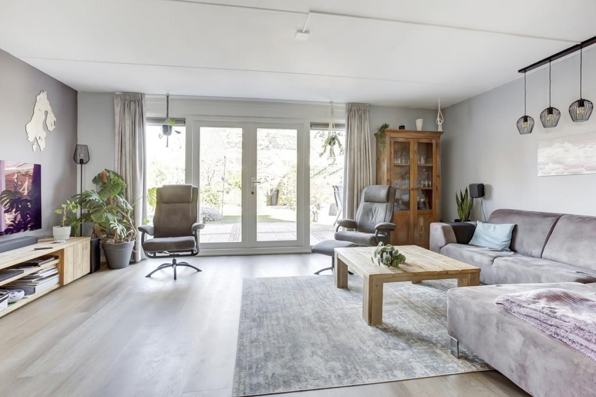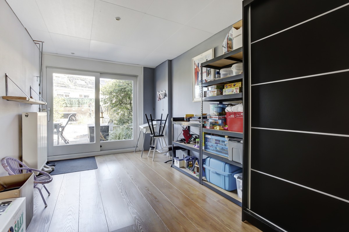 Begane grond: ruime oprit met aangebouwde berging en overdekt entree, hal met garderobe, toiletruimte met hangcloset en fonteintje, uitgebreide meterkast en loopdeur naar de berging waar tevens de wasmachine en droger staan opgesteld. Deze binnendoor bereikbare berging biedt ruimte voor o.a. de fietsen en heeft aan de achterzijde een doorloop naar een prachtige multifunctionele kamer met een schuifpui naar de achtertuin. Vanuit de hal is tevens de tuingerichte woonkamer bereikbaar welke beschikt over een mooie moderne PVC-vloer met vloerverwarming en openslaande deuren naar de achtertuin. Aan de voorzijde van de woning is een ruime hoek opgestelde keuken gesitueerd welke voorzien is van veel kastruimte, een groot werkblad en een ingebouwde vaatwasser, keramisch kookplaat met afzuigkap, combimagnetron en losse koel-/vrieskast. De tuin is bereikbaar vanuit de opslaande deuren van de woonkamer en middels een schuifpui vanuit de multifunctionele kamer. De diepe en brede achtertuin heeft een zonneterras tegen de achtergevel en een groot zoneterras achter in de tuin. De tuin is tevens langs de woning bereikbaar en voorzien van een extra berging naast de woning.