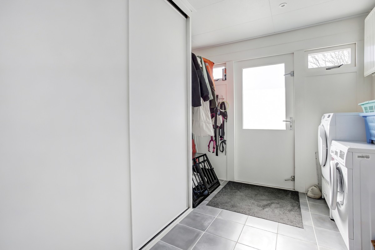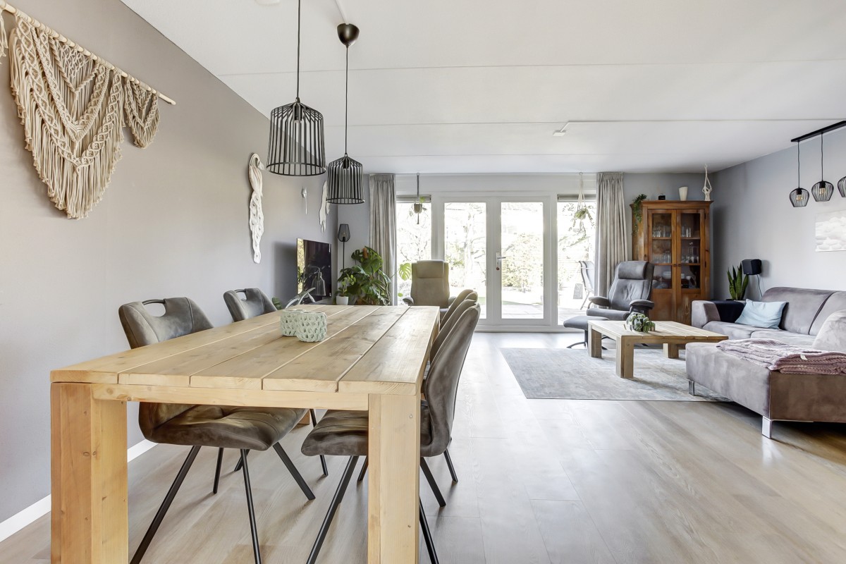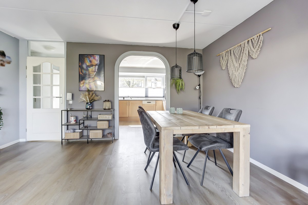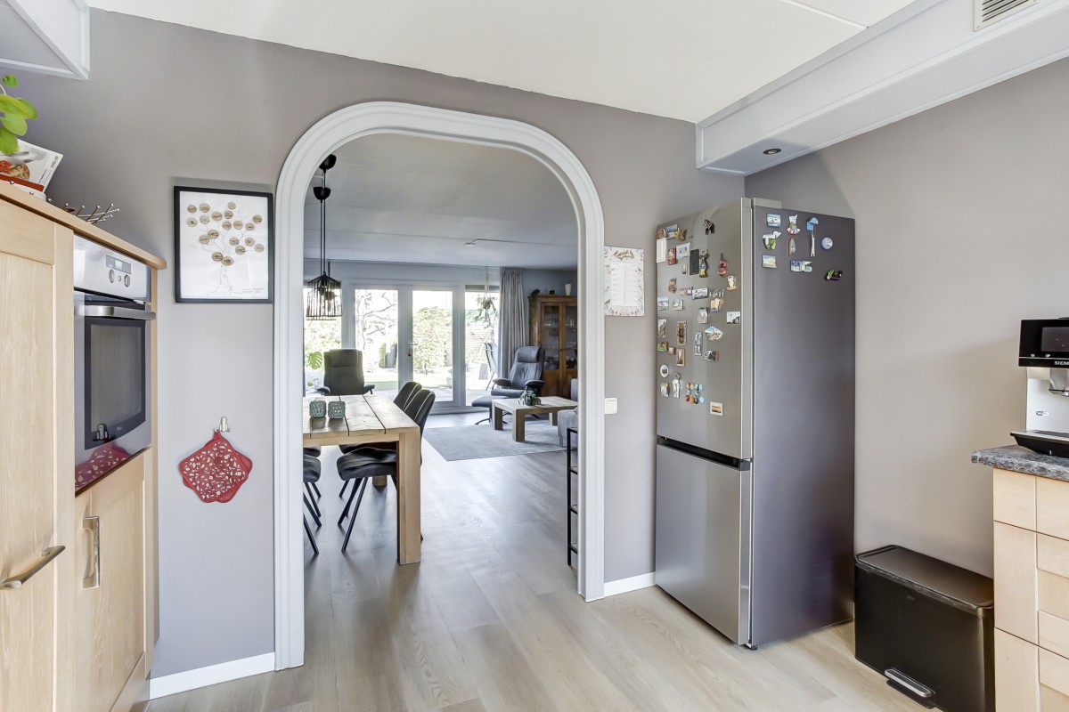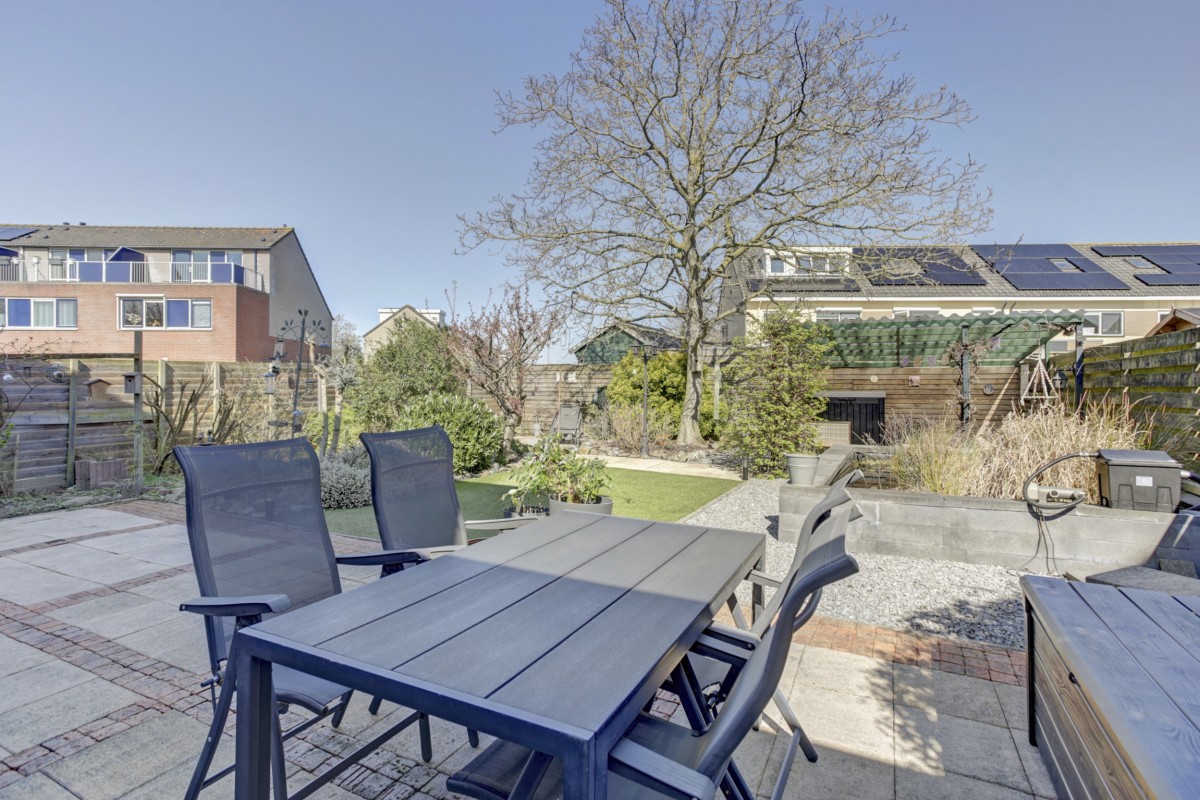 Begane grond: ruime oprit met aangebouwde berging en overdekt entree, hal met garderobe, toiletruimte met hangcloset en fonteintje, uitgebreide meterkast en loopdeur naar de berging waar tevens de wasmachine en droger staan opgesteld. Deze binnendoor bereikbare berging biedt ruimte voor o.a. de fietsen en heeft aan de achterzijde een doorloop naar een prachtige multifunctionele kamer met een schuifpui naar de achtertuin. Vanuit de hal is tevens de tuingerichte woonkamer bereikbaar welke beschikt over een mooie moderne PVC-vloer met vloerverwarming en openslaande deuren naar de achtertuin. Aan de voorzijde van de woning is een ruime hoek opgestelde keuken gesitueerd welke voorzien is van veel kastruimte, een groot werkblad en een ingebouwde vaatwasser, keramisch kookplaat met afzuigkap, combimagnetron en losse koel-/vrieskast. De tuin is bereikbaar vanuit de opslaande deuren van de woonkamer en middels een schuifpui vanuit de multifunctionele kamer. De diepe en brede achtertuin heeft een zonneterras tegen de achtergevel en een groot zoneterras achter in de tuin. De tuin is tevens langs de woning bereikbaar en voorzien van een extra berging naast de woning.