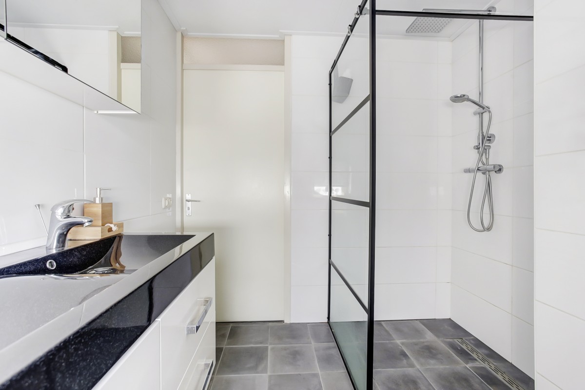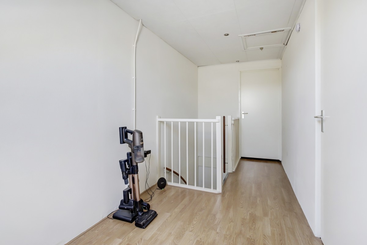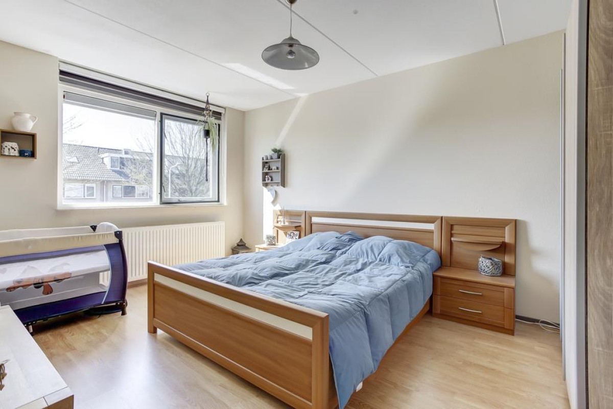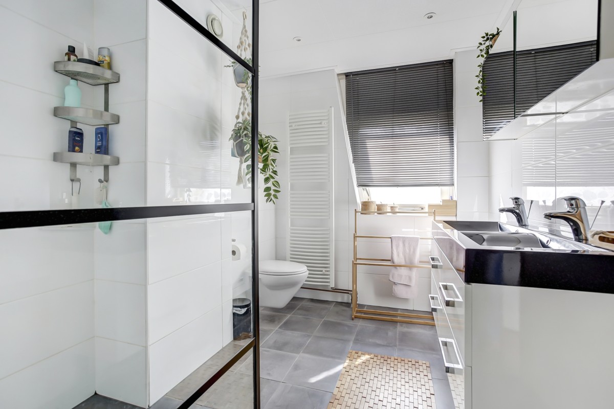 Eerste verdieping: vaste trap naar de overloop met aansluitend een drie slaapkamers en de badkamer. De slaapkamers hebben allen een mooie maatvoering en beschikken net als de overloop over een laminaatvloer. De badkamer heeft een meubel met dubbele wastafel, 2e hangcloset en inloopdouche.
