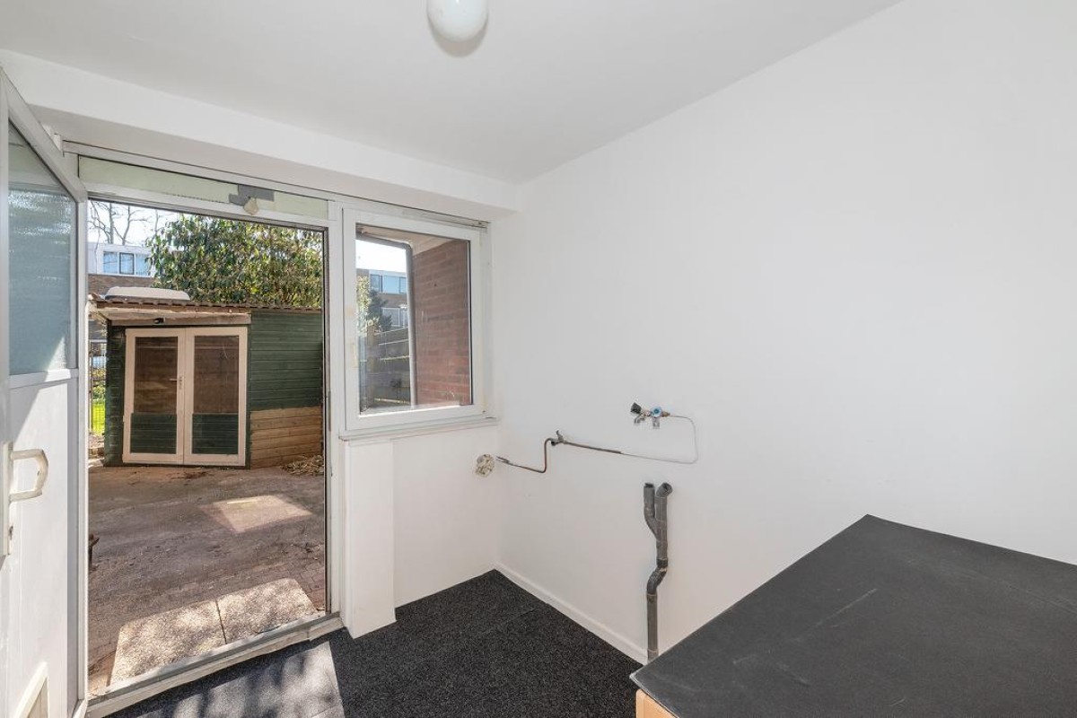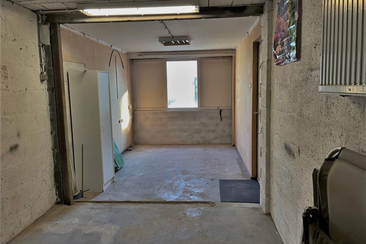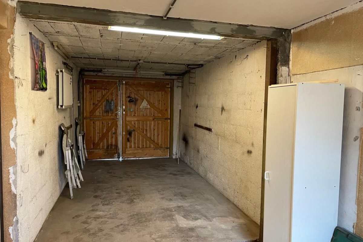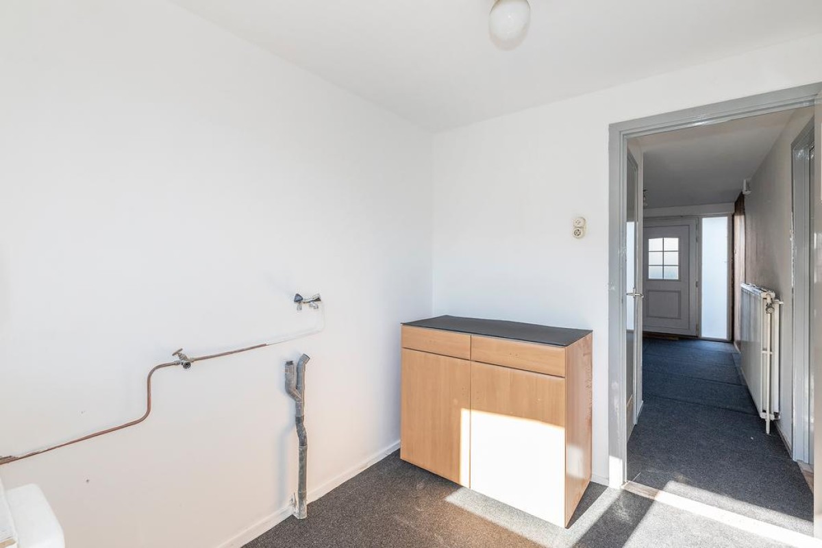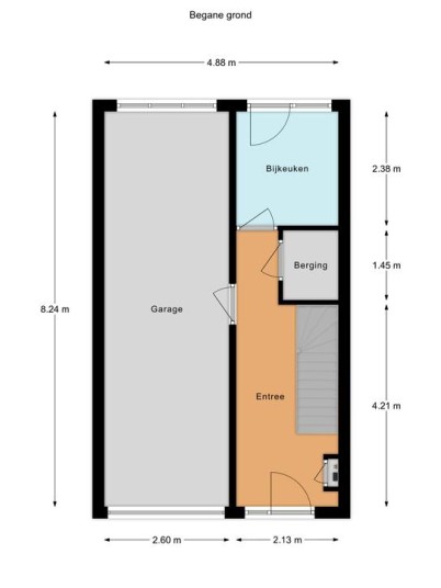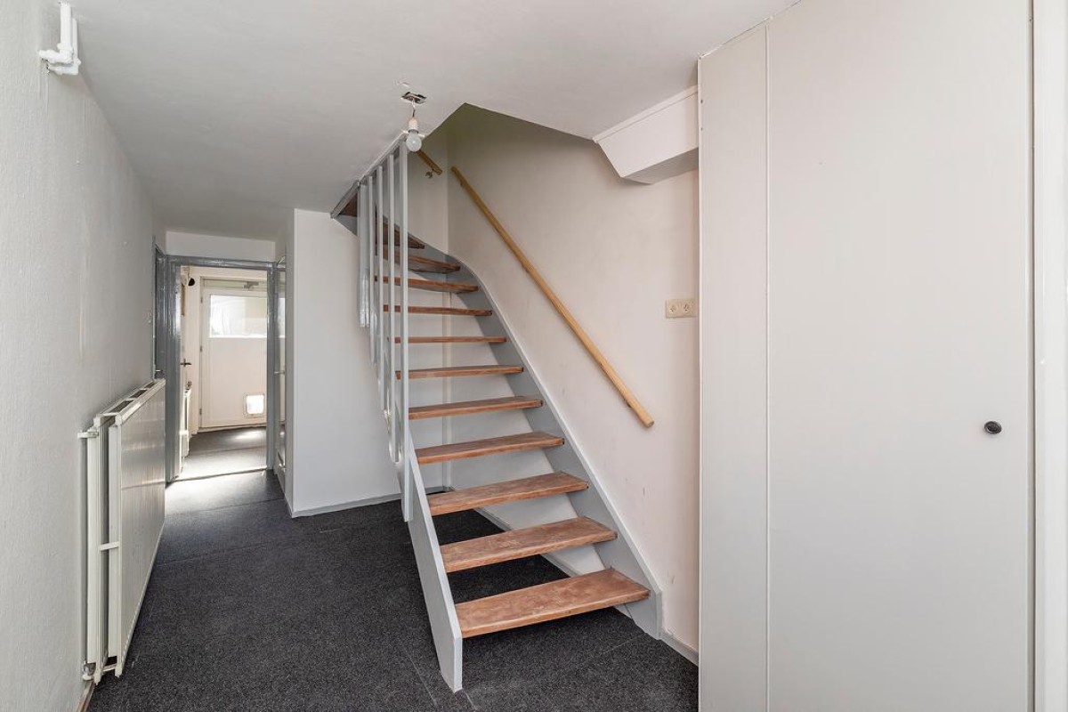 Begane grond: Ruime entree met meterkast, trapkast, een slaap-/werkkamer c.q. bijkeuken met doorgang naar de achtertuin en de zeer royale garage over de gehele diepte van de woning (ruim 8 meter diep!).