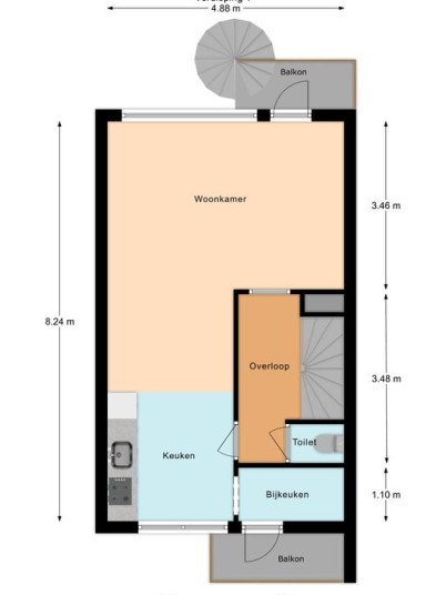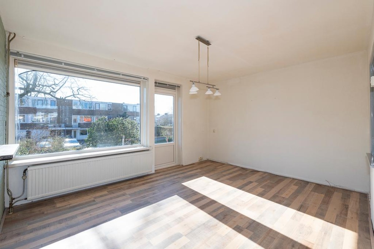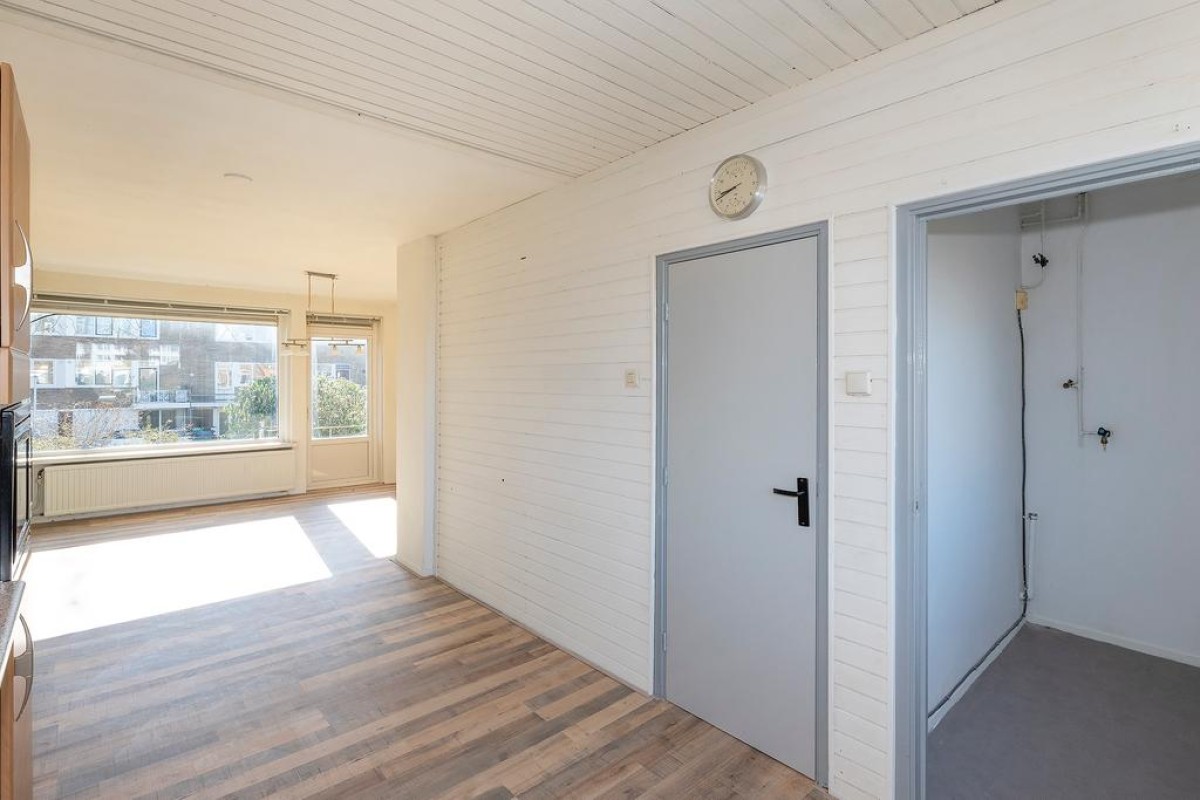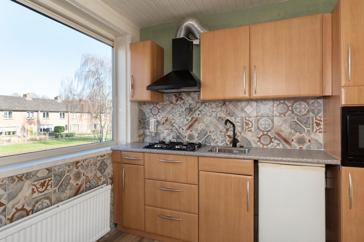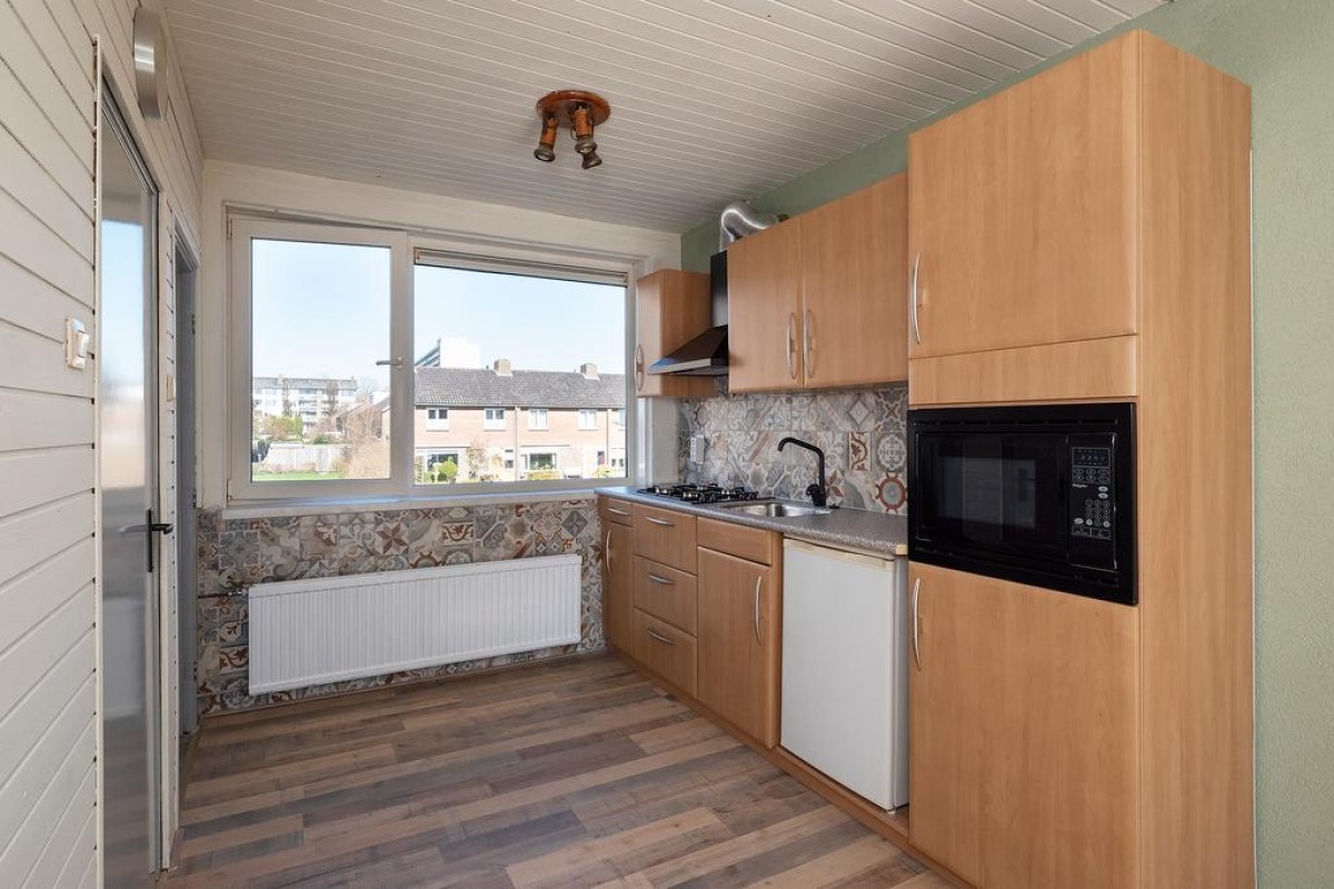 Eerste verdieping: overloop met toilet, woonkamer voorzien van een laminaatvloer met uitzicht op de achtertuin en voorzien van een balkon. Vanaf dit balkon is via een wenteltrap de tuin te bereiken. De keuken is gelegen aan de voorzijde en is voorzien van een gaskookplaat, afzuigkap, koelkast en een combimagnetron. Vanuit de keuken is er via de praktische berging met wasmachineaansluiting toegang tot het balkon aan de voorzijde.