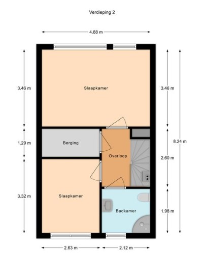 Gaan we naar de 2e verdieping dan zijn daar 2 zeer royale slaapkamers en de badkamer aanwezig. De voormalige badkamer heeft tot voor kort dienst gedaan als inloopkast. De huidige badkamer is voorzien van een douchehoek, een 2e toilet en een wastafel.
