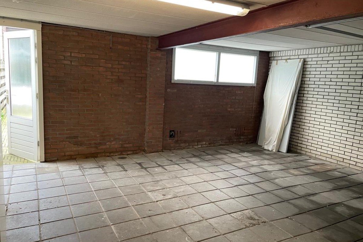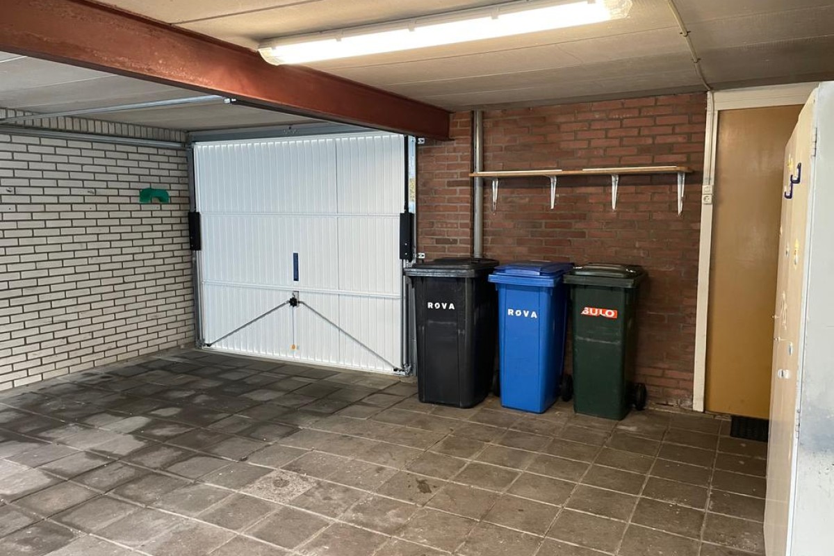 Lees verderAan de achterzijde bevindt zich een bijzonder ruime garage/berging over de gehele breedte met een stalen kanteldeur alsmede een separate loopdeur.