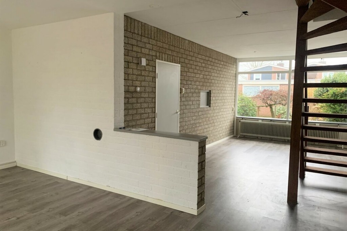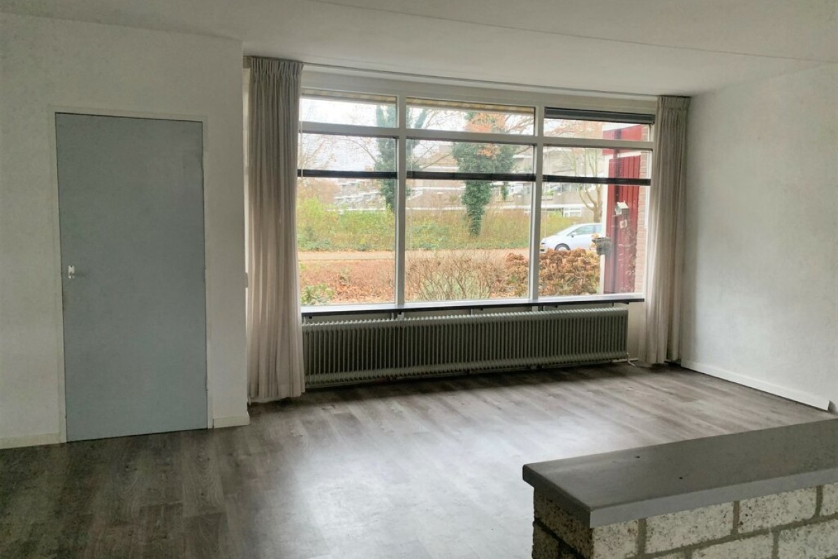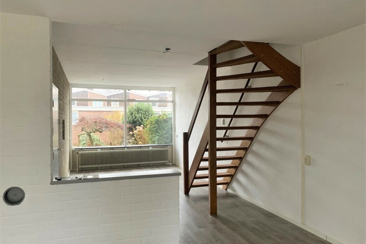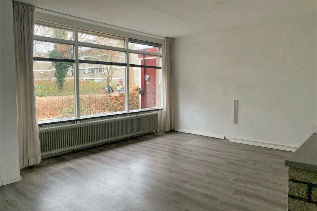 Begane grond: Entree, hal, straatgerichte L-vormige woonkamer, tussenhal met toegang tot toilet, aparte bergkast en de dichte keuken.