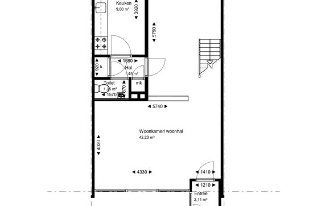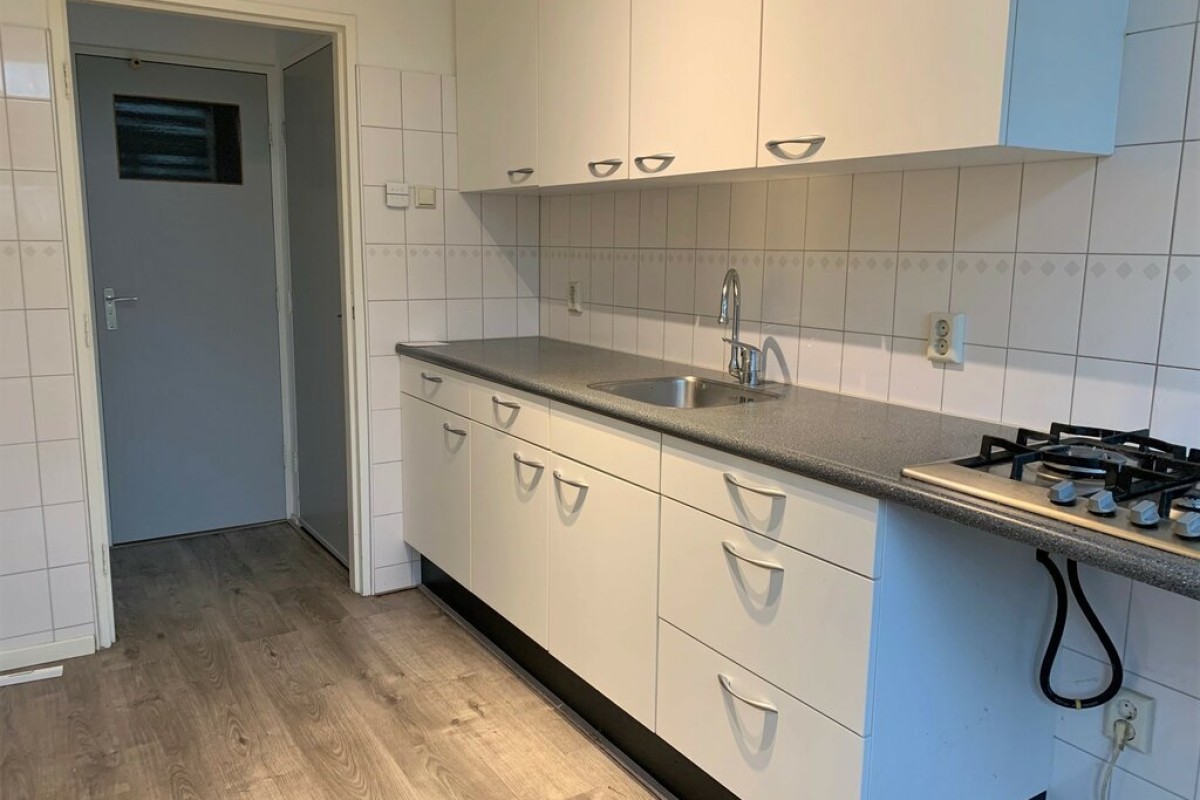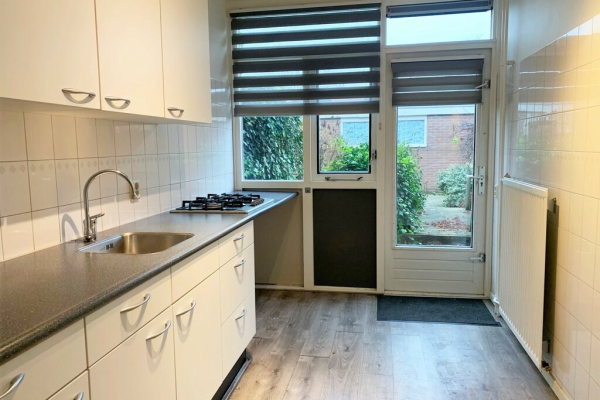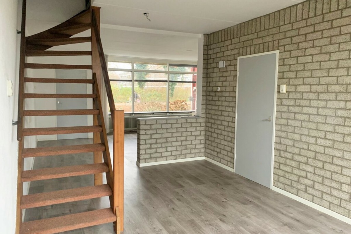 Begane grond: Entree, hal, straatgerichte L-vormige woonkamer, tussenhal met toegang tot toilet, aparte bergkast en de dichte keuken.
