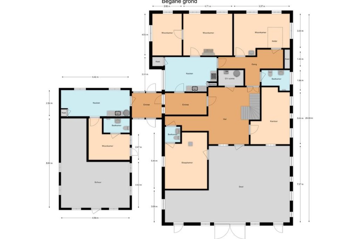 Entree, hal/garderobe, doorgang naar de keuken. De voorzijde van de woning is in gebruik als woonkamer waar meerdere kamers aan elkaar geschakeld zijn, dit kunnen Vanuit de woonkeuken komt u uit op een hal van waar de verschillende slaapkamers bereikbaar zijn alsmede de badkamer . Vanuit deze hal is de voormalige deel bereikbaar welke waarschijnlijk bestemd zal gaan worden als woonkamer. Deze is dan ook nog volledig naar uw eigen stijl te realiseren.