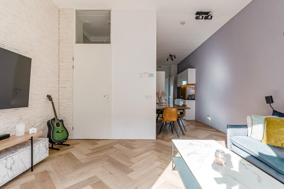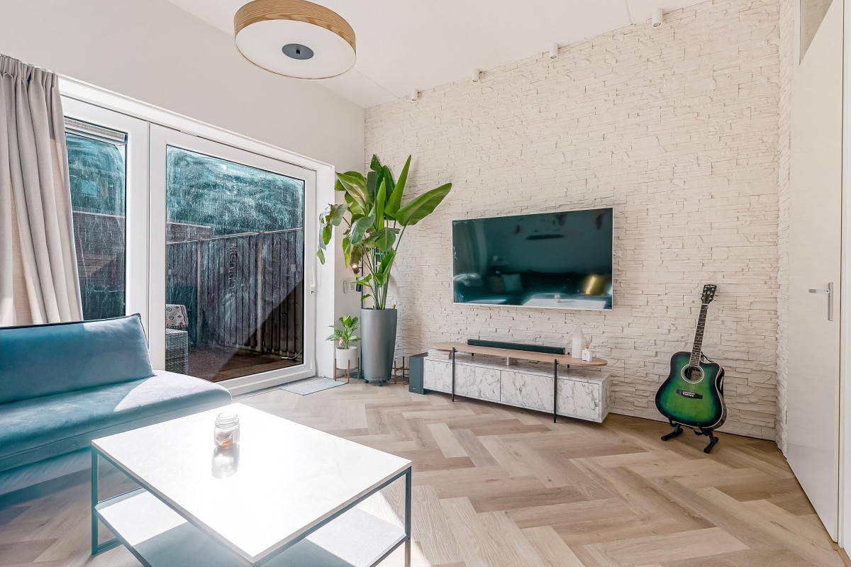 Aan de achterzijde bevindt zich de ruime en lichte woonkamer. Door het hoge plafond voelt deze nog ruimtelijker aan. De vloer is afgewerkt met een stijlvolle visgraat PVC-vloer, en de wanden zijn strak gestuct.