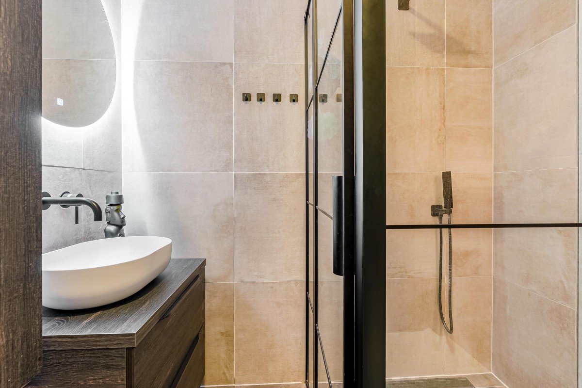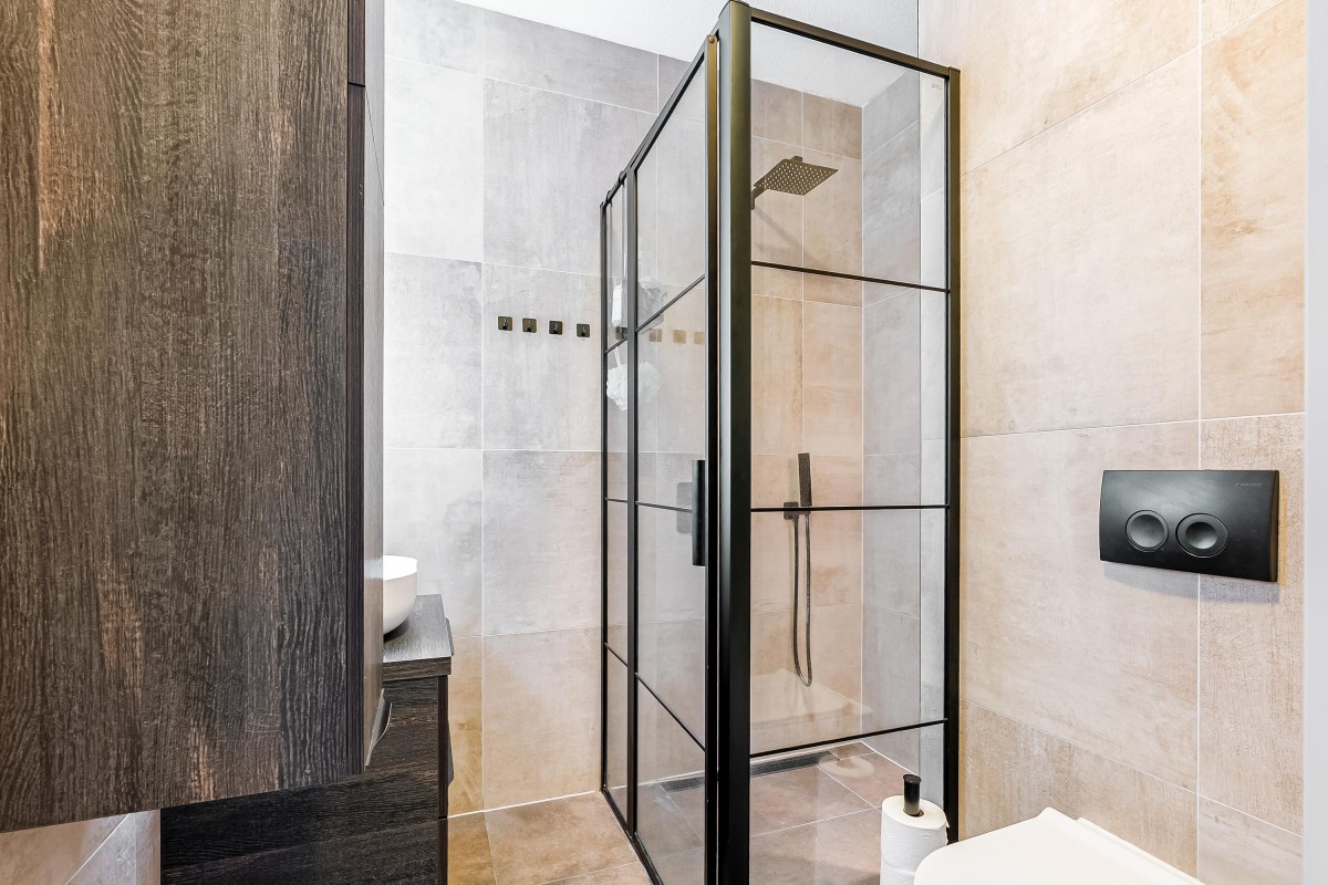 De moderne badkamer is praktisch ingericht en voorzien van een tweede toilet, wastafelmeubel en inloopdouche. De ruimte is volledig betegeld tot aan het plafond.