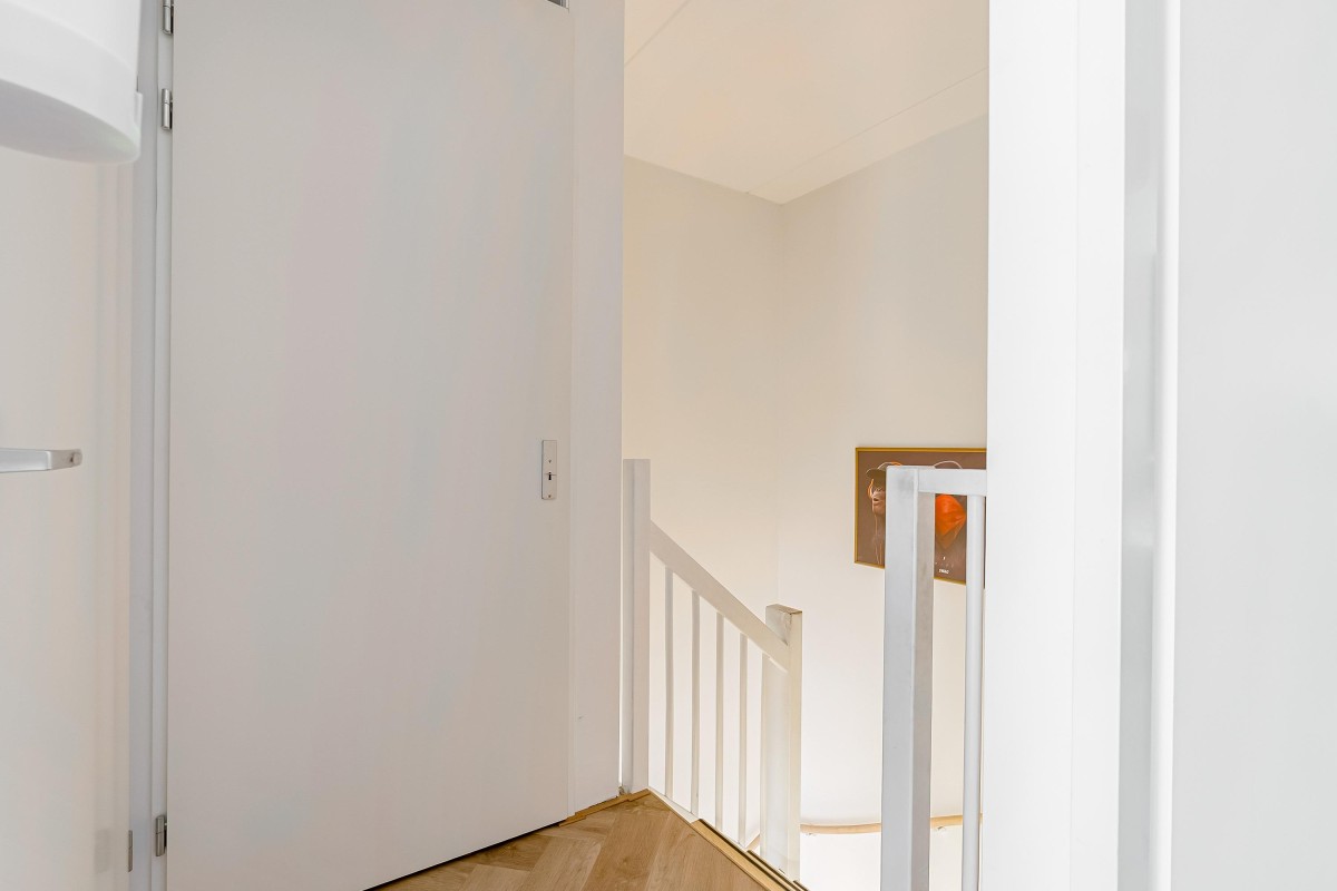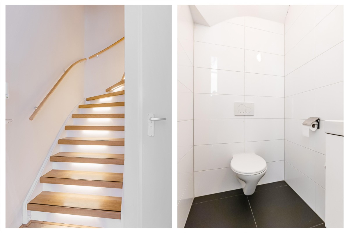 Naast de woonkamer bevindt zich een extra hal met het toilet en de trap naar de eerste verdieping. De trap is recent vernieuwd (2023) en voorzien van sfeervolle ingebouwde verlichting.