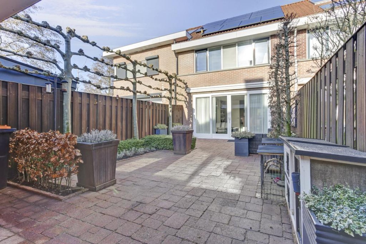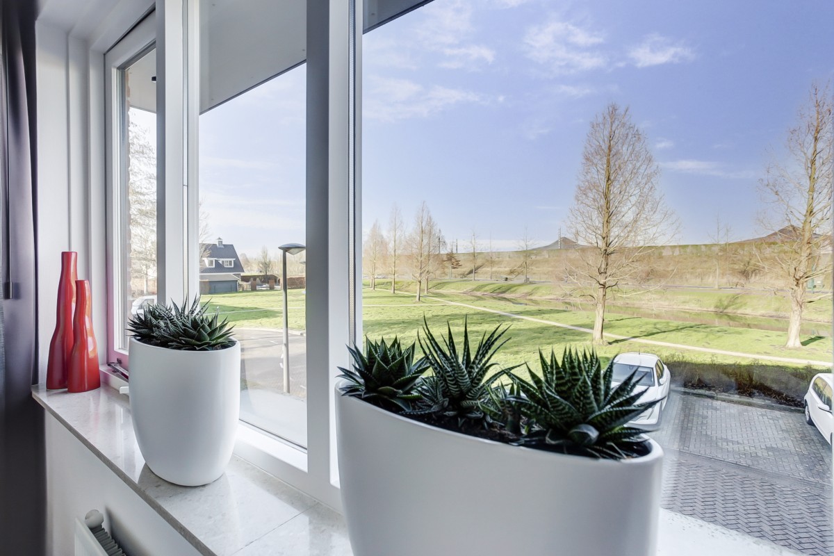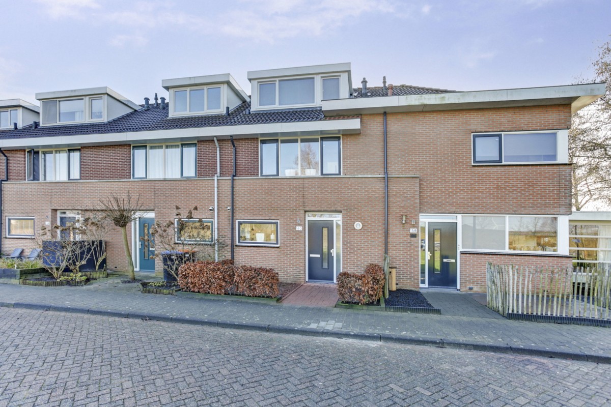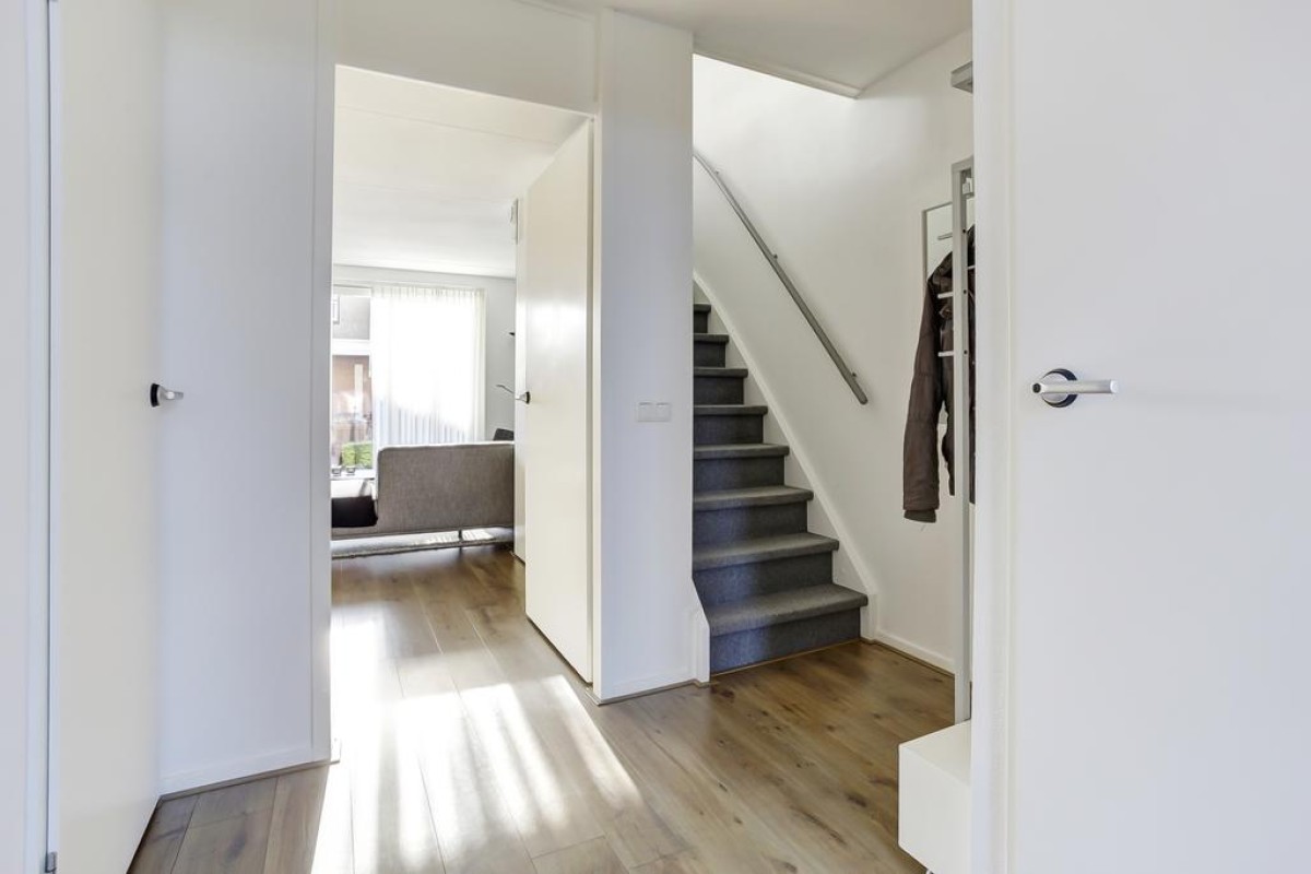 Begane grond: entree, hal met garderobe, lichte toiletruimte met toilet en fonteintje, uitgebreide meterkast, trapopgang naar de verdieping en doorgang naar de woonkamer. De woonkamer is tuingericht en beschikt over een provisiekast onder de trap alsmede een laminaatvloer. De achtergevel bestaat uit een brede schuifpui met met glas tot aan de grond over de maximale breedte van de achtergevel. Hierdoor is de woonkamer heerlijk licht en geeft uitzicht op de fraai aangelegde tuin op het zuiden. Aan de voorzijde van de woning is de hoekopgestelde keuken met veel werkblad gesitueerd. De keuken is in lichte kleurstelling uitgevoerd en is voorzien van een ingebouwde koelkast, gaskookplaat, afzuigkap, combi-magnetron en vaatwasser. Het keukenraam geeft vrij uitzicht over groen en water. De tuin is mooi onderhoudsarm aangelegd. Achterin de tuin is een achterom langs de vrijstaande stenen berging aanwezig. De berging heeft een betonvloer en overkapping.