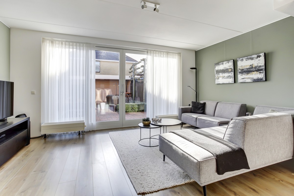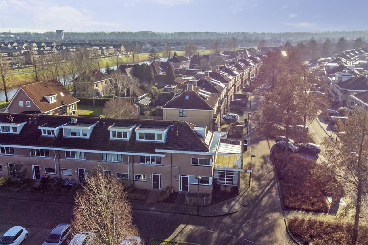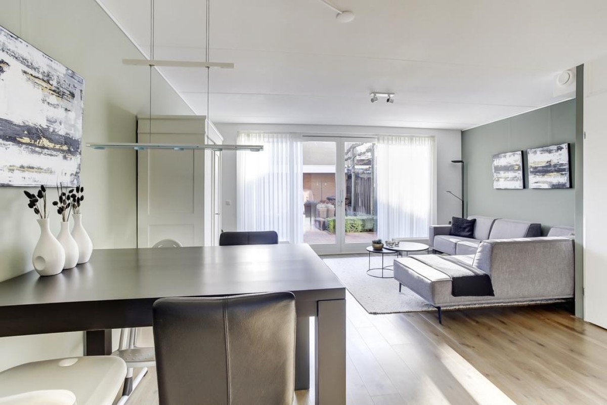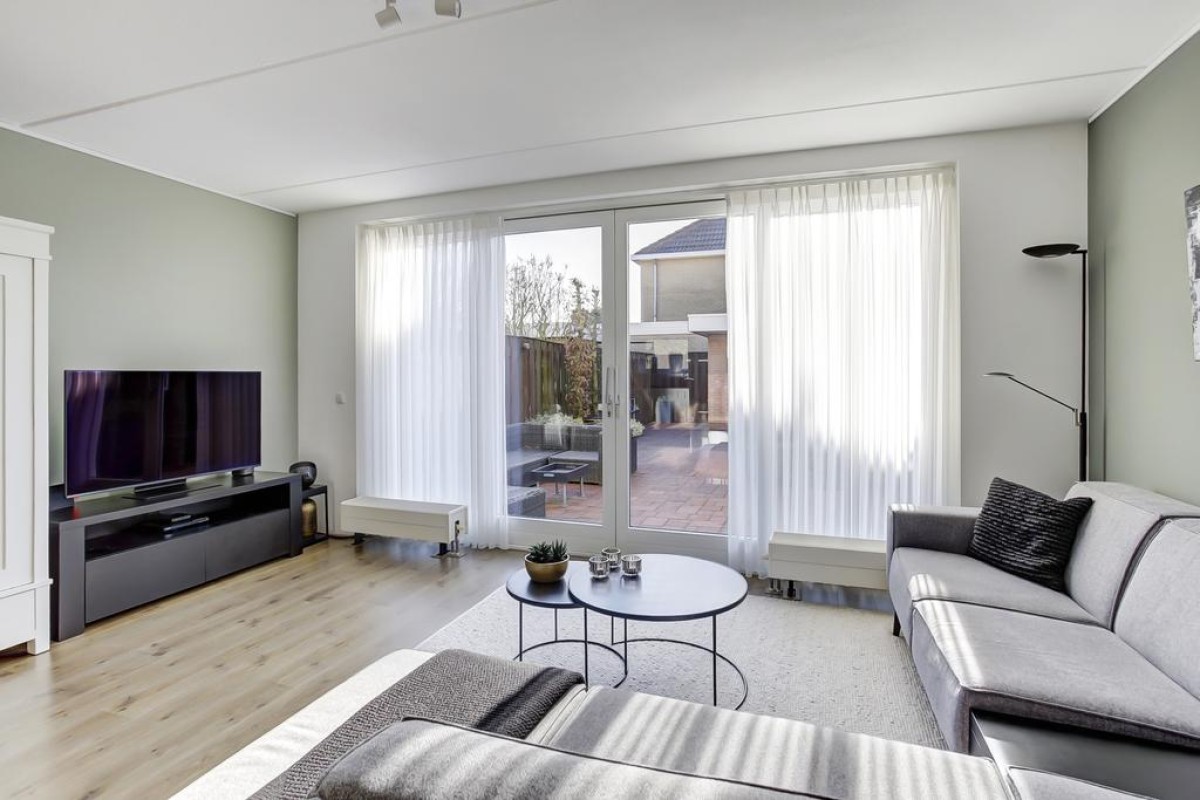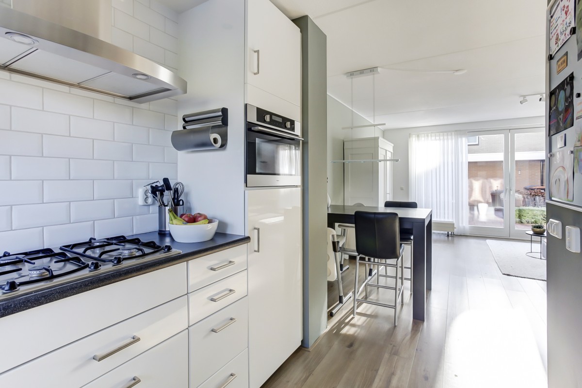 Begane grond: entree, hal met garderobe, lichte toiletruimte met toilet en fonteintje, uitgebreide meterkast, trapopgang naar de verdieping en doorgang naar de woonkamer. De woonkamer is tuingericht en beschikt over een provisiekast onder de trap alsmede een laminaatvloer. De achtergevel bestaat uit een brede schuifpui met met glas tot aan de grond over de maximale breedte van de achtergevel. Hierdoor is de woonkamer heerlijk licht en geeft uitzicht op de fraai aangelegde tuin op het zuiden. Aan de voorzijde van de woning is de hoekopgestelde keuken met veel werkblad gesitueerd. De keuken is in lichte kleurstelling uitgevoerd en is voorzien van een ingebouwde koelkast, gaskookplaat, afzuigkap, combi-magnetron en vaatwasser. Het keukenraam geeft vrij uitzicht over groen en water. De tuin is mooi onderhoudsarm aangelegd. Achterin de tuin is een achterom langs de vrijstaande stenen berging aanwezig. De berging heeft een betonvloer en overkapping.
