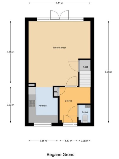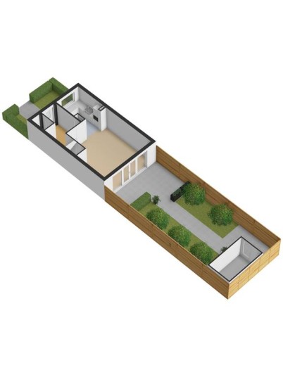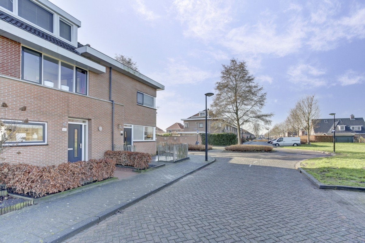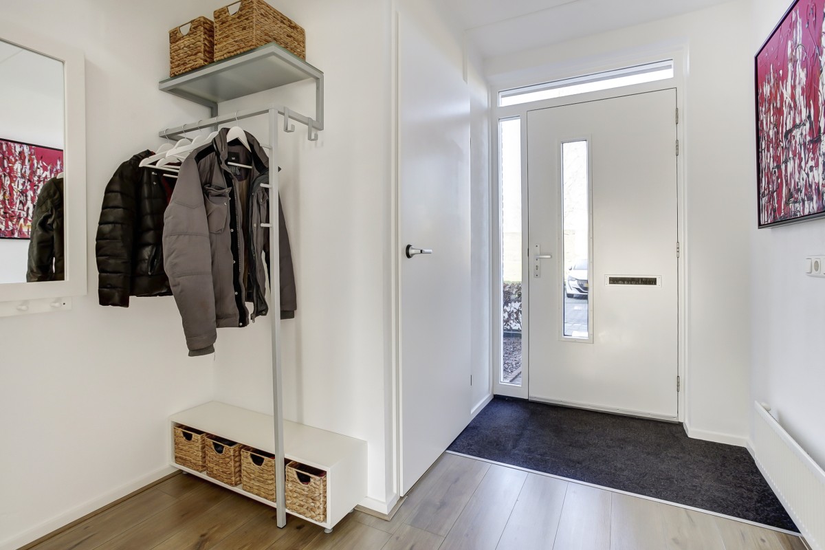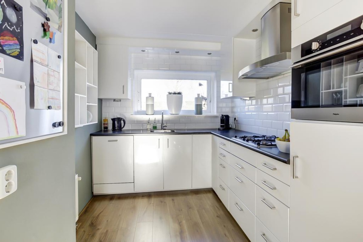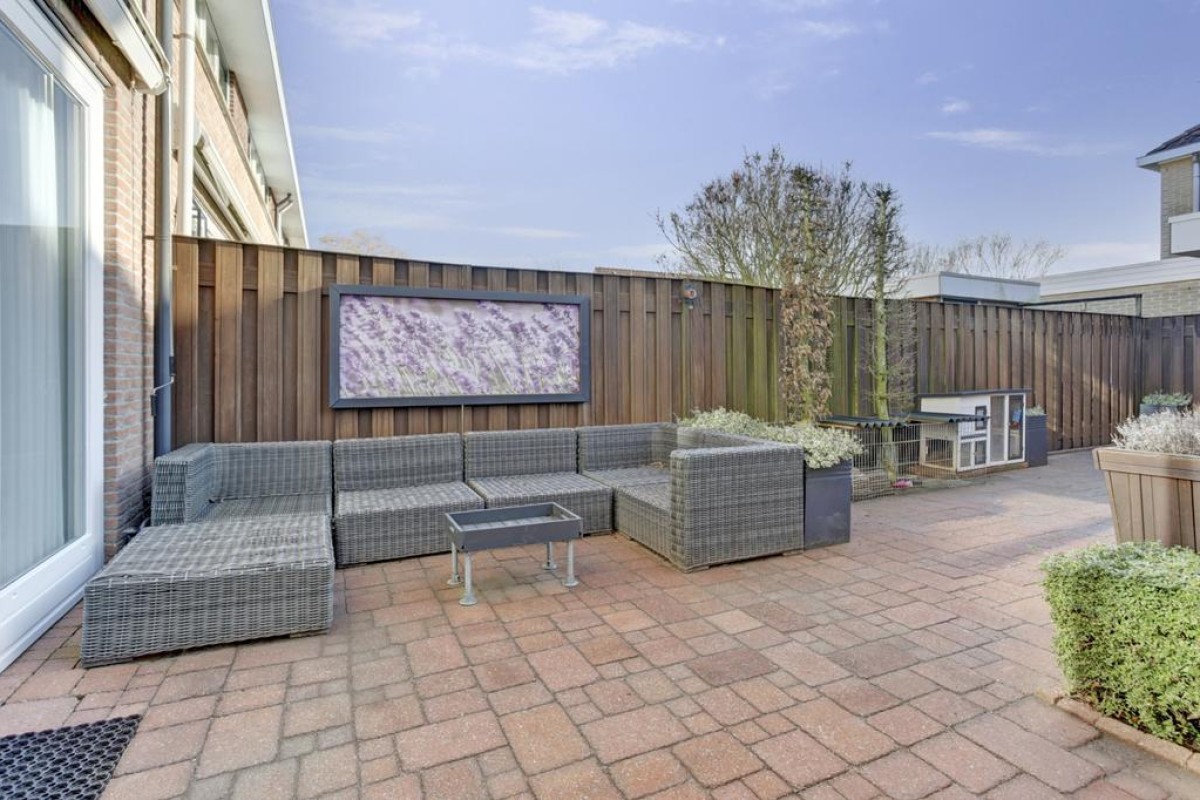 Begane grond: entree, hal met garderobe, lichte toiletruimte met toilet en fonteintje, uitgebreide meterkast, trapopgang naar de verdieping en doorgang naar de woonkamer. De woonkamer is tuingericht en beschikt over een provisiekast onder de trap alsmede een laminaatvloer. De achtergevel bestaat uit een brede schuifpui met met glas tot aan de grond over de maximale breedte van de achtergevel. Hierdoor is de woonkamer heerlijk licht en geeft uitzicht op de fraai aangelegde tuin op het zuiden. Aan de voorzijde van de woning is de hoekopgestelde keuken met veel werkblad gesitueerd. De keuken is in lichte kleurstelling uitgevoerd en is voorzien van een ingebouwde koelkast, gaskookplaat, afzuigkap, combi-magnetron en vaatwasser. Het keukenraam geeft vrij uitzicht over groen en water. De tuin is mooi onderhoudsarm aangelegd. Achterin de tuin is een achterom langs de vrijstaande stenen berging aanwezig. De berging heeft een betonvloer en overkapping.
