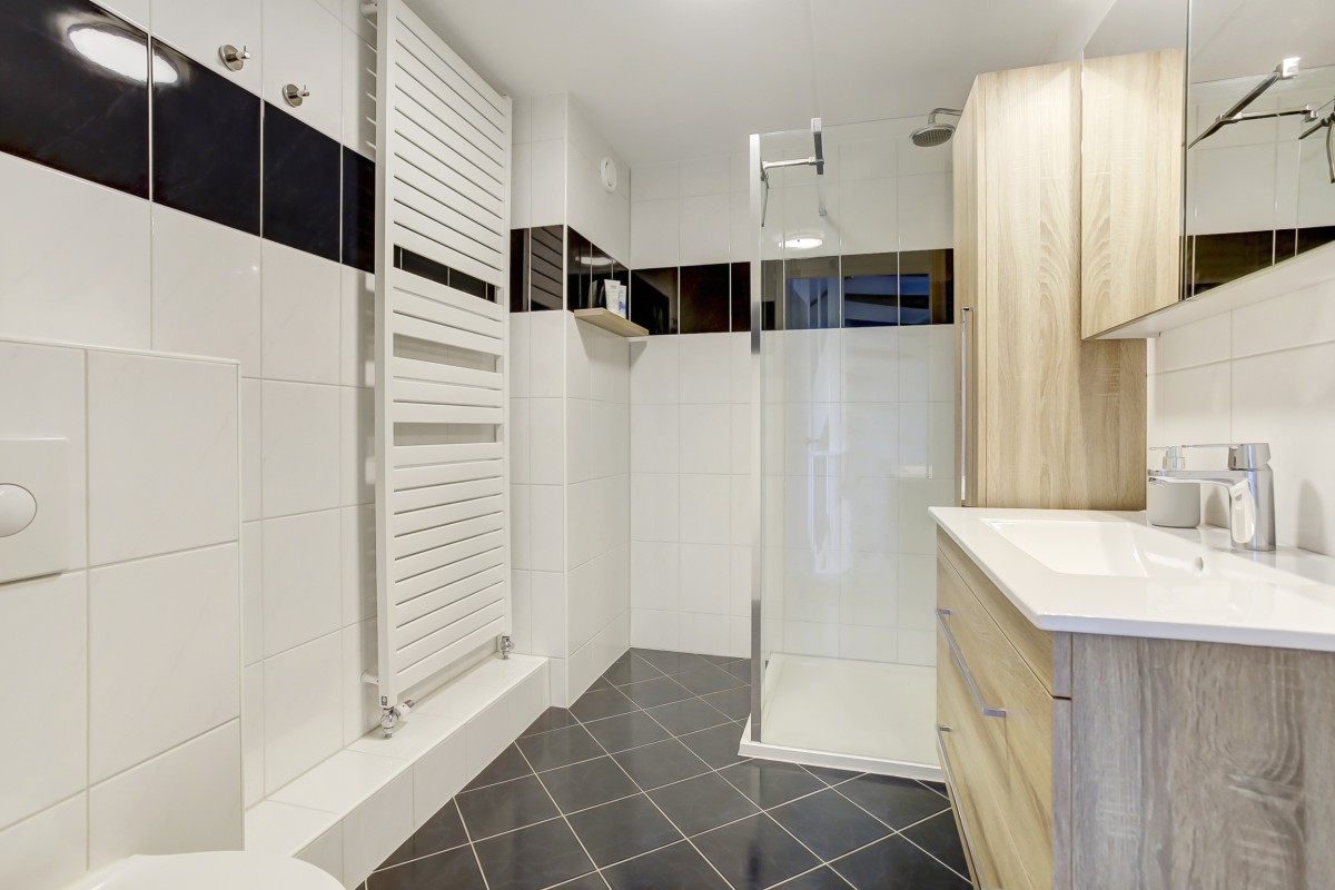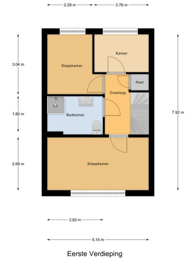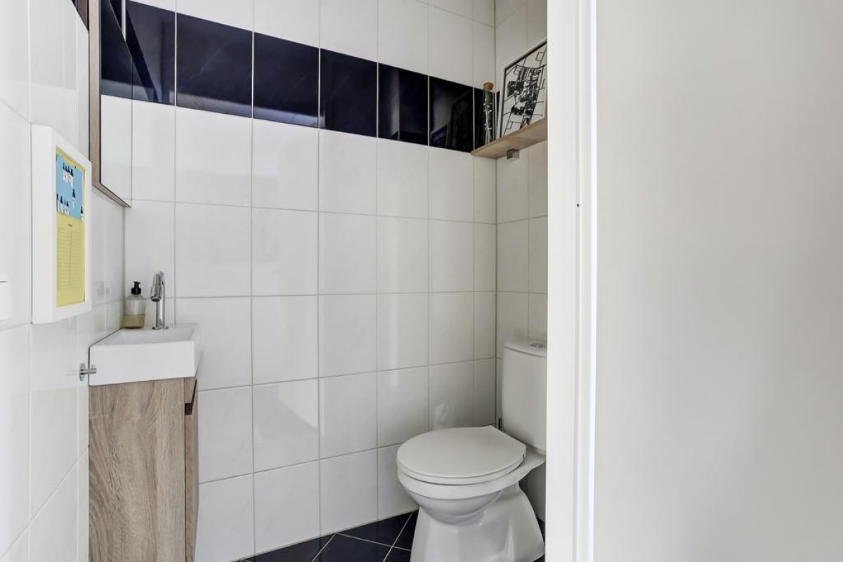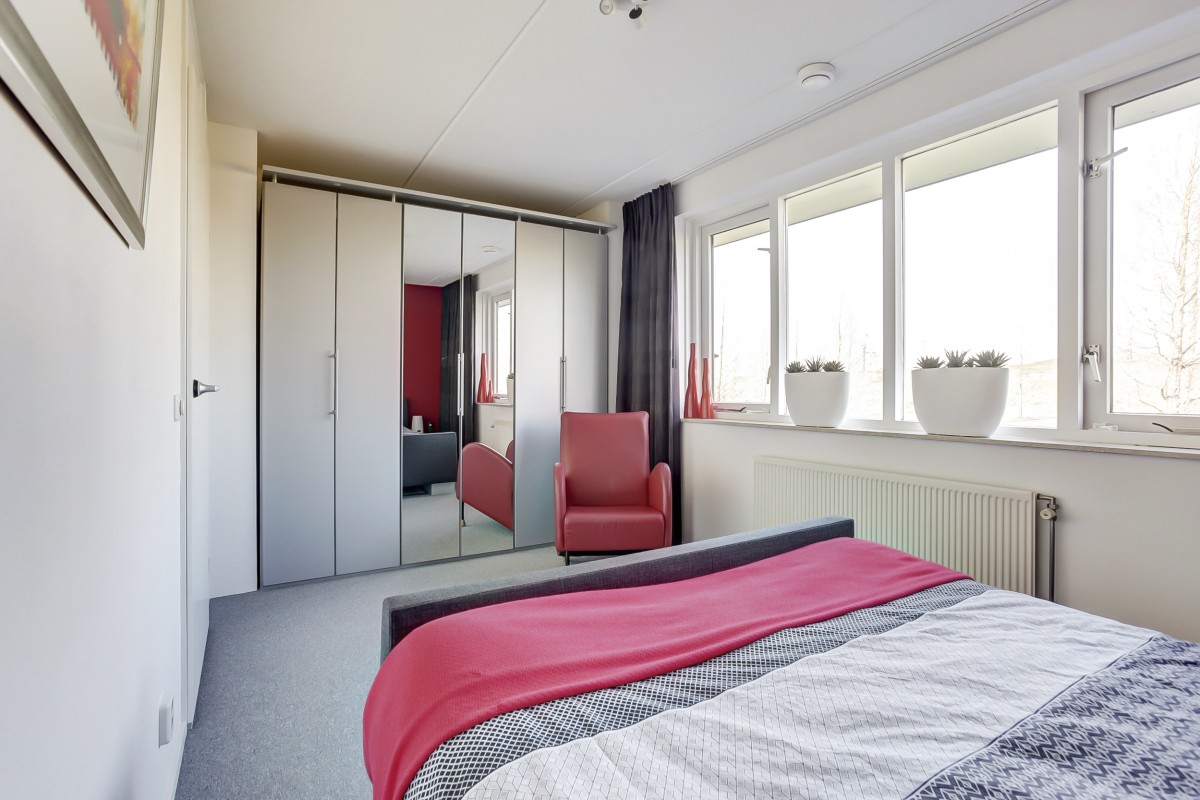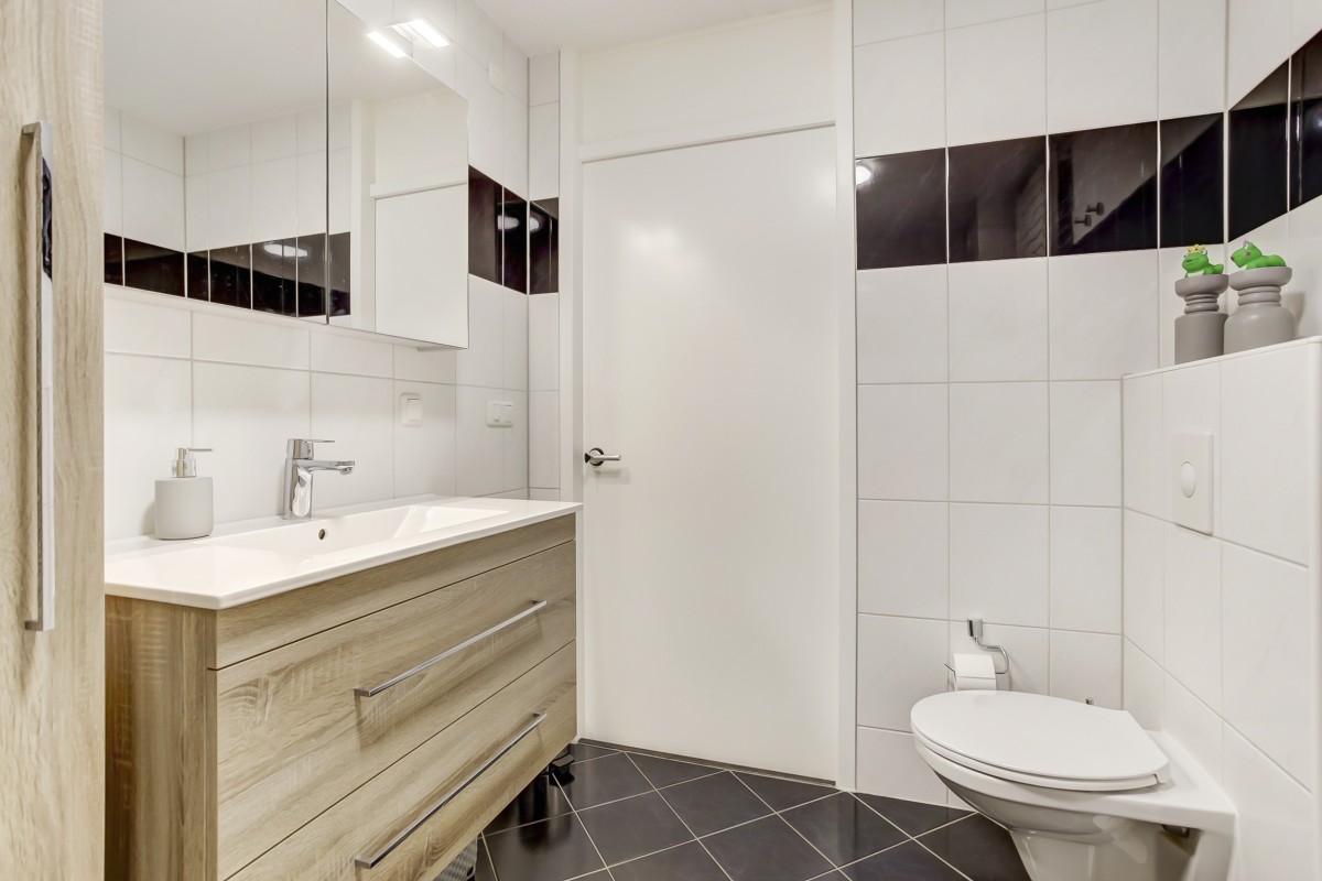 Eerste verdieping: vaste trap naar de overloop met aansluitend een provisiekast, 3 slaapkamers en de badkamer. De slaapkamer aan de voorzijde is over de gehele breedte gesitueerd en mede door het vrije uitzicht lekker licht. Aan de achterzijde van de woning zijn 2 slaapkamers gelegen. De badkamer is voorzien van een ruime douche, 2e toilet (hangcloset) en een wastafelmeubel. Deze verdieping is net als de traptreden voorzien van een moderne vloerbedekking.