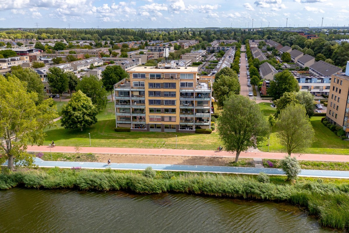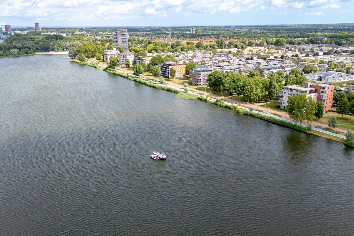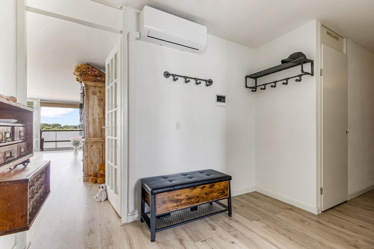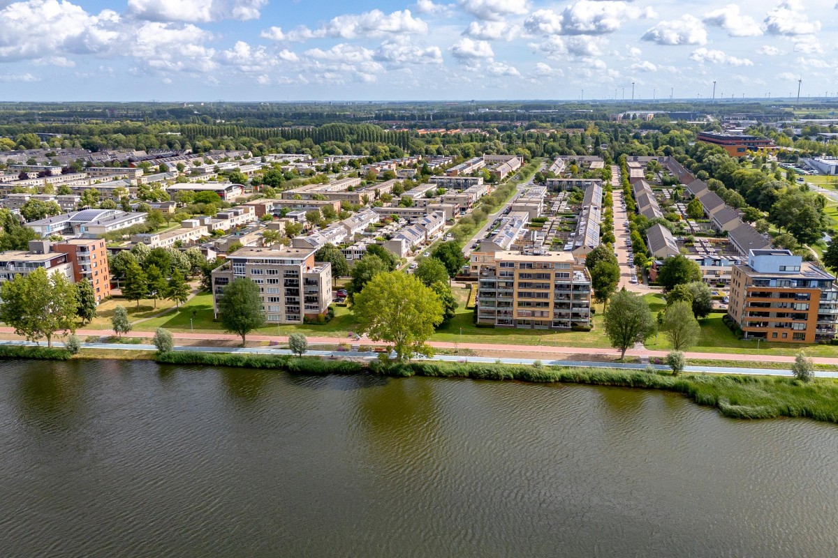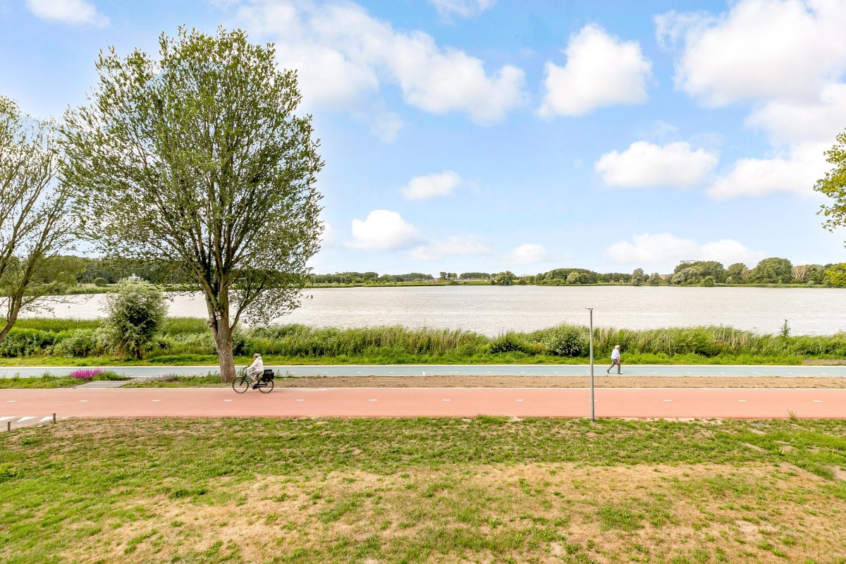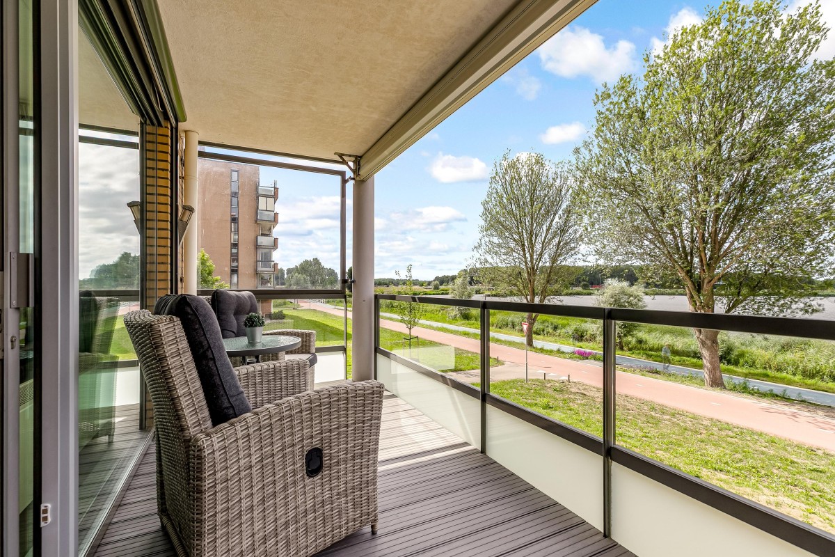 Entree/hal met meterkast en garderobe, berging, separate toilet en toegang tot de twee slaapkamers, badkamer en de ruime en lichte woonkamer. Bij binnenkomst van de woonkamer wordt je meteen naar het schitterende uitzicht getrokken. De woonkamer is zeer royaal en heeft een schuifpui naar het zonnige balkon van 11m2 op het zuidwesten. Het appartement is zonnig georiënteerd waardoor er ook veel lichtinval is. Voor de zomerse dagen kan de zon goed worden buitengehouden dankzij de screen/uitvalscherm (beiden elektrisch) op het balkon. Om ook uit de wind te kunnen zitten is op het balkon een extra glazen scherm aangebracht. De open keuken (2012) is in een U-vorm opgesteld en is voorzien van een graniet werkblad en lichte fronten. De keuken is voorzien van de volgende inbouwapparatuur: inductie kookplaat, afzuigkap, combimagnetron (dec, 2024), vaatwasser, quooker en een Amerikaanse koelkast welke ter overname wordt aangeboden. Aangezien het appartement op een hoek is gelegen heeft ook de keuken een extra zijraam. Zowel de woonkamer als de hal is voorzien van een airco unit. De twee ruime slaapkamers (voorheen 3) hebben voldoende ruimte voor een grote kledingkast en zijn gelegen aan de voorzijde van het appartement. De badkamer (2014) is voorzien van lichte betegeling tot aan het plafond, wastafelmeubel inclusief handdoekenkast, inloopdouche en aansluiting voor de wasmachine. Het gehele appartement is voorzien van een mooie en hoogwaardige laminaatvloer.