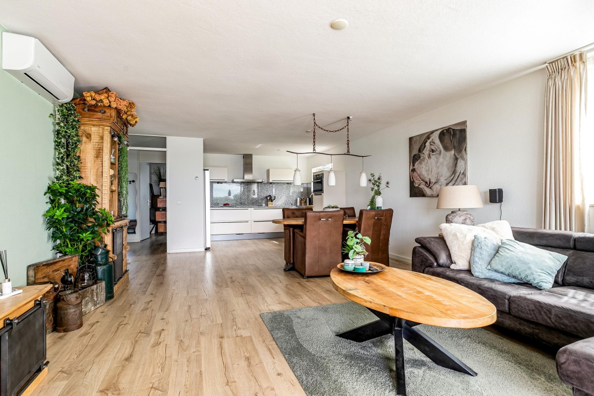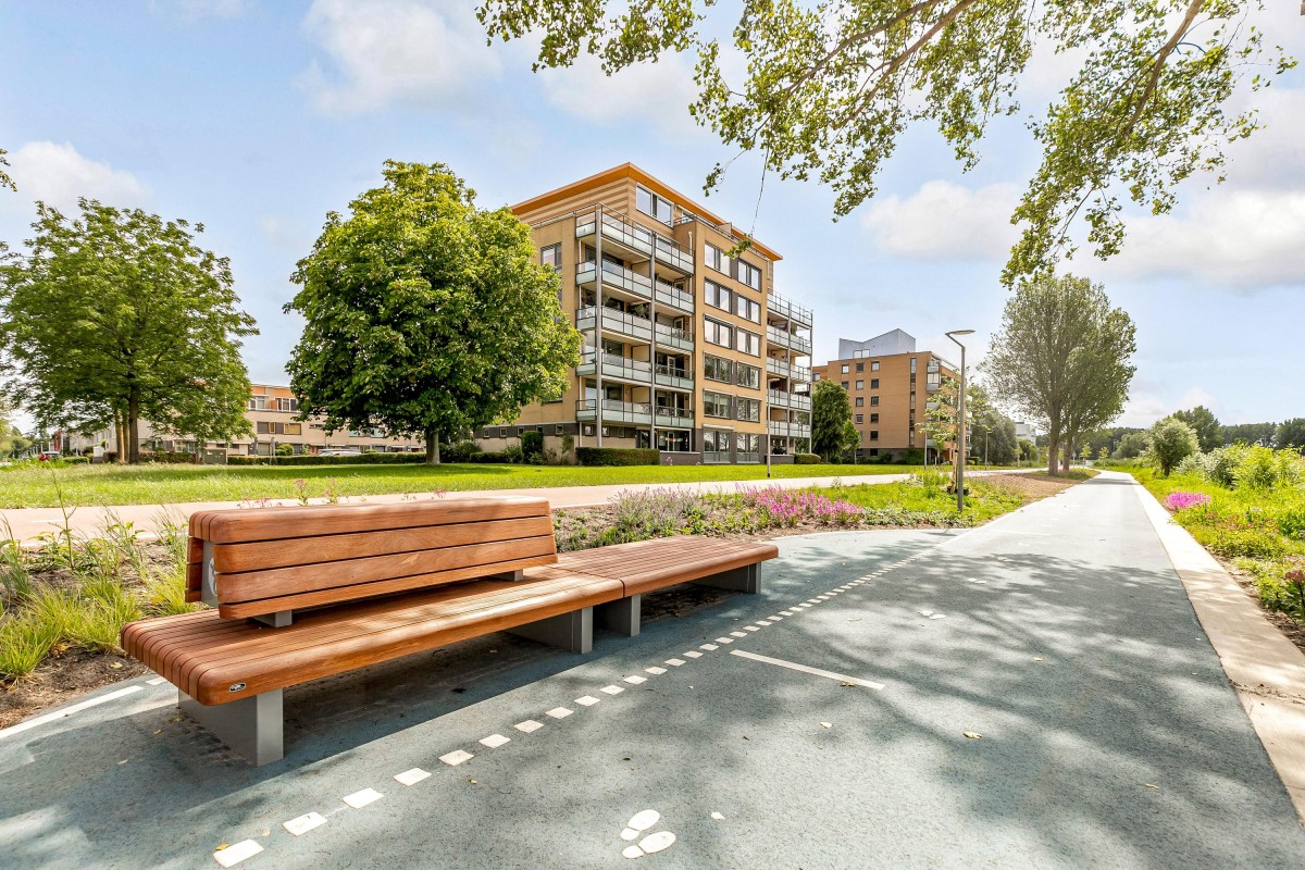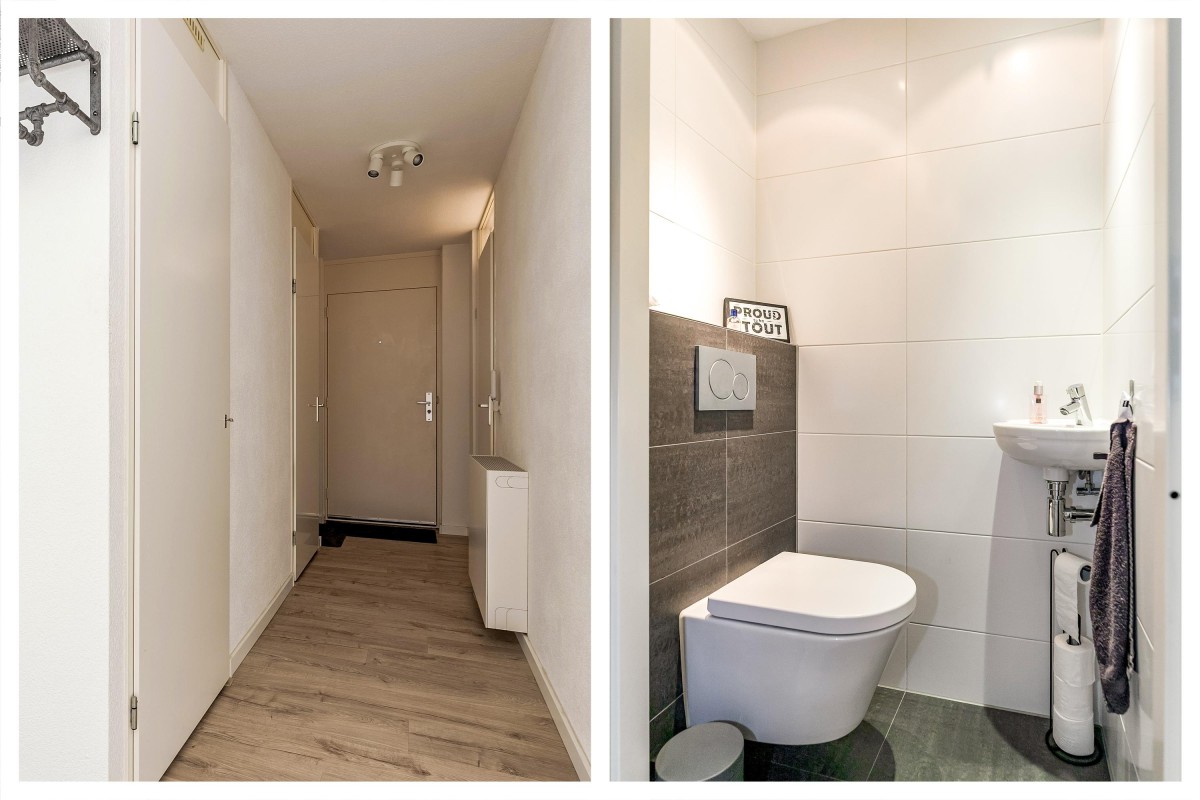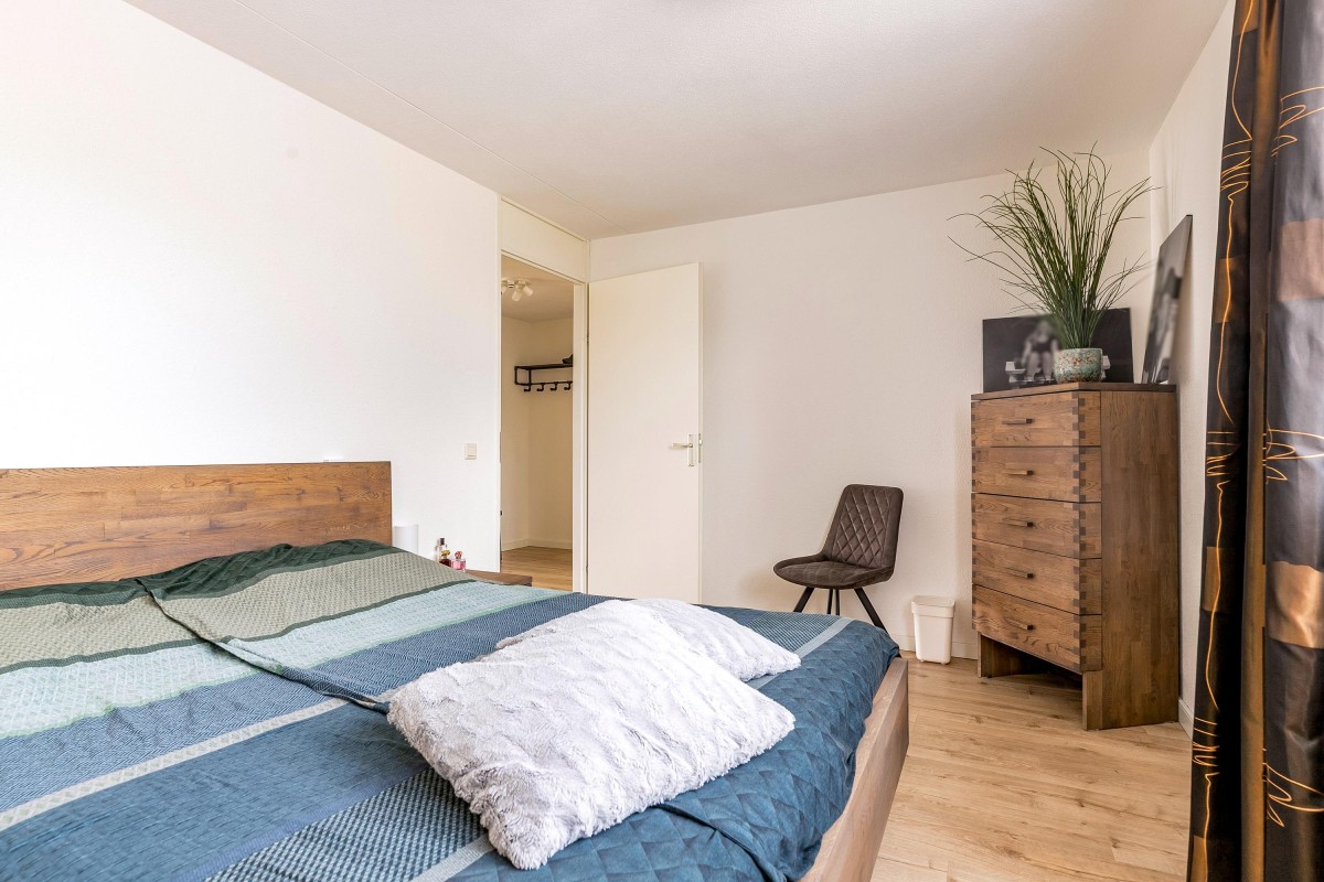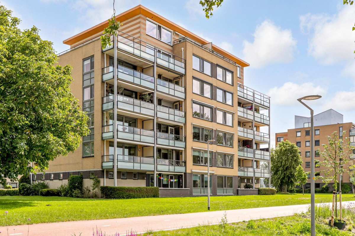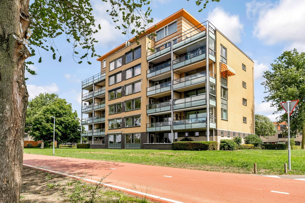 Entree/hal met meterkast en garderobe, berging, separate toilet en toegang tot de twee slaapkamers, badkamer en de ruime en lichte woonkamer. Bij binnenkomst van de woonkamer wordt je meteen naar het schitterende uitzicht getrokken. De woonkamer is zeer royaal en heeft een schuifpui naar het zonnige balkon van 11m2 op het zuidwesten. Het appartement is zonnig georiënteerd waardoor er ook veel lichtinval is. Voor de zomerse dagen kan de zon goed worden buitengehouden dankzij de screen/uitvalscherm (beiden elektrisch) op het balkon. Om ook uit de wind te kunnen zitten is op het balkon een extra glazen scherm aangebracht. De open keuken (2012) is in een U-vorm opgesteld en is voorzien van een graniet werkblad en lichte fronten. De keuken is voorzien van de volgende inbouwapparatuur: inductie kookplaat, afzuigkap, combimagnetron (dec, 2024), vaatwasser, quooker en een Amerikaanse koelkast welke ter overname wordt aangeboden. Aangezien het appartement op een hoek is gelegen heeft ook de keuken een extra zijraam. Zowel de woonkamer als de hal is voorzien van een airco unit. De twee ruime slaapkamers (voorheen 3) hebben voldoende ruimte voor een grote kledingkast en zijn gelegen aan de voorzijde van het appartement. De badkamer (2014) is voorzien van lichte betegeling tot aan het plafond, wastafelmeubel inclusief handdoekenkast, inloopdouche en aansluiting voor de wasmachine. Het gehele appartement is voorzien van een mooie en hoogwaardige laminaatvloer.