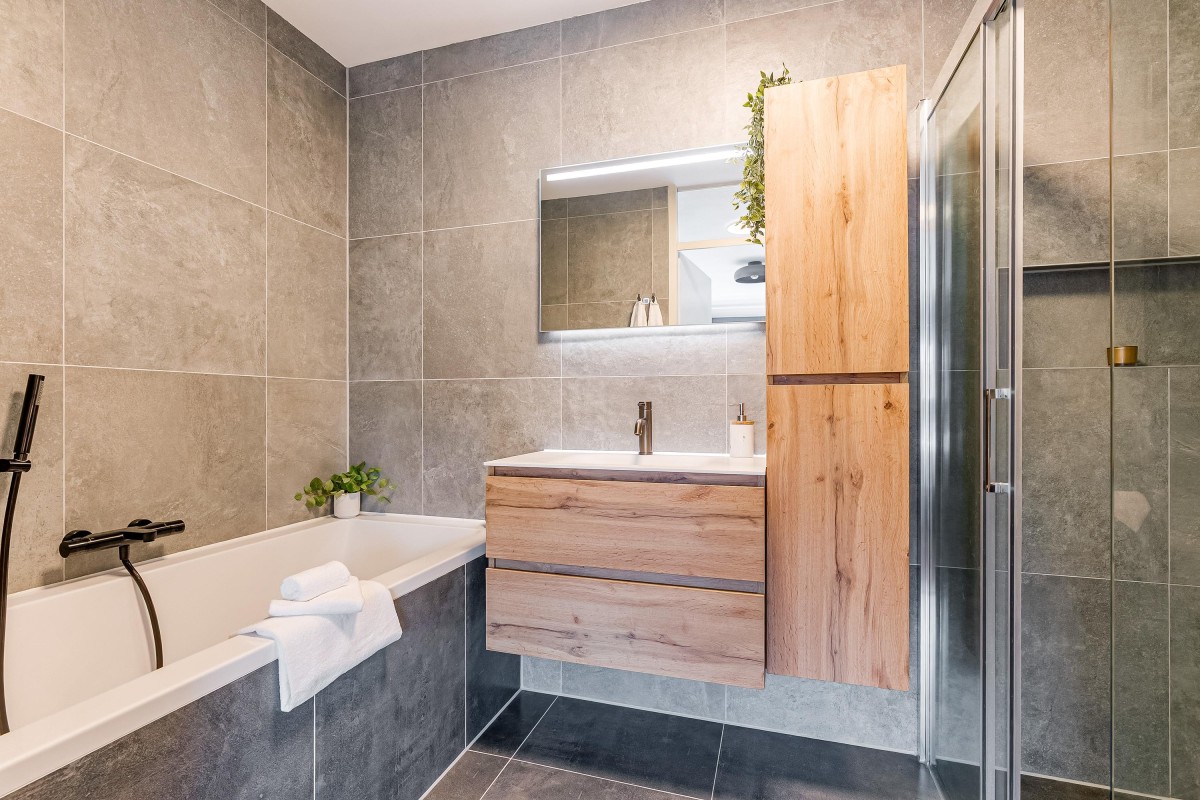 - Badkamer met ligbad, douchecabine, wastafel met meubel en toilet.