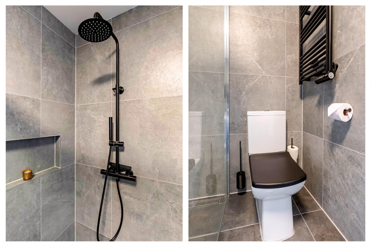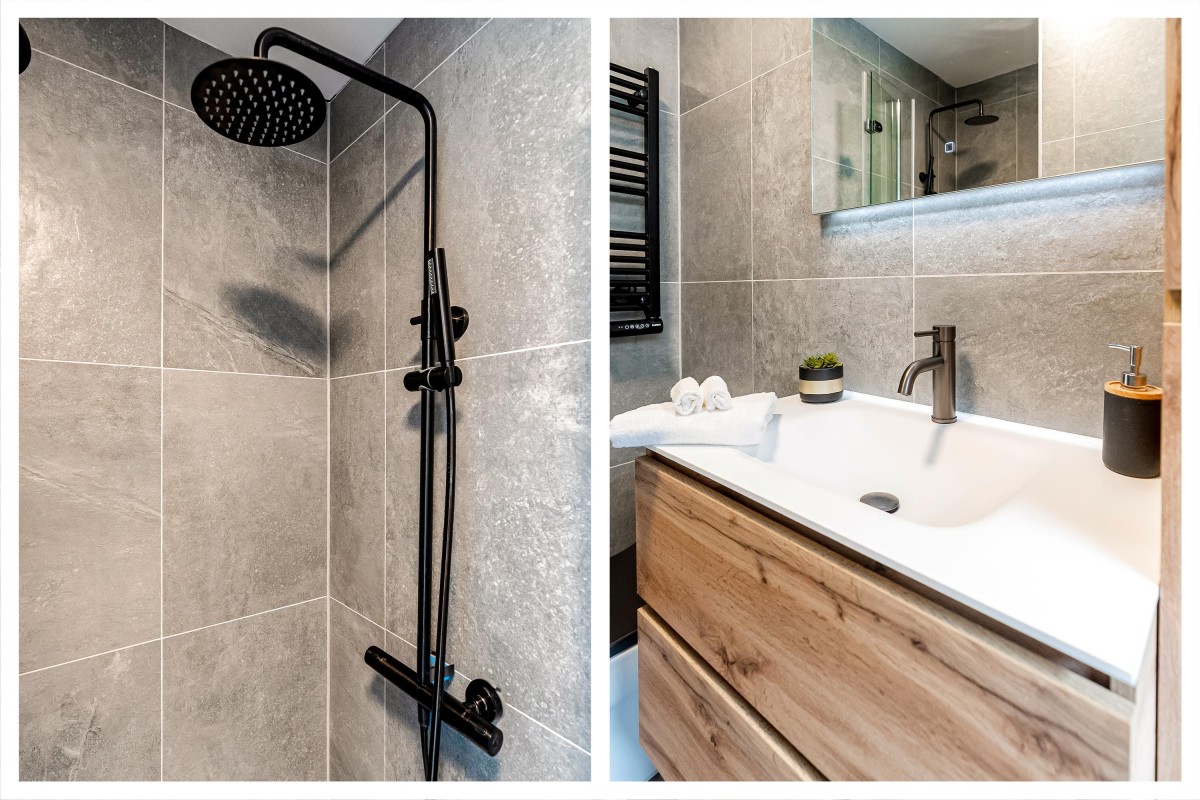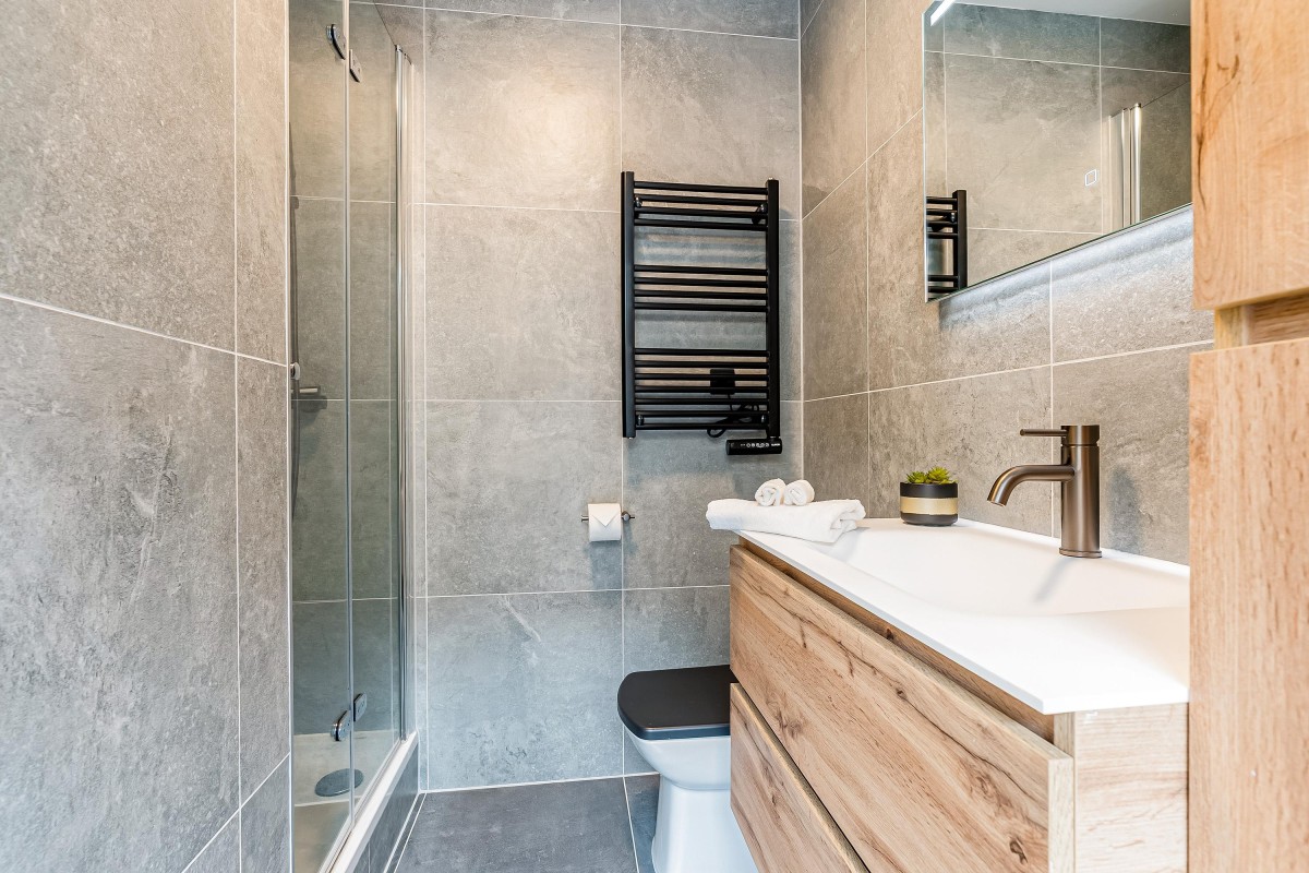 - Badkamer met douchecabine, wastafel met meubel, toilet en betegeling tot plafond