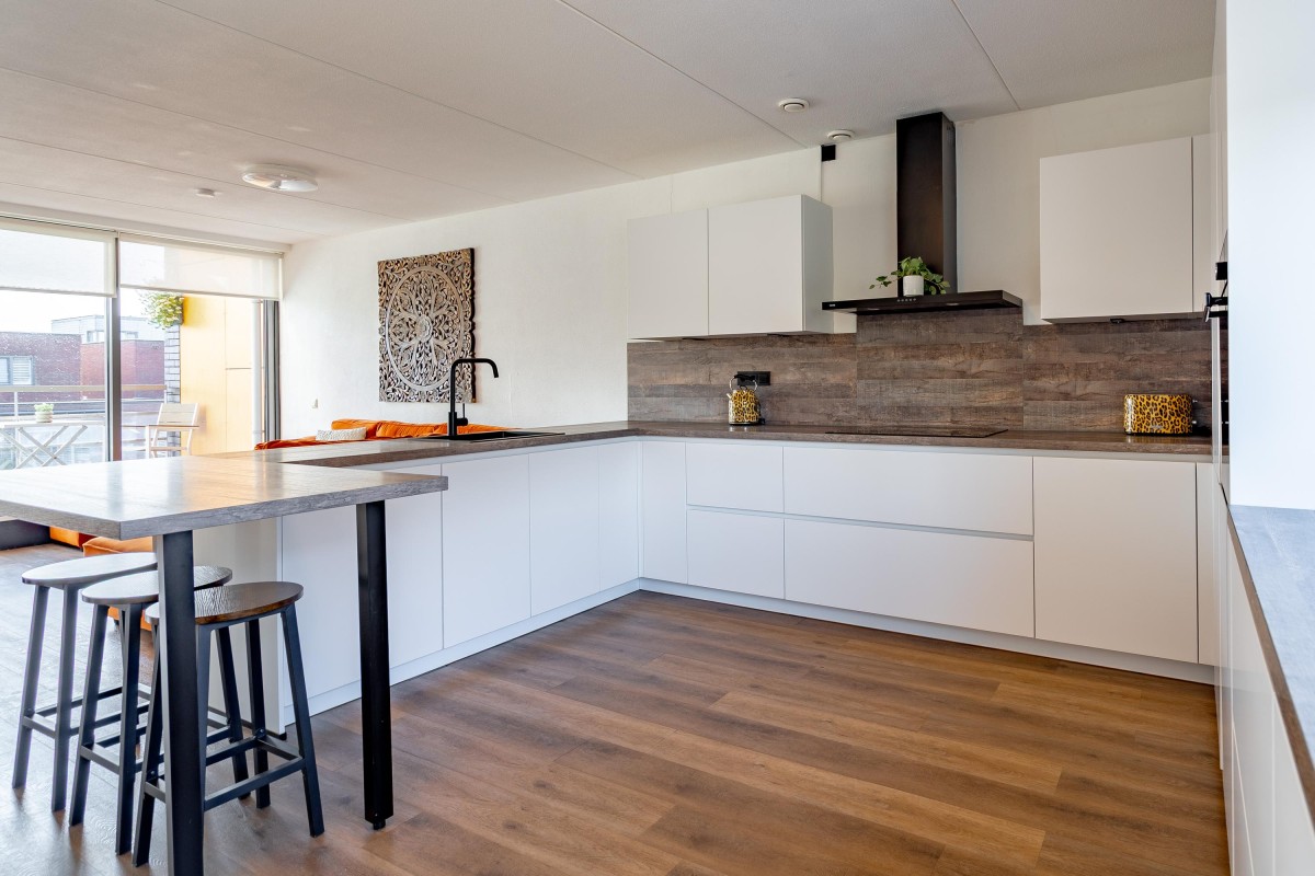 - Woonkeuken is geleden aan de voorzijde met kookplaat, afzuigkap, oven, vaatwasser en koel/vriescombinatie.