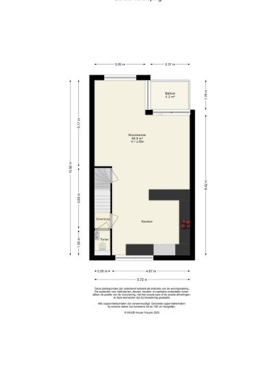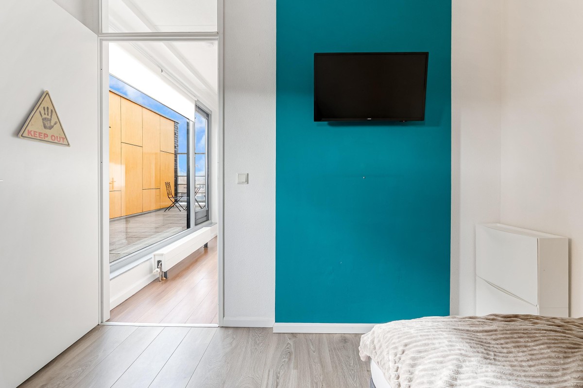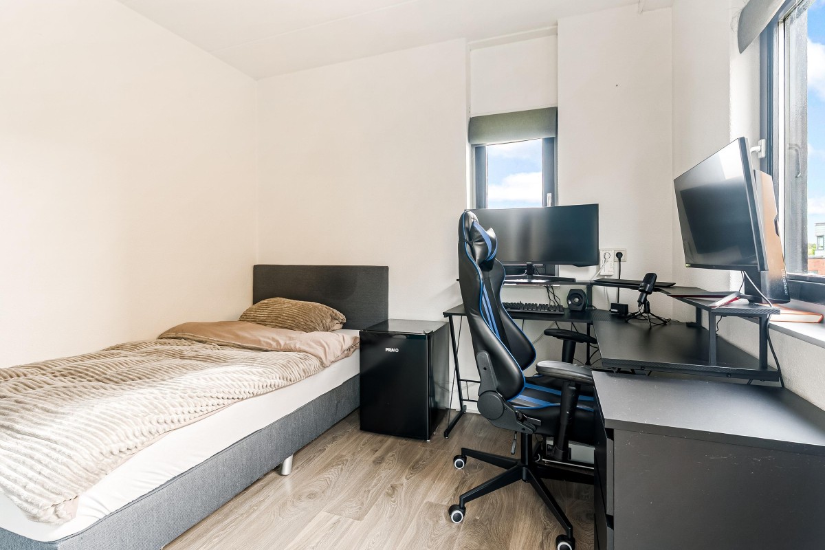 - Entree: meterkast, trap, ‘woonhal’ voor studie- of chillruimte, slaapkamer en badkamer.