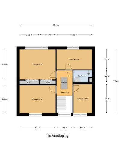Eerste verdieping: overloop met aangrenzend 4 slaapkamers en de badkamer. De badkamer biedt een inloopdouche en wastafel. De overloop en slaapkamers zijn voorzien van laminaat.