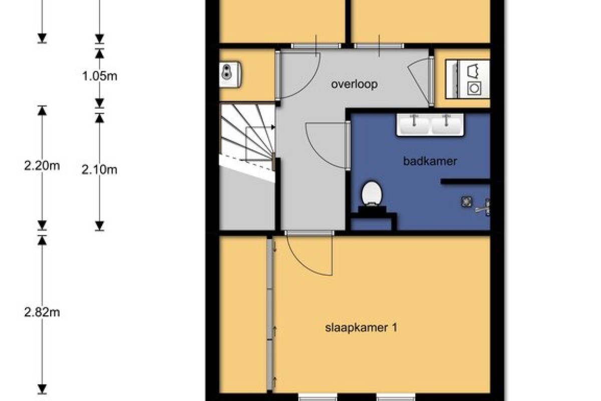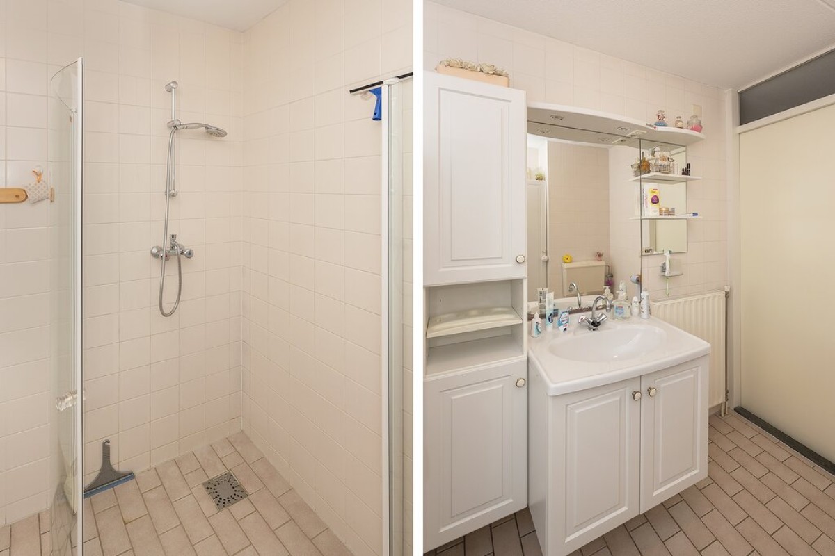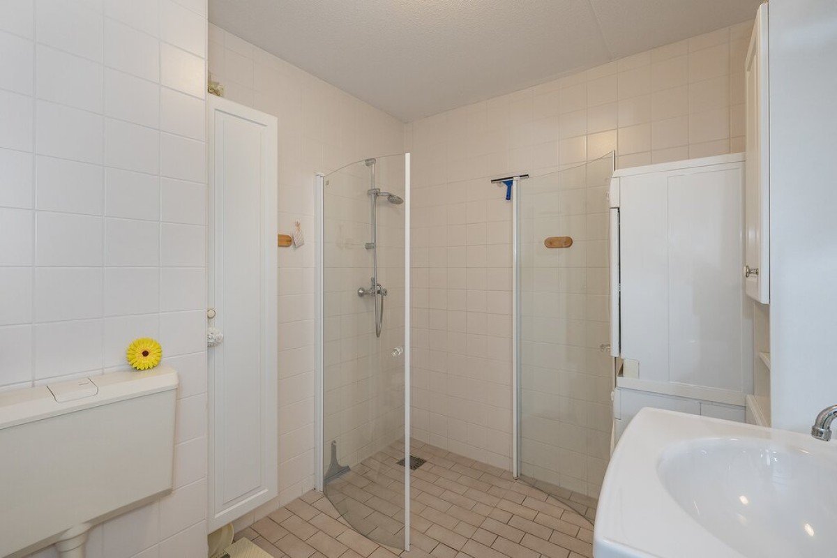 Vaste trap naar de verdieping, overloop en toegang tot drie mooie grote slaapkamers, een zeer ruime aan de voorzijde over de volle breedte van de woning en twee slaapkamers aan de achterzijde. De badkamer is uitgerust met een douchecabine, tweede toilet en een wastafelmeubel. Er is een aparte ruimte met aansluitingen voor de wasmachine en wasdroger.