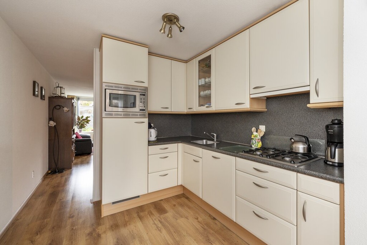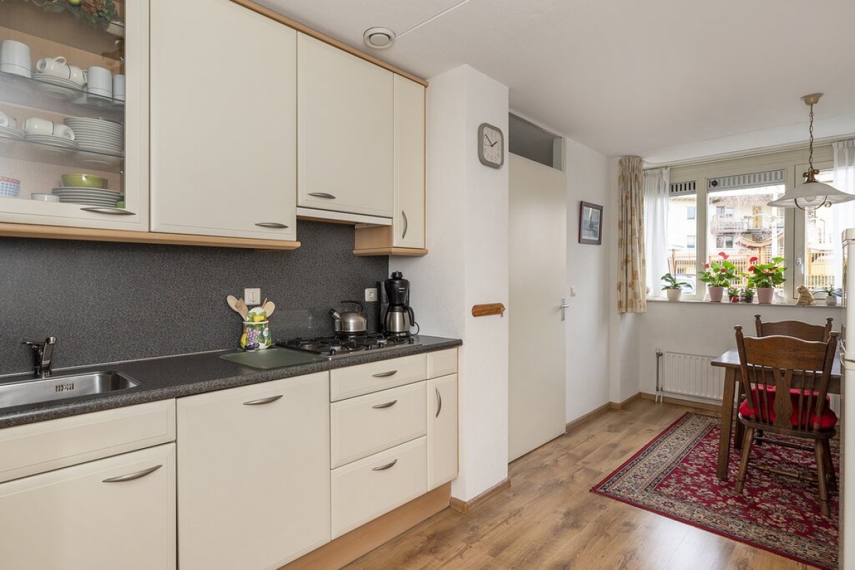 Lees verderAan de voorzijde vind je de woonkeuken, deze is netjes, voorzien van alle inbouwapparatuur en ook vanuit de keuken kan je naar de hal. De begane grond is voorzien van een laminaatvloer. Er is nog een handige voorraadkast aanwezig.