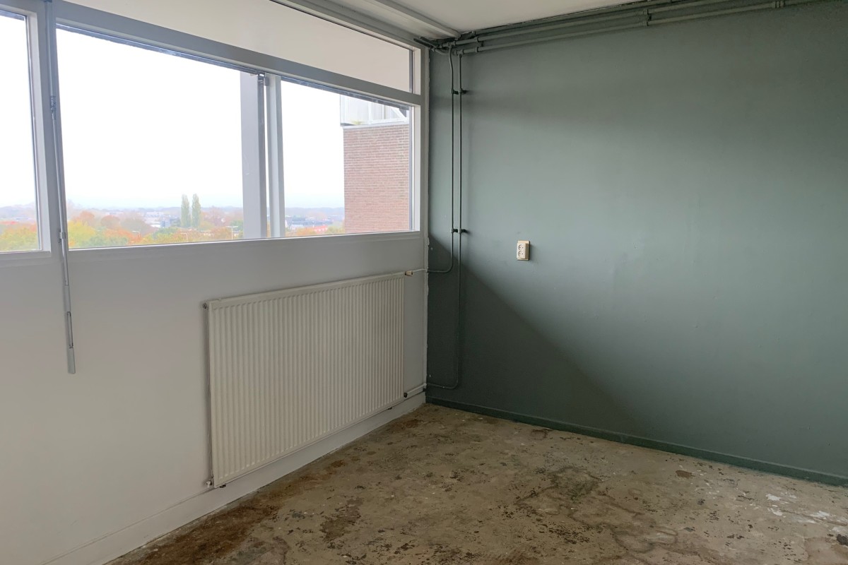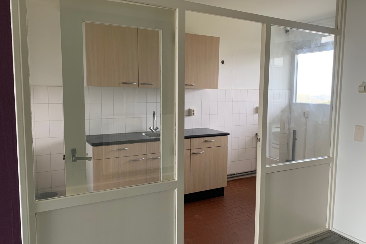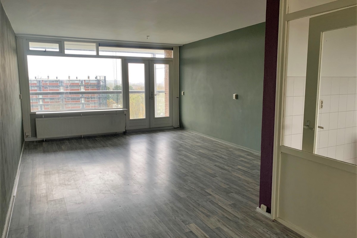 Woonlaag 8: tochtportaal met meterkast, royale woonkamer met toegang naar het riante balkon. Aan de voorzijde bevindt zich de dichte keuken in een rechte opstelling geplaatst. Drie slaapkamers, c.v.-ruimte, toilet, badkamer met douche, toilet en wastafel.