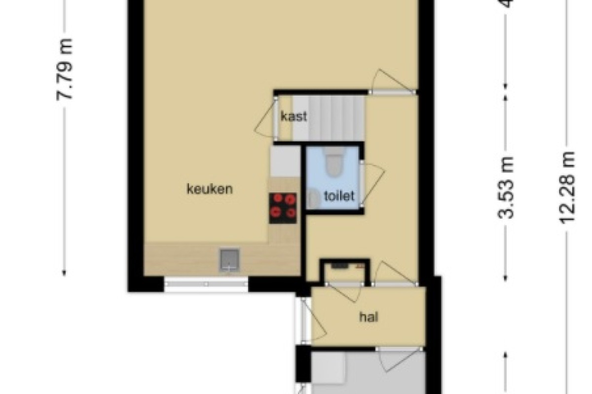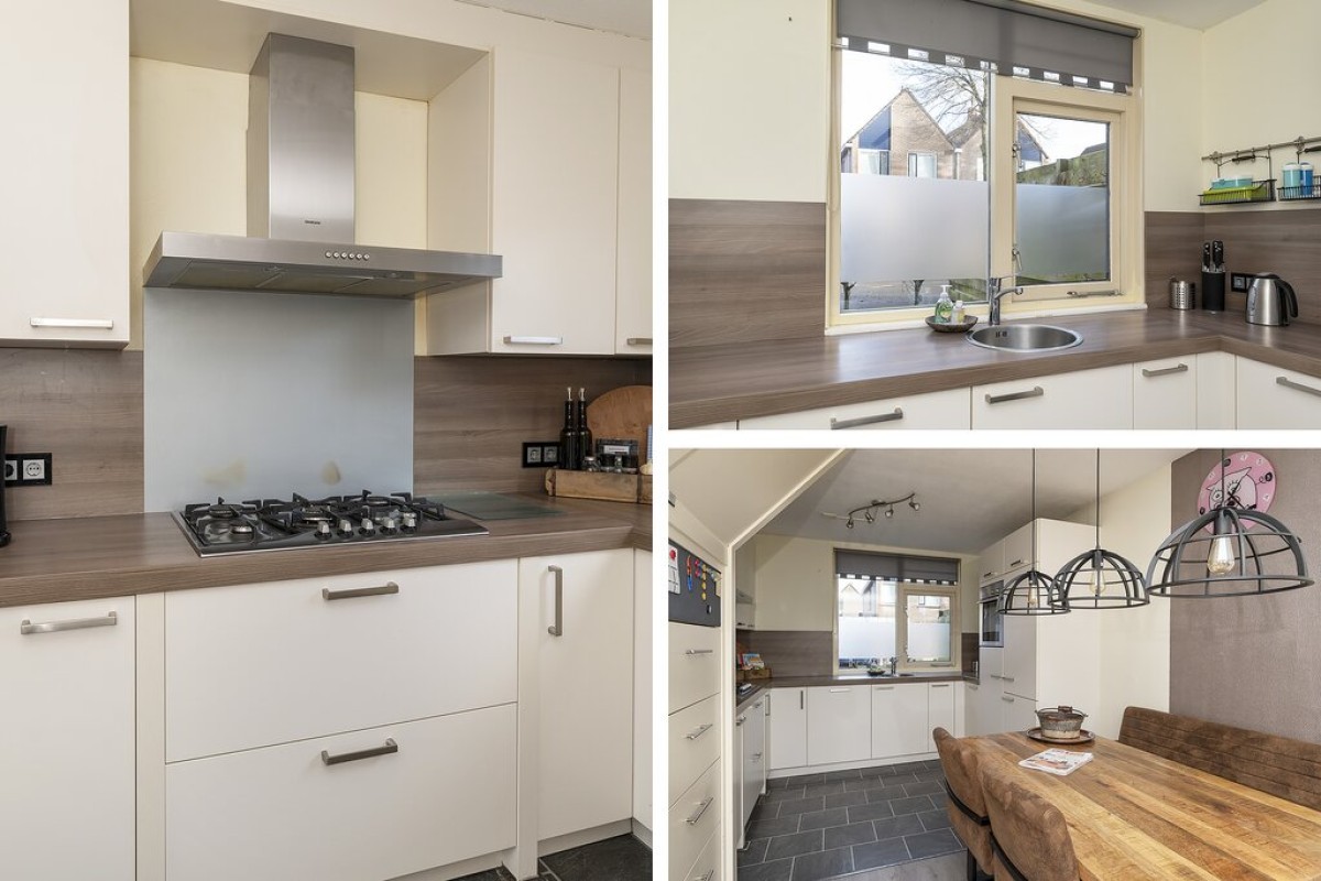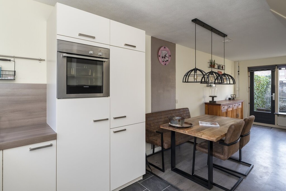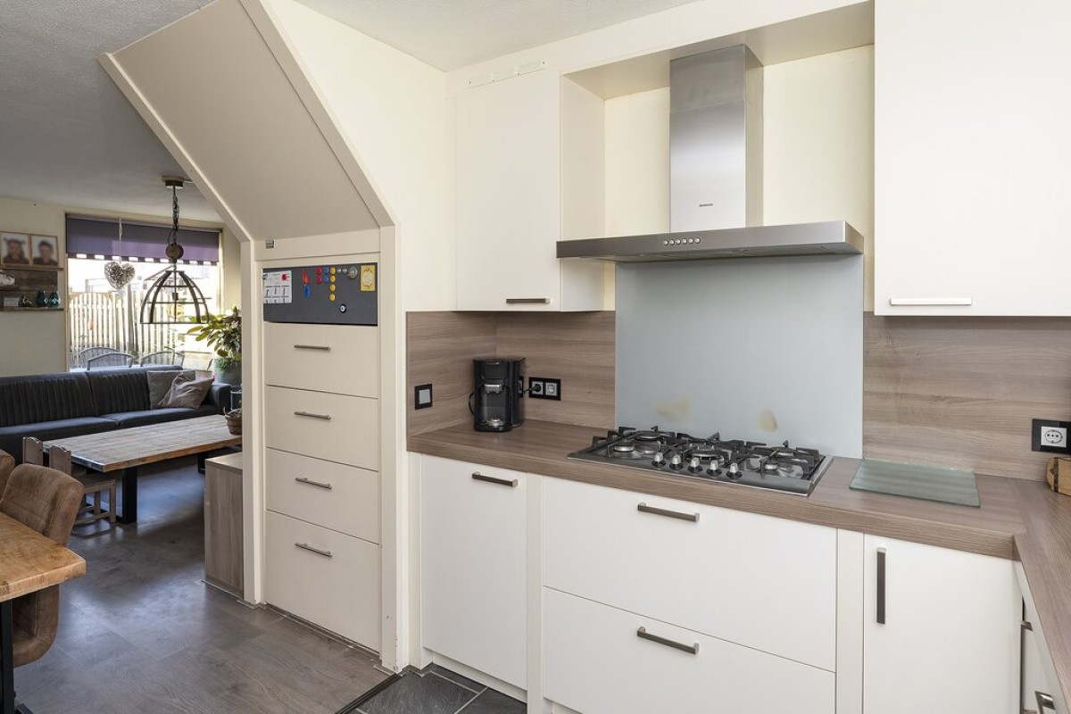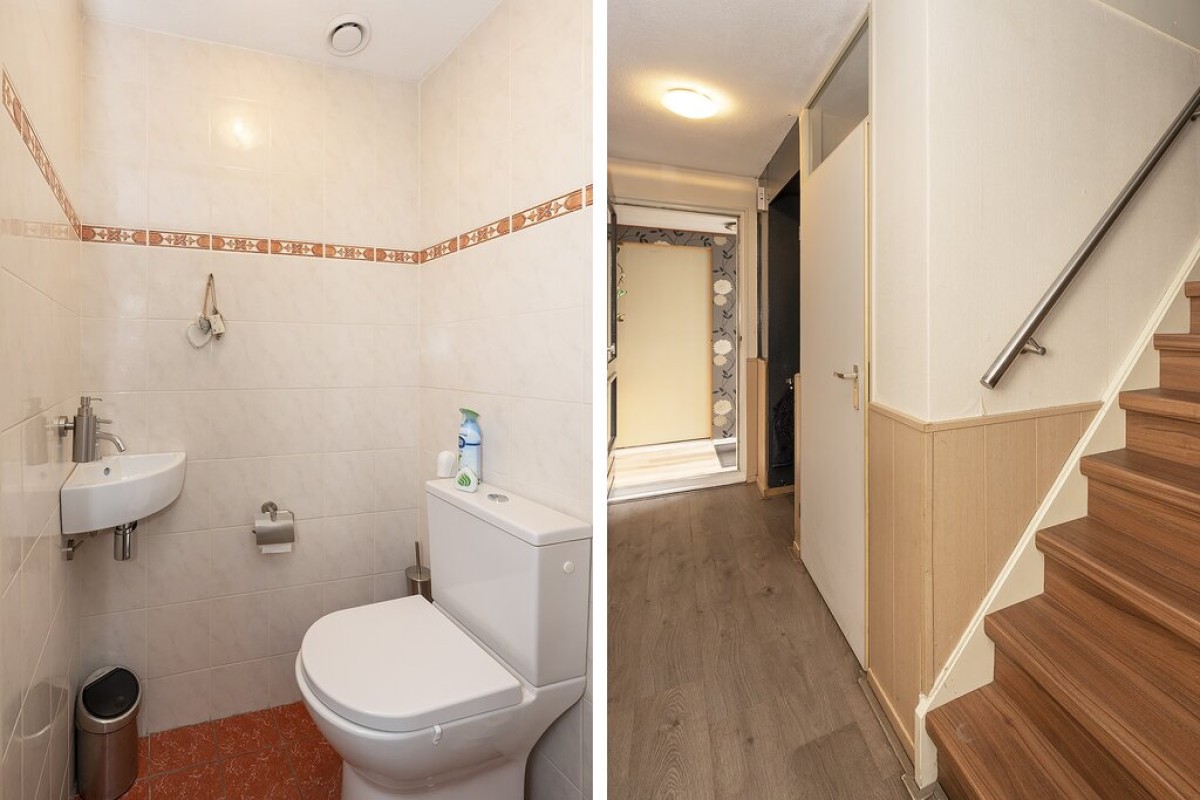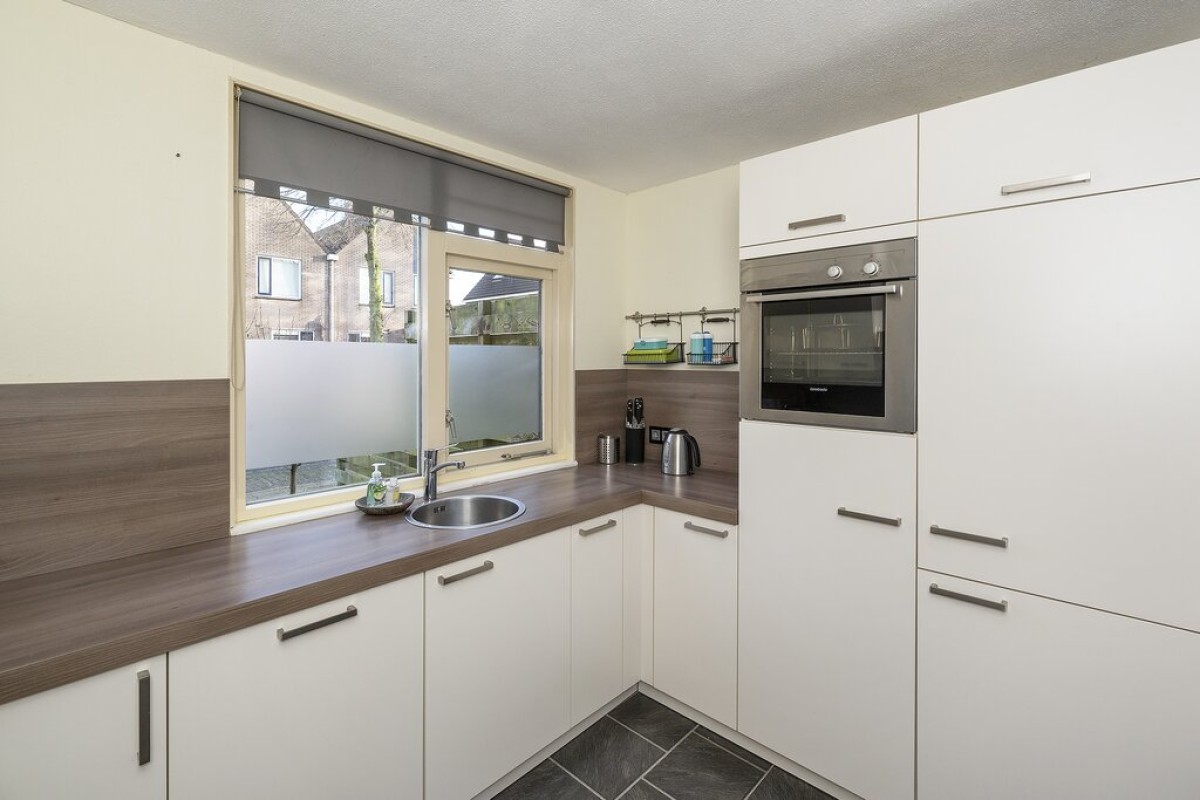 Entree met meterkast, trapopgang, toilet en cv kast. De tuingerichte woonkamer beschikt over een laminaatvloer en heeft een praktische provisiekast onder de trap. De keuken vindt u aan de straatzijde deze is ingericht met een moderne opstelling voorzien van inbouwapparatuur. Vanuit de woonkamer is de tuin bereikbaar aan de voorzijde is de aangebouwde berging