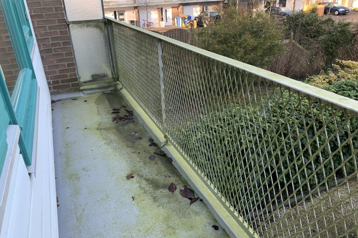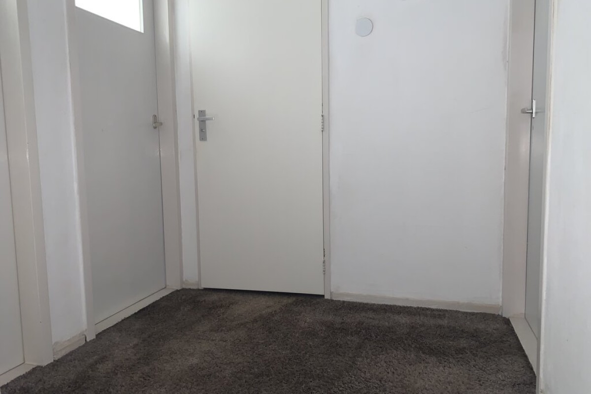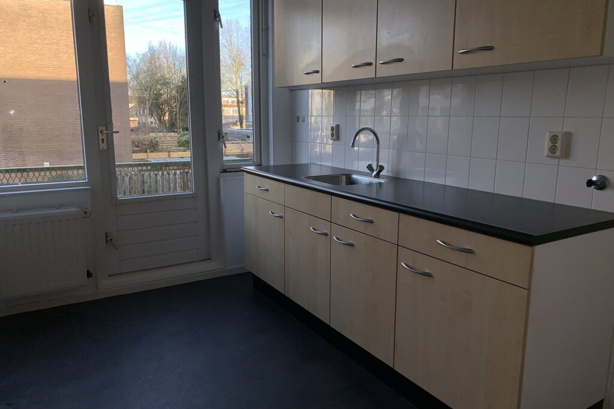 Overloop met toegang tot de woonkamer en keuken. De royale woonkamer beschikt over voldoende ruimte voor een grote eetkamertafel. De grote raampartijen zorgen voor veel lichtinval en hebben een vrij uitzicht over een groenstrook of de achtertuin. De keuken is voorzien van een nette keukeninrichting. Vanuit de keuken is er toegang tot een balkon over de volle breedte van het woonhuis.