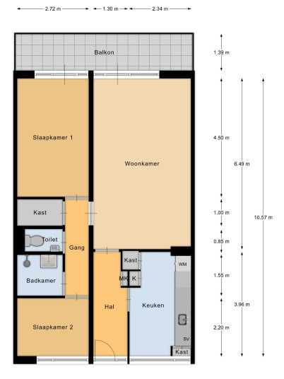 Via the communal staircase, you take the elevator to the fourth floor, after which you reach your apartment via a shared gallery. Upon entering, you come into a hallway that provides access to the meter cupboard, the kitchen, and the rest of the apartment. At the front, there is the first well-sized bedroom, as well as the kitchen, which can still be finished to your own taste. At the rear, you will find the second bedroom and the spacious living room, both of which offer access to the balcony that runs the full width of the apartment and is positioned on the southwest.