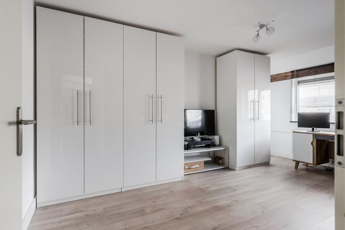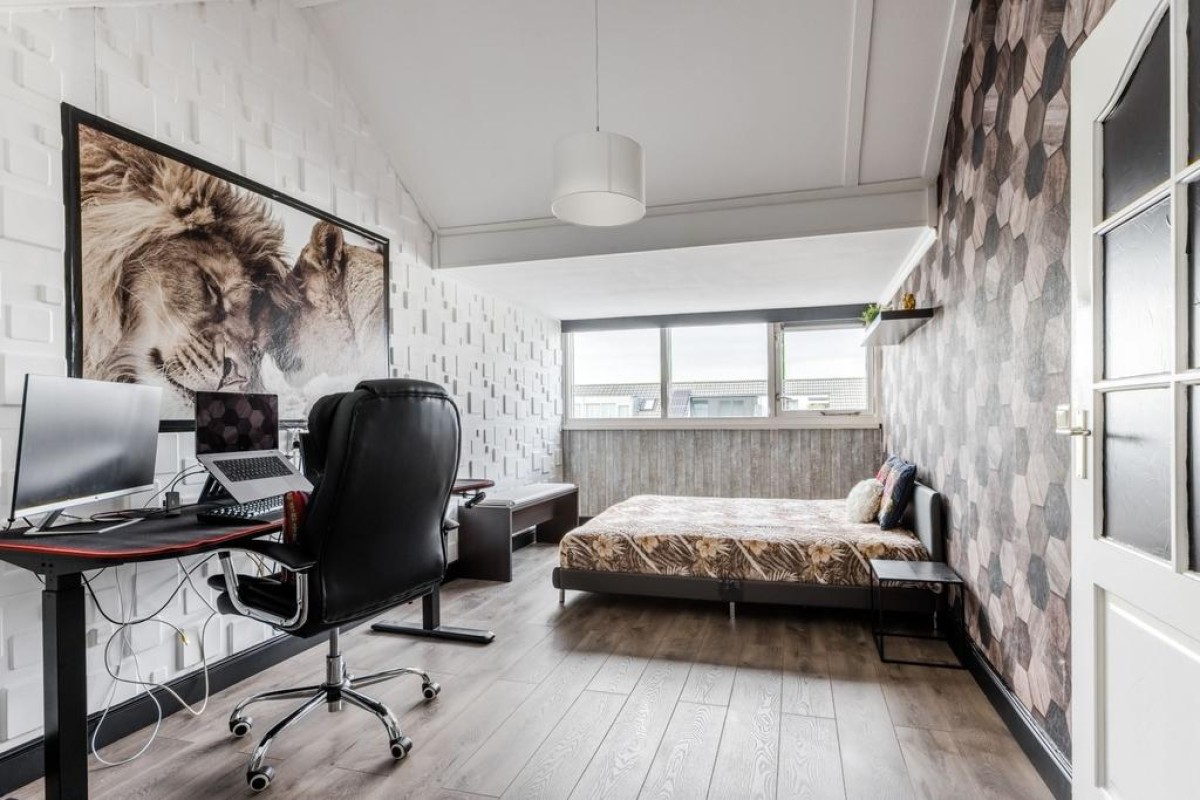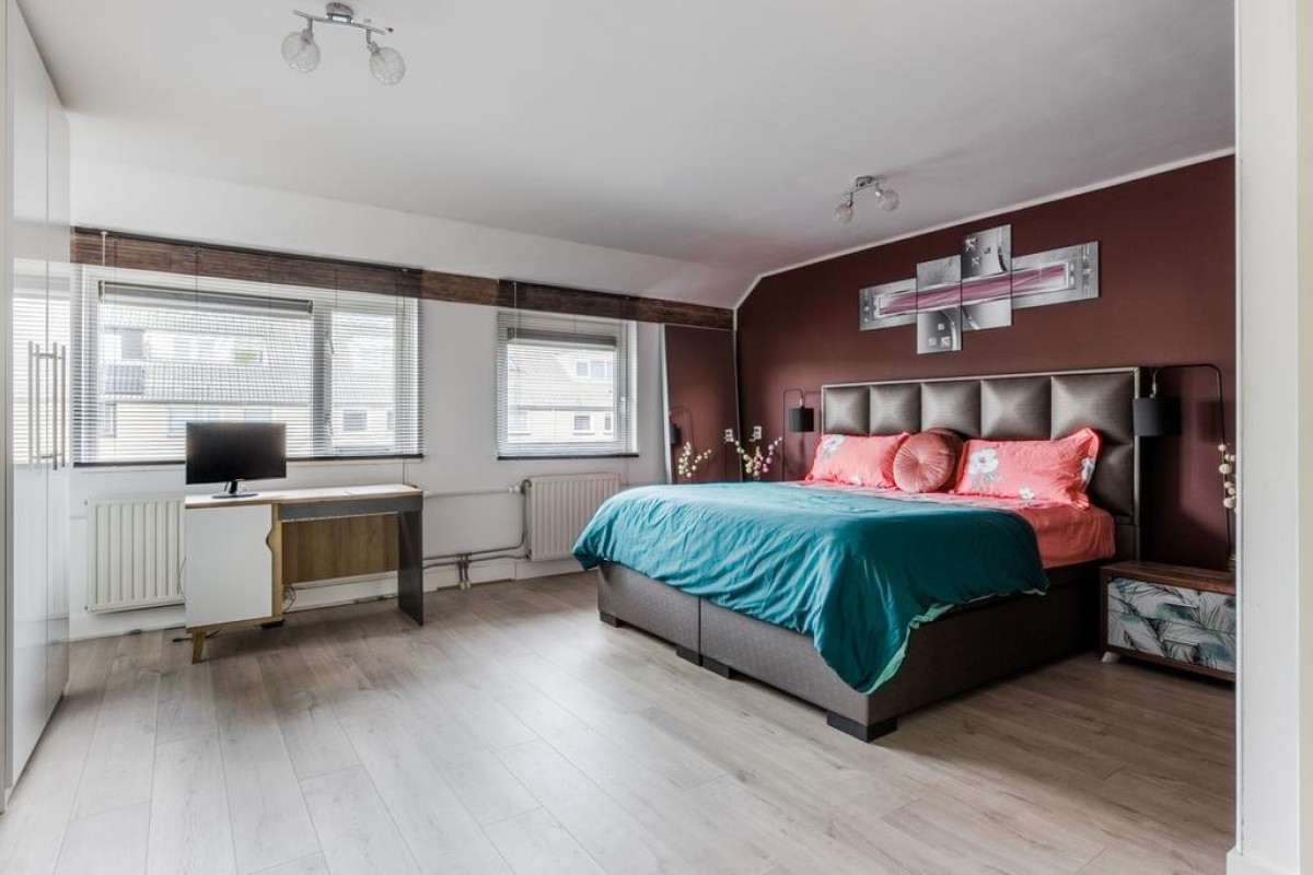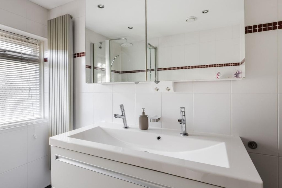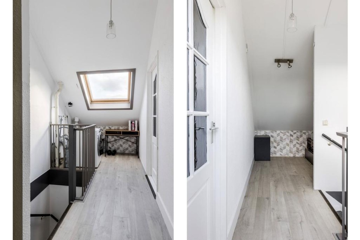 Overloop met toegang tot 2 slaapkamers (voorheen 3) en de badkamer. De slaapkamer aan de achterzijde is gelegen over de volle breedte van de woning. De badkamer is voorzien van betegeling tot aan het plafond, douchehoek met cabine, dubbele wastafel met meubel, 2e toilet (vrijhangend closet), designradiator en een raam voor extra ventilatie. De gehele verdieping is voor zien van een nette laminaatvloer.