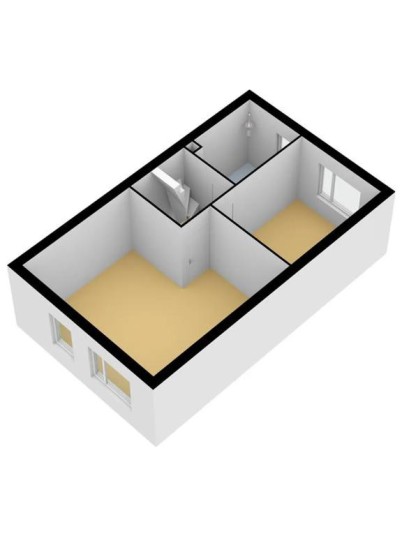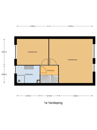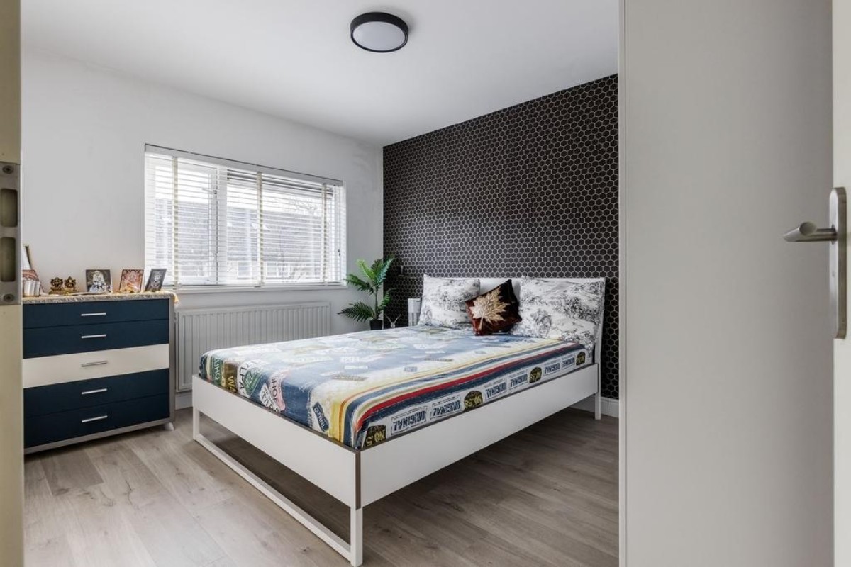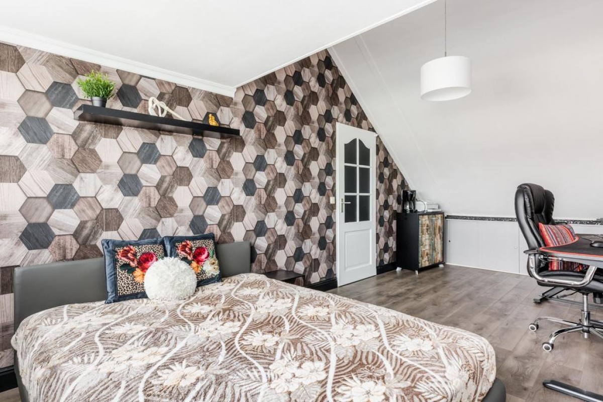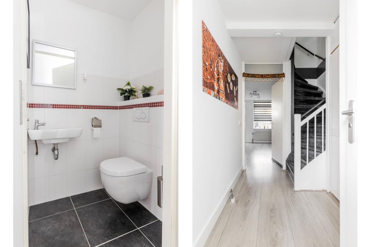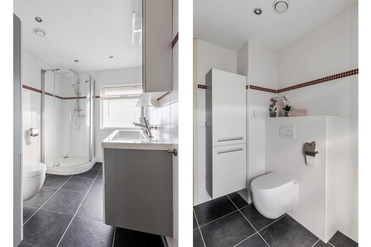Overloop met toegang tot 2 slaapkamers (voorheen 3) en de badkamer. De slaapkamer aan de achterzijde is gelegen over de volle breedte van de woning. De badkamer is voorzien van betegeling tot aan het plafond, douchehoek met cabine, dubbele wastafel met meubel, 2e toilet (vrijhangend closet), designradiator en een raam voor extra ventilatie. De gehele verdieping is voor zien van een nette laminaatvloer.