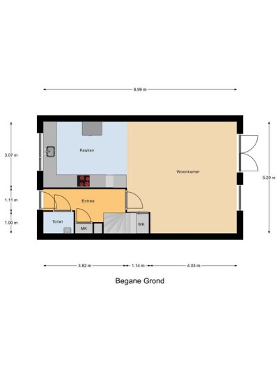 Entree, hal met meterkast, trapopgang en het toilet met fonteintje. De tuingerichte woonkamer is erg licht door de dubbele openslaande deuren en de grote ramen in de achtergevel. De luxueuze open keuken is gelegen aan de voorzijde. De inbouwkeuken is voorzien van een graniet werkblad, voldoende bergruimte in onder en bovenkasten en diverse inbouwapparaten. de gehele begane grondvloer is voorzien van een mooie laminaatvloer.