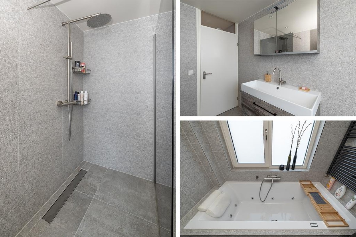 1e verdieping: overloop, twee slaapkamers, de voormalige badkamer is momenteel in gebruik als wasmachineruimte. Aan de achterzijde doet de voormalige derde slaapkamer dienst als nieuwe luxe badkamer voorzien van badmeubel riante inloopdouche. Het toilet op deze etage is geplaatst in de oude badkamer.