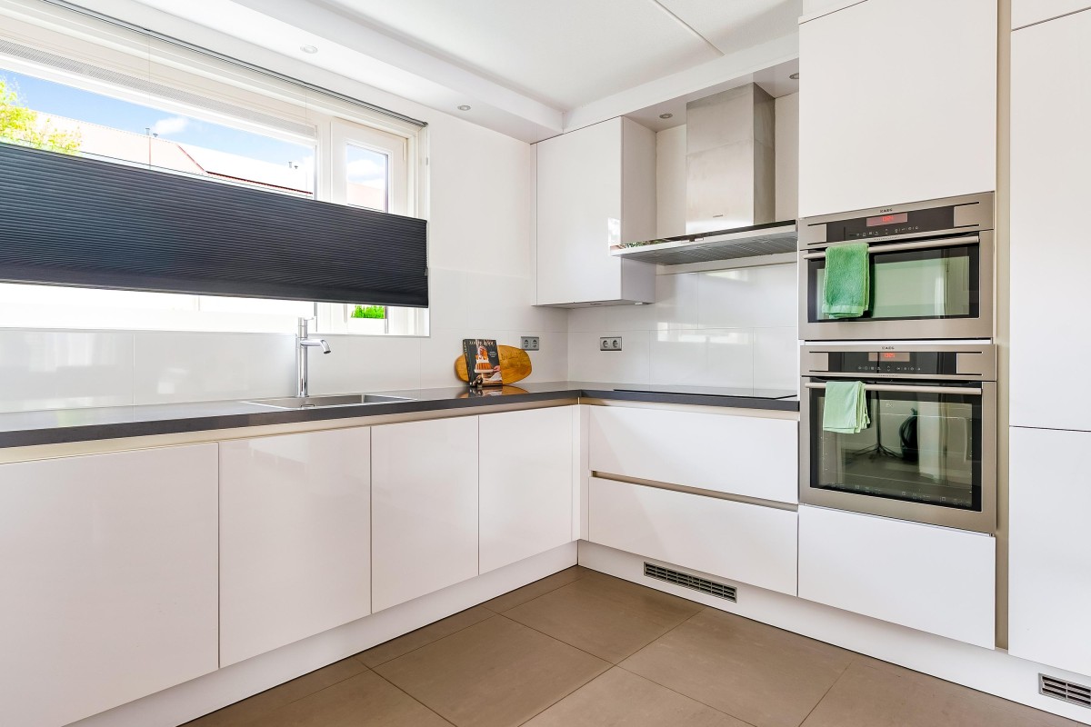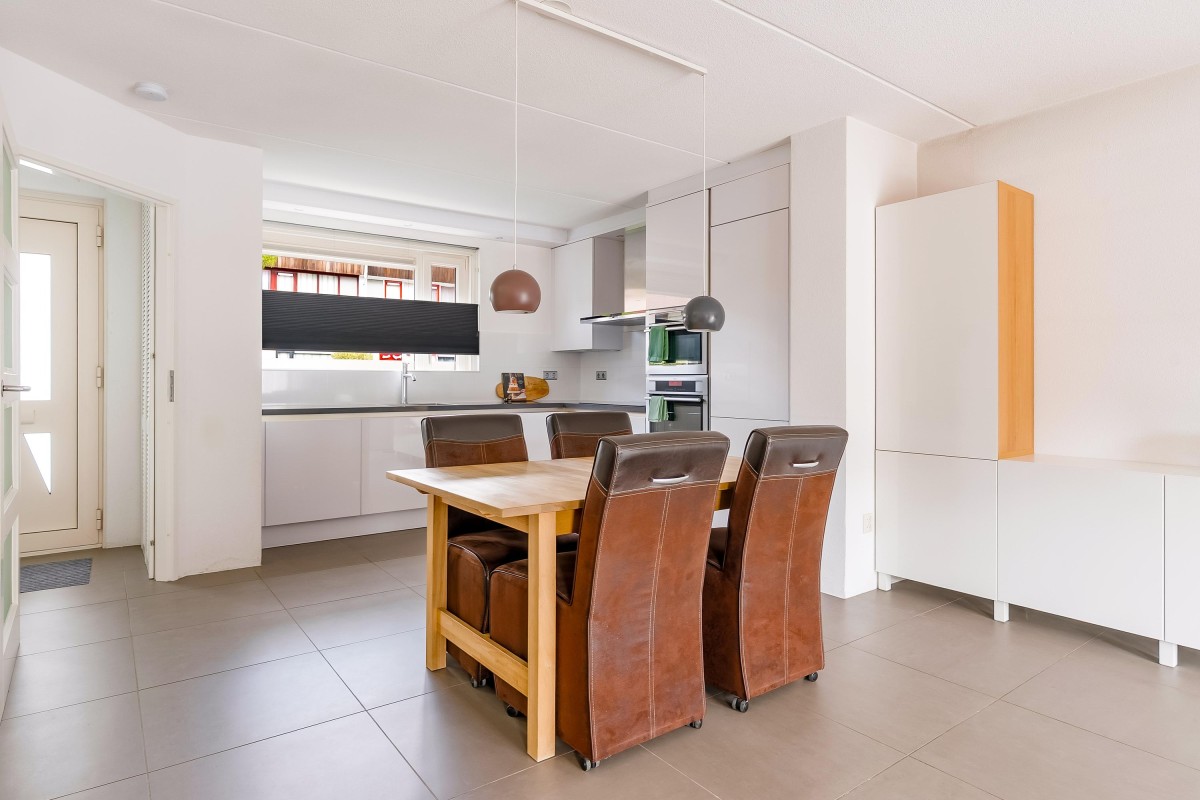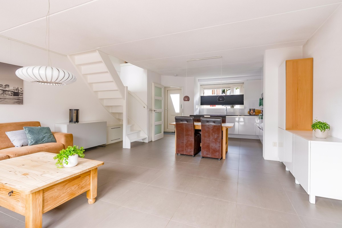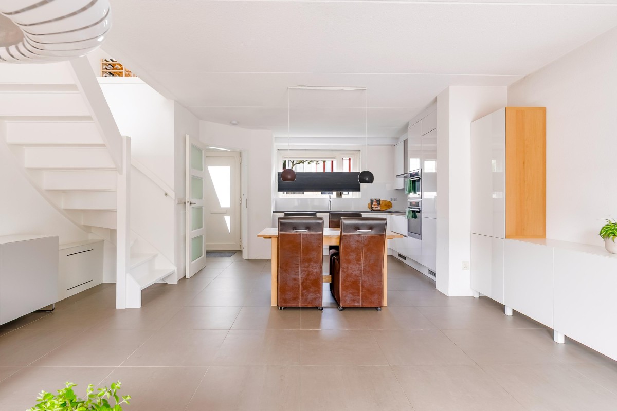 Vanuit de lichte hal met meterkast en modern toilet stap je de tuingerichte woonkamer in. De woonkamer met open keuken en trapopgang naar boven die is voorzien van een moderne tegelvloer met vloerverwarming, grote ramen en openslaande deuren, waardoor het daglicht rijkelijk naar binnen stroomt. Aan de voorzijde vind je de moderne open keuken (vernieuwd in 2017), compleet met inbouwapparatuur zoals een inductiekookplaat, vaatwasser, koel/vries combinatie, oven, combimagnetron, afzuigkap, hoekkast met 'Le Mans' systeem en voldoende werk- en kastruimte.