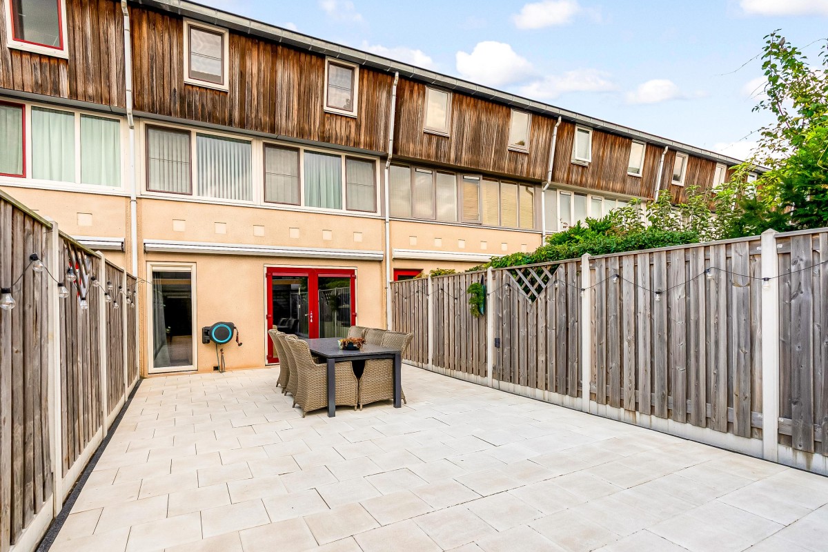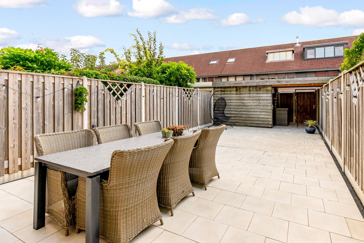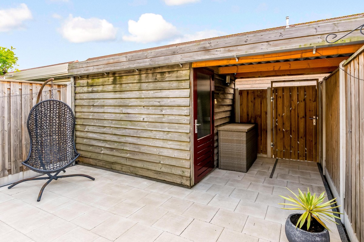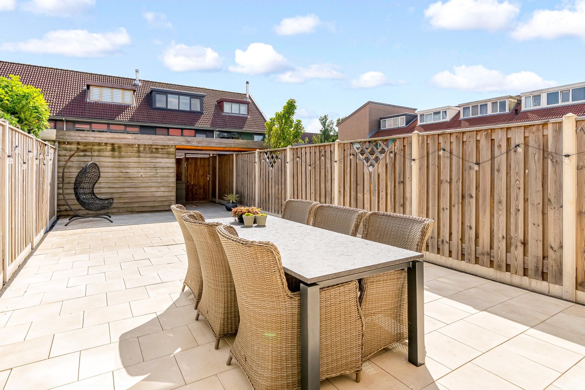 De achtertuin is zuidoost gericht en daardoor heerlijk zonnig. De tuin is onderhoudsvriendelijk aangelegd met tegels en voorzien van hout-beton schuttingen, een elektrisch zonnescherm en een handige achterom. Achterin staat een berging (ca. 9 m²) met recent vernieuwd dak, ideaal voor fietsen en opslag.