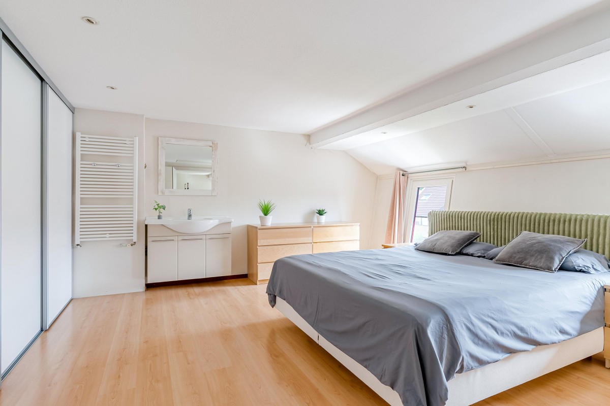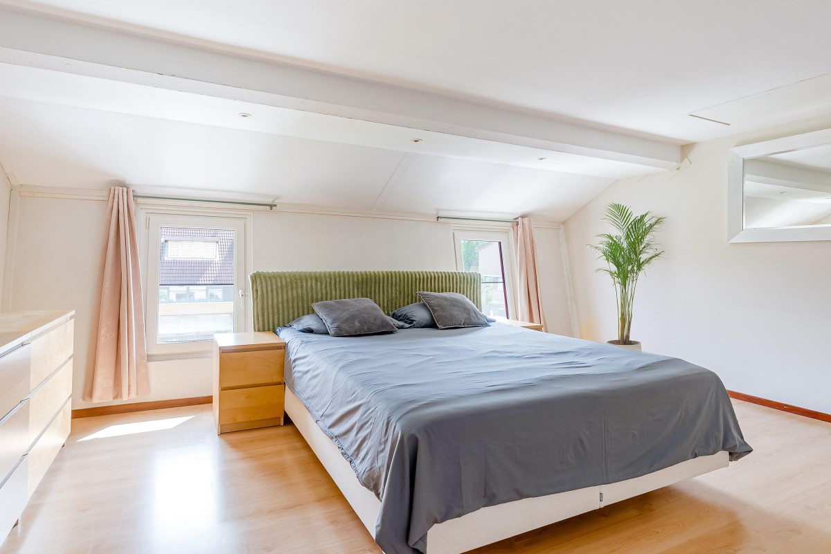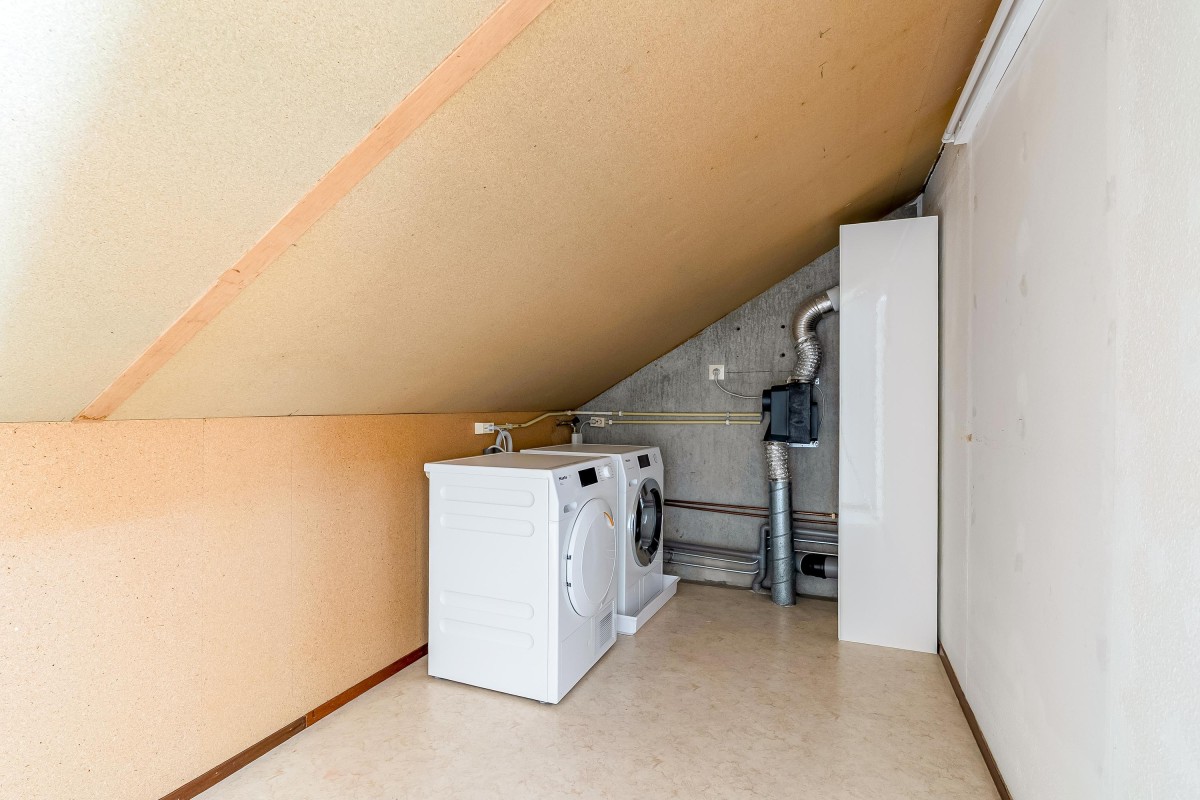 De vaste trap brengt je naar een volwaardige en verrassend ruime zolderverdieping met volwaardige slaapkamer, die dankzij de speelse ramen een bijzonder karakter heeft. Deze verdieping kan ook uitstekend gebruikt worden als werk- of hobbyruimte. Aan de voorzijde bevindt zich de praktische wasruimte met mogelijkheid tot het opbergen van spullen.