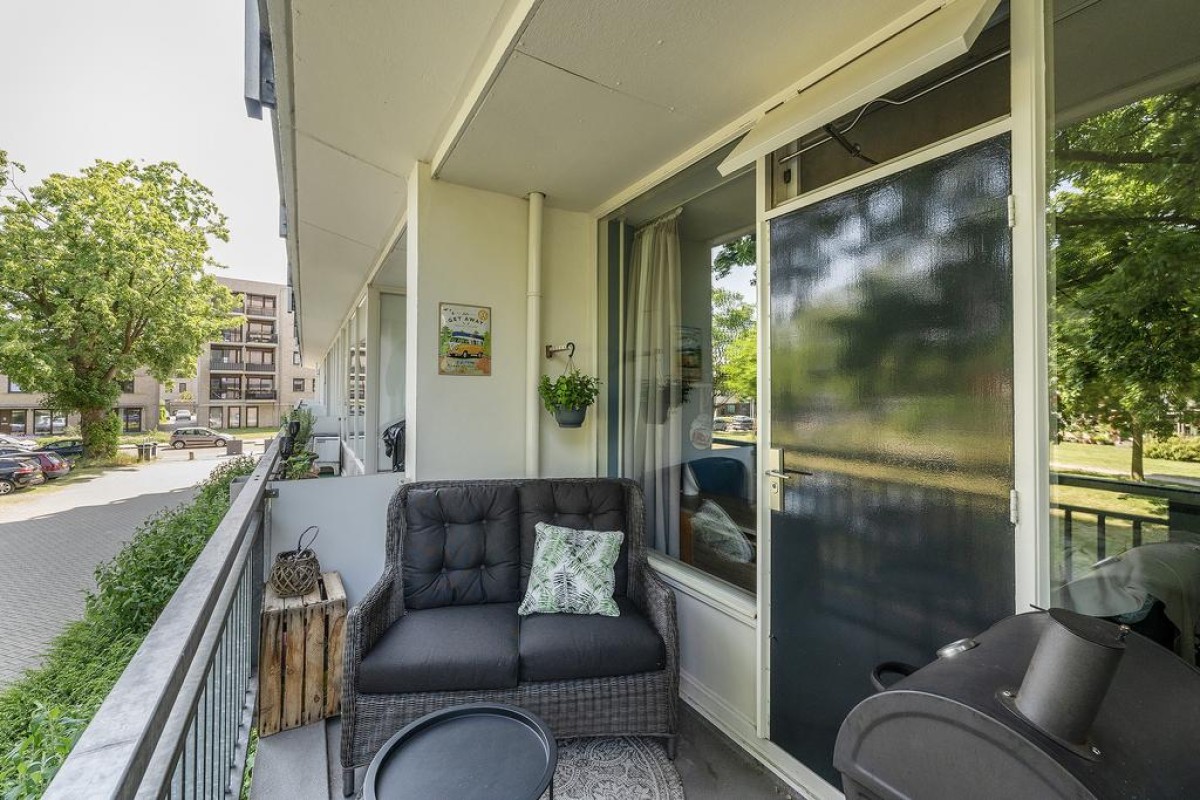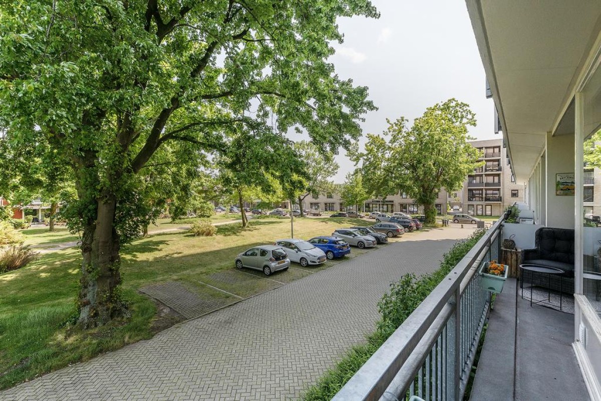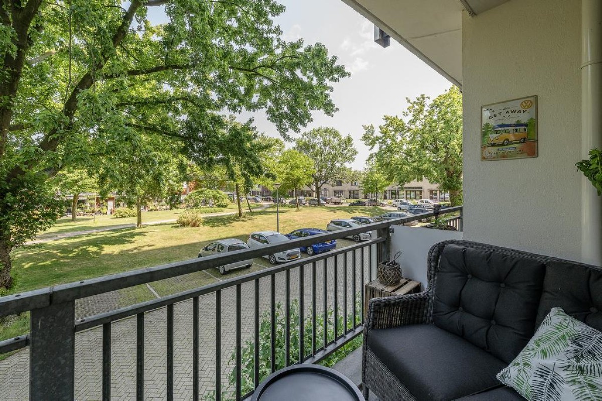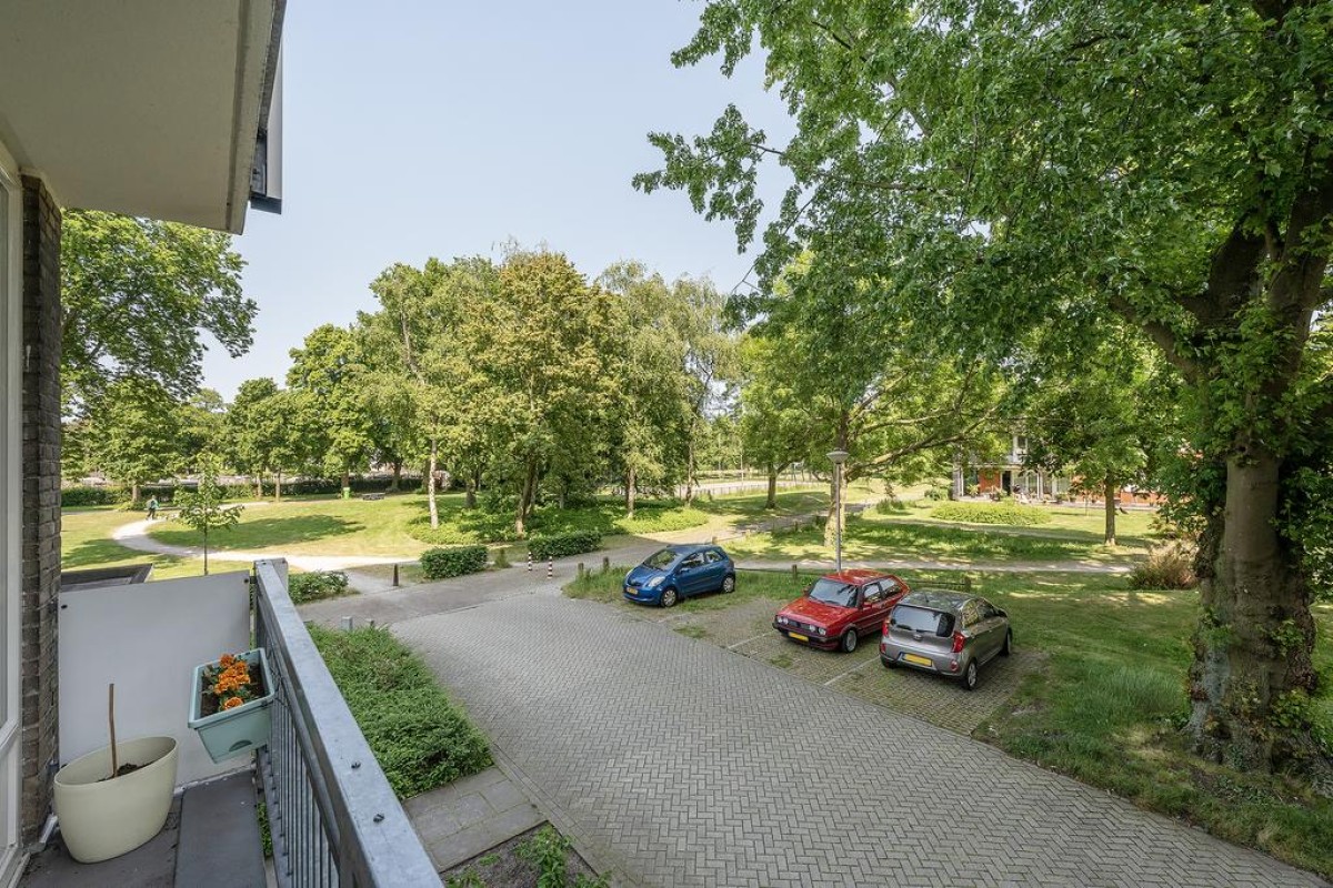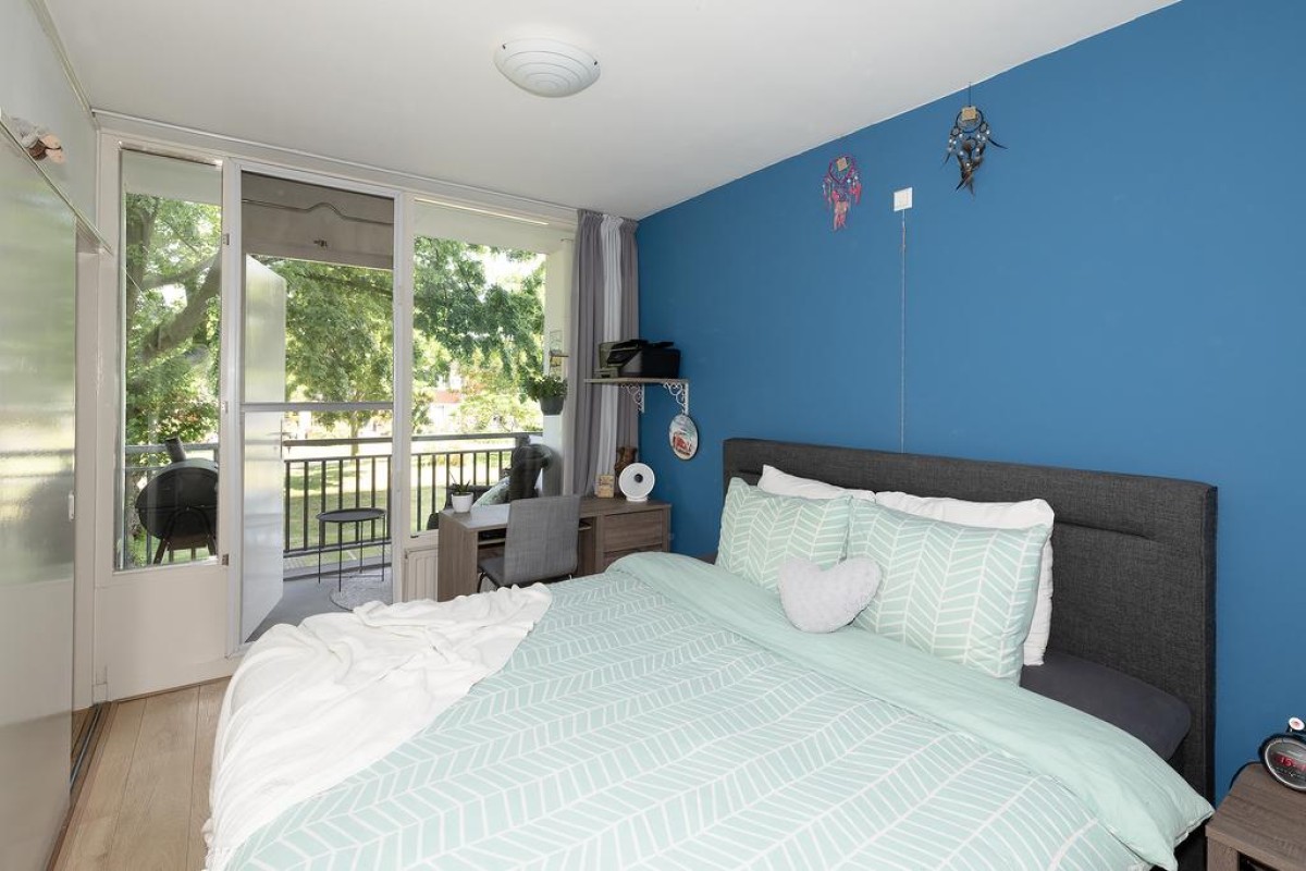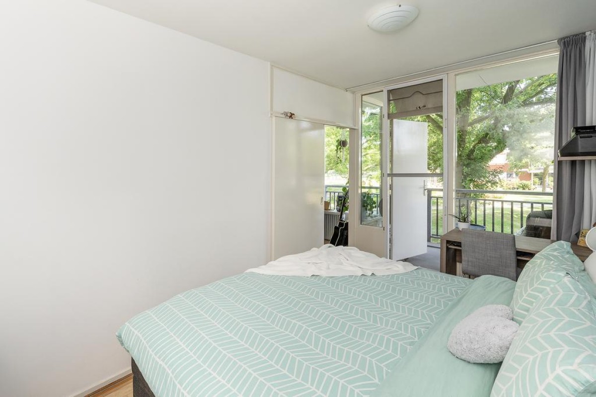 Aan de woonkamer grenst de slaapkamer met inloopkast. Het balkon is over de volle breedte en ligt op het oosten kijkt fraai uit op de parkachtige omgeving