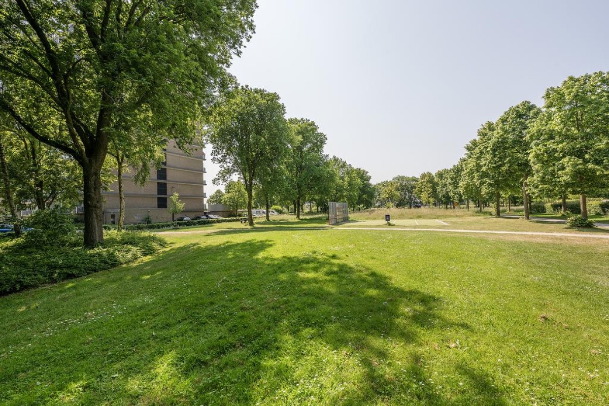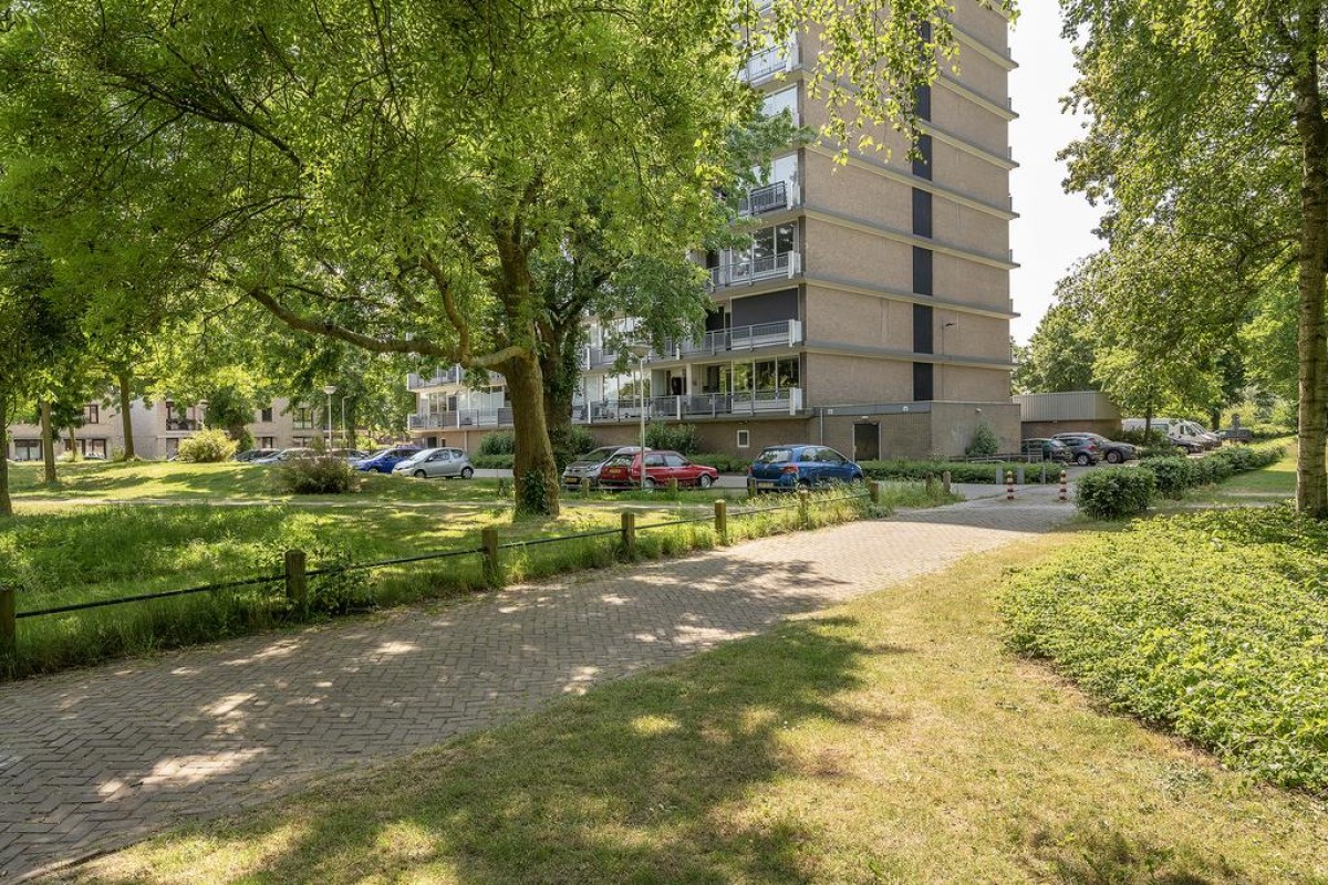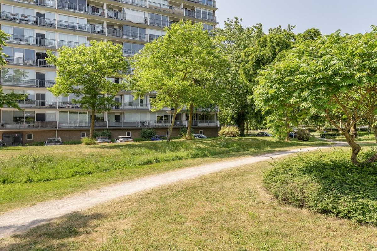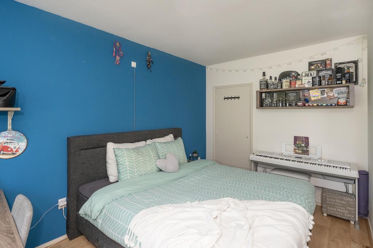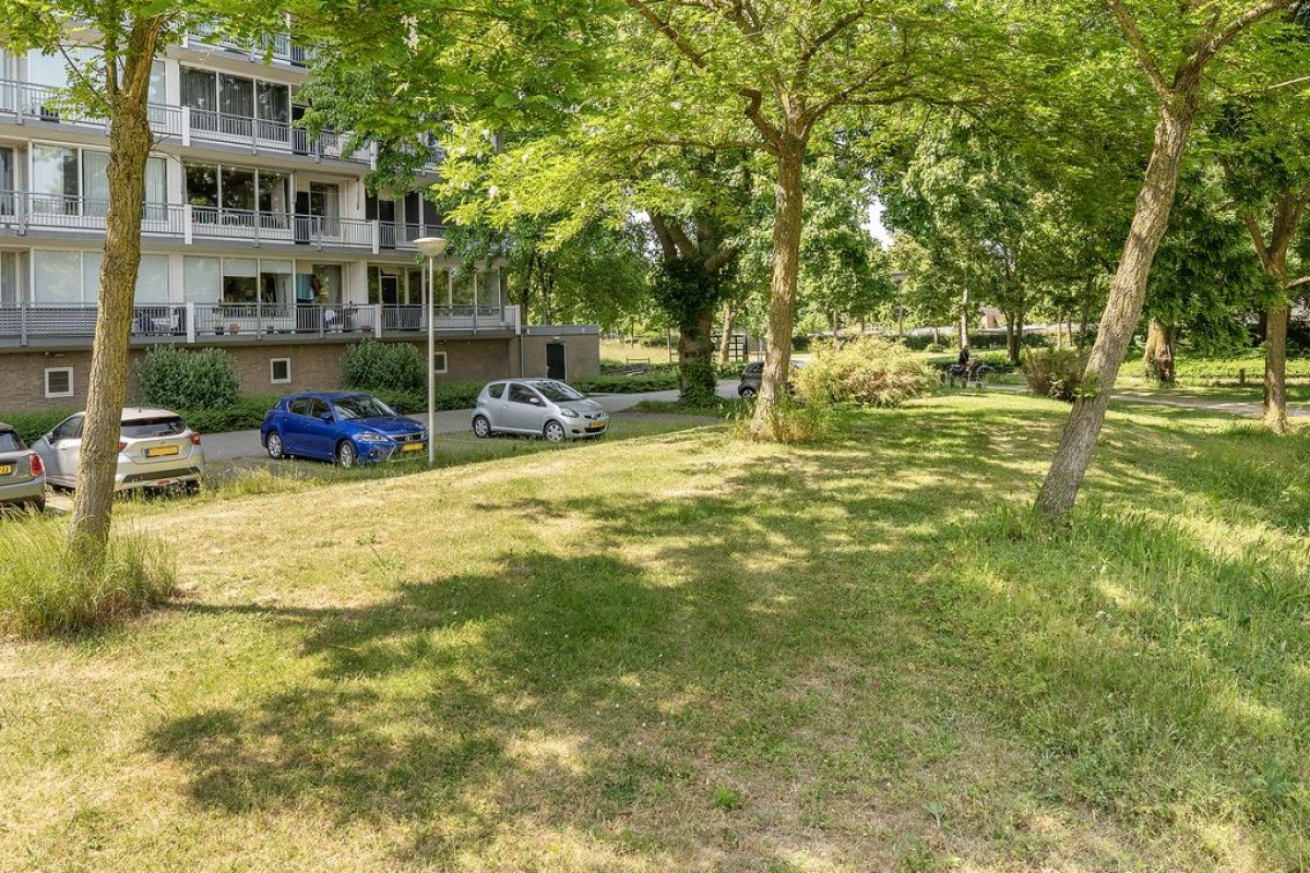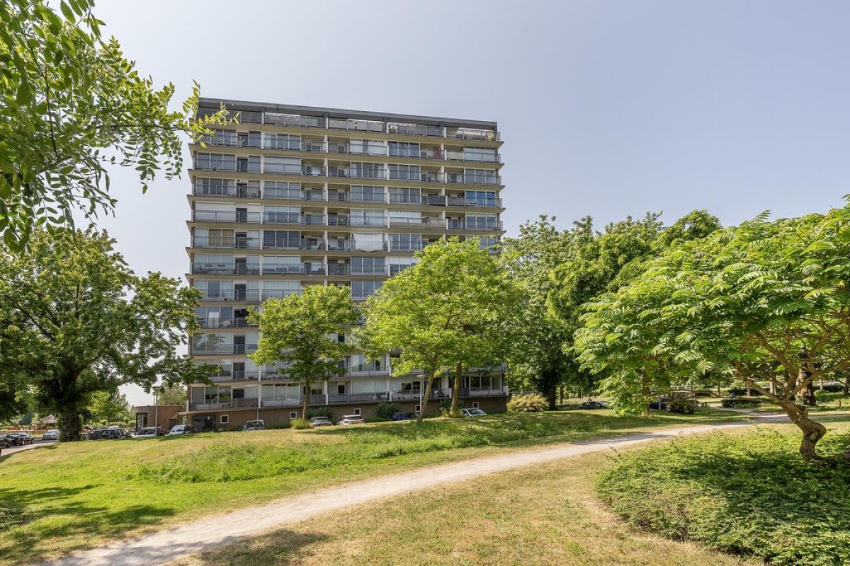 Aan de woonkamer grenst de slaapkamer met inloopkast. Het balkon is over de volle breedte en ligt op het oosten kijkt fraai uit op de parkachtige omgeving