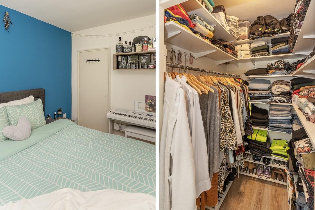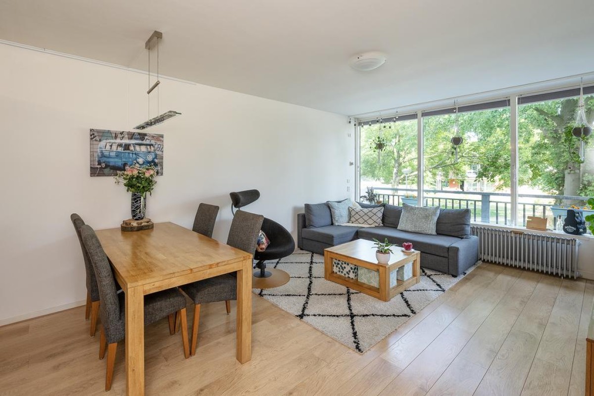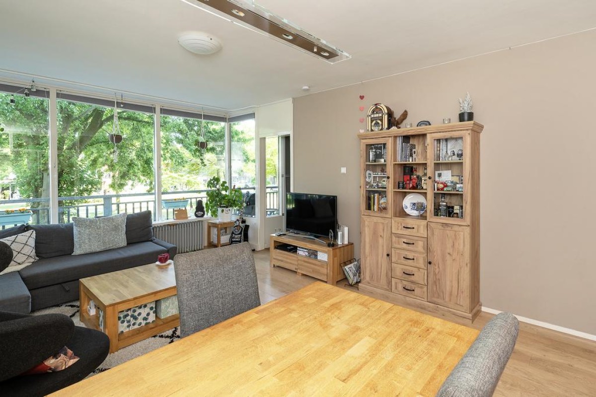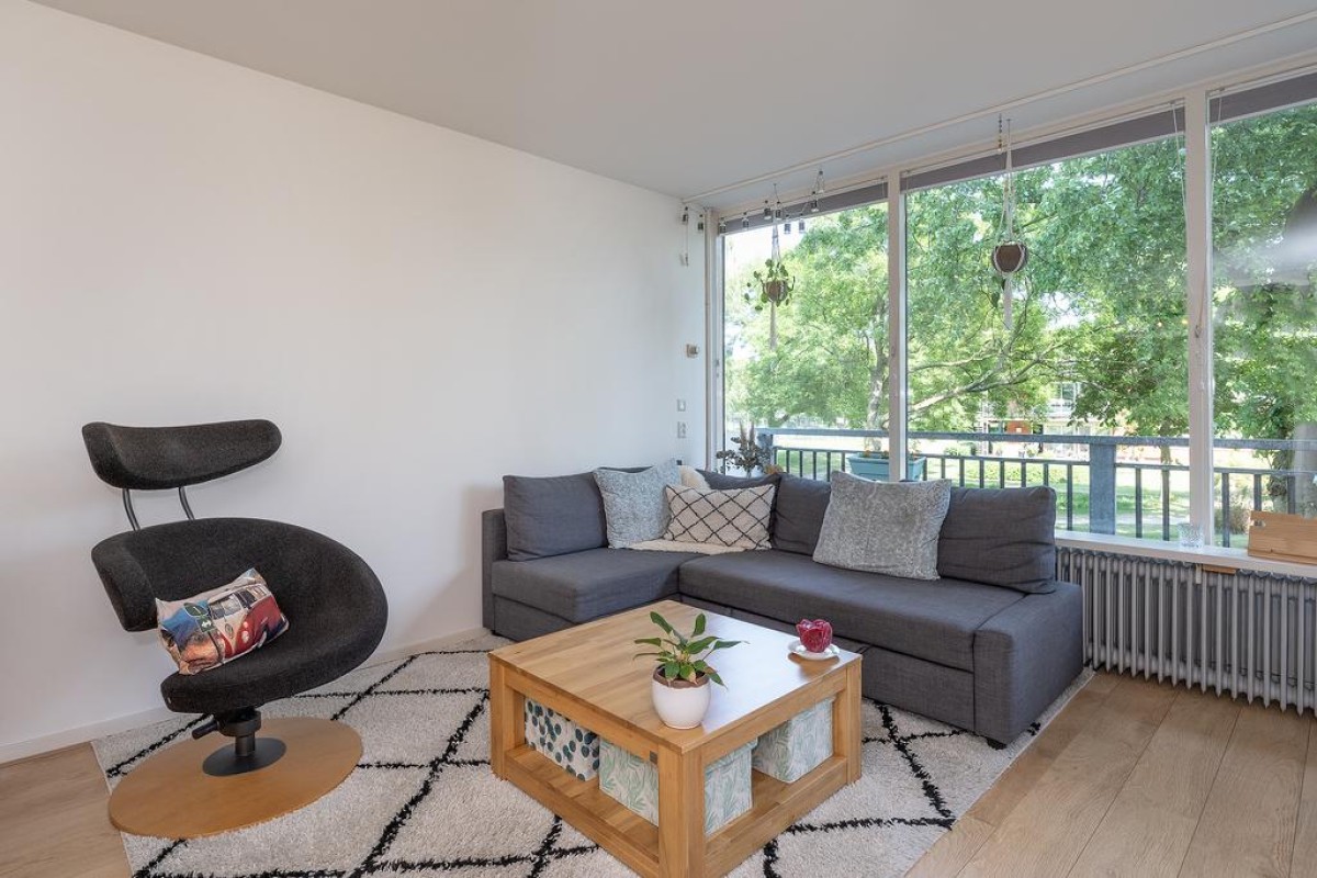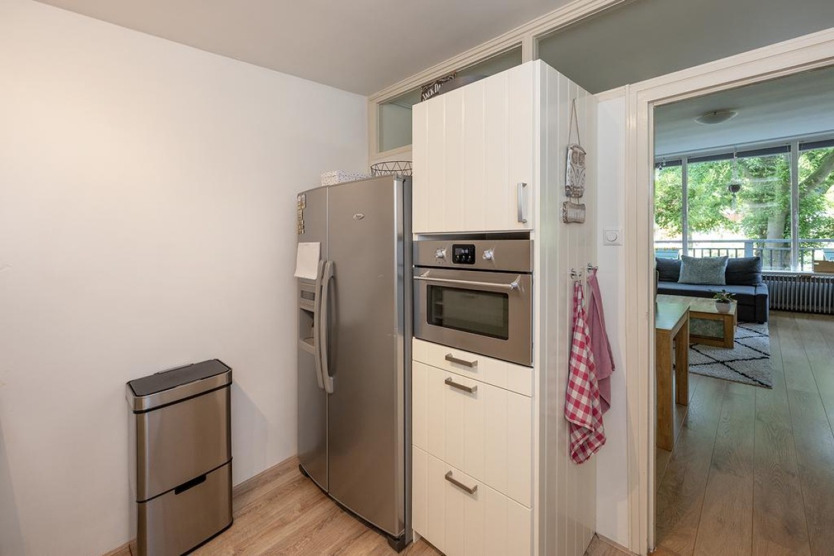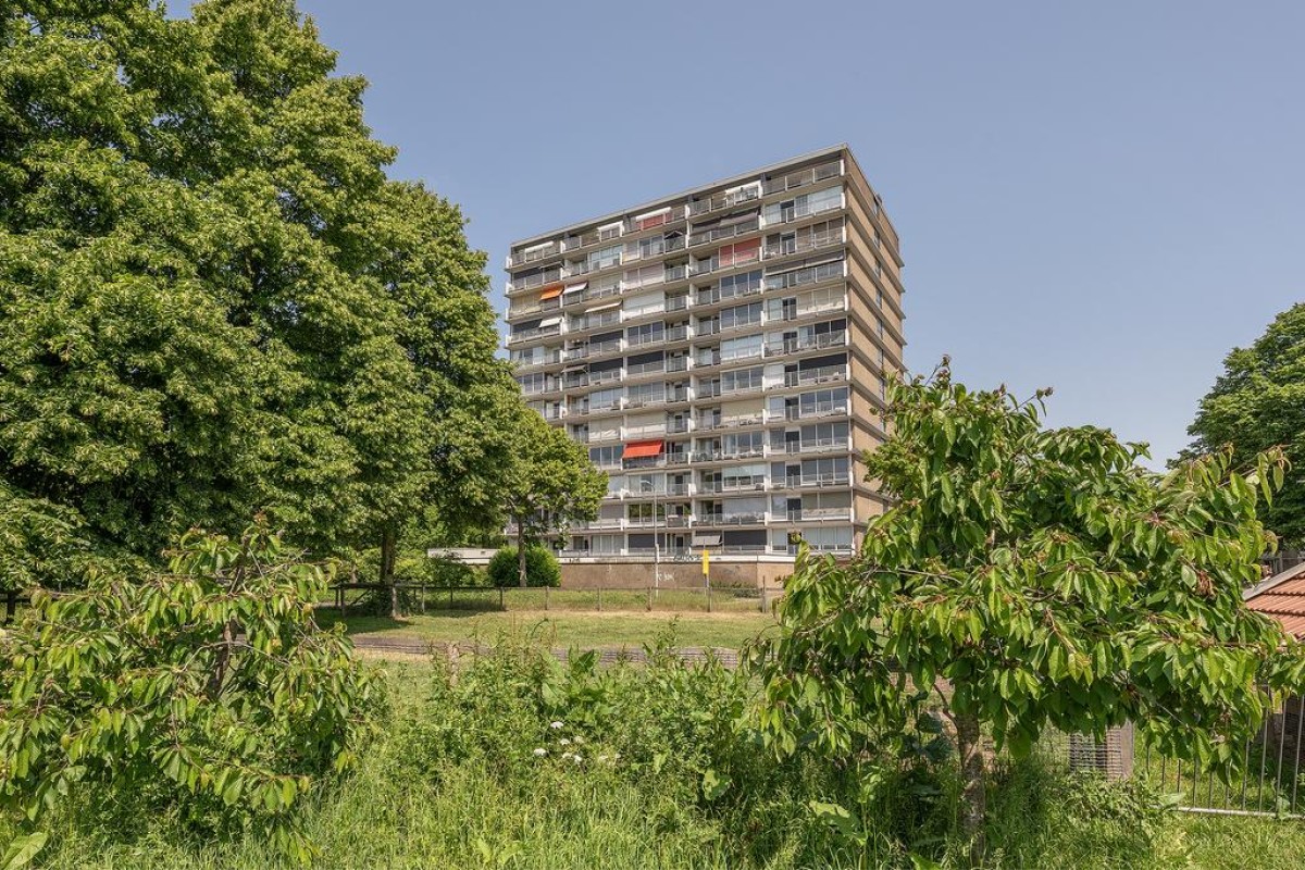 Aan de woonkamer grenst de slaapkamer met inloopkast. Het balkon is over de volle breedte en ligt op het oosten kijkt fraai uit op de parkachtige omgeving