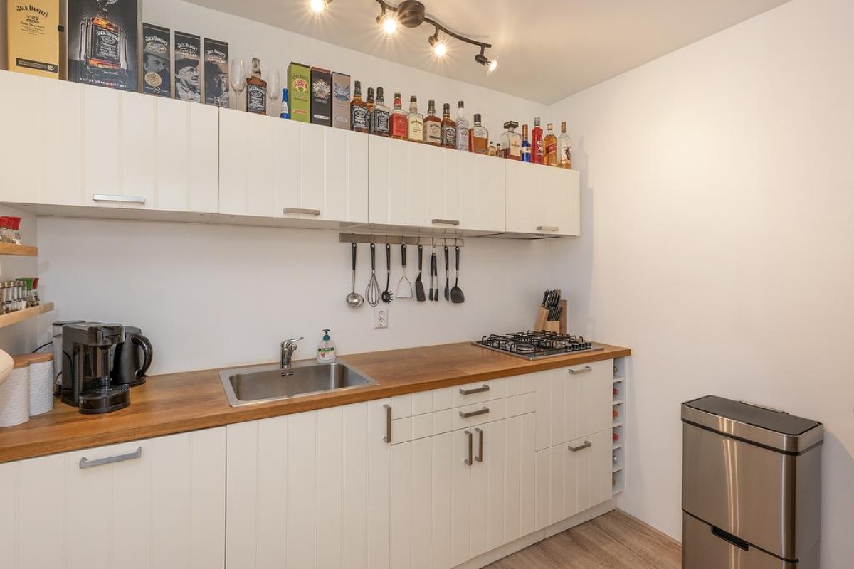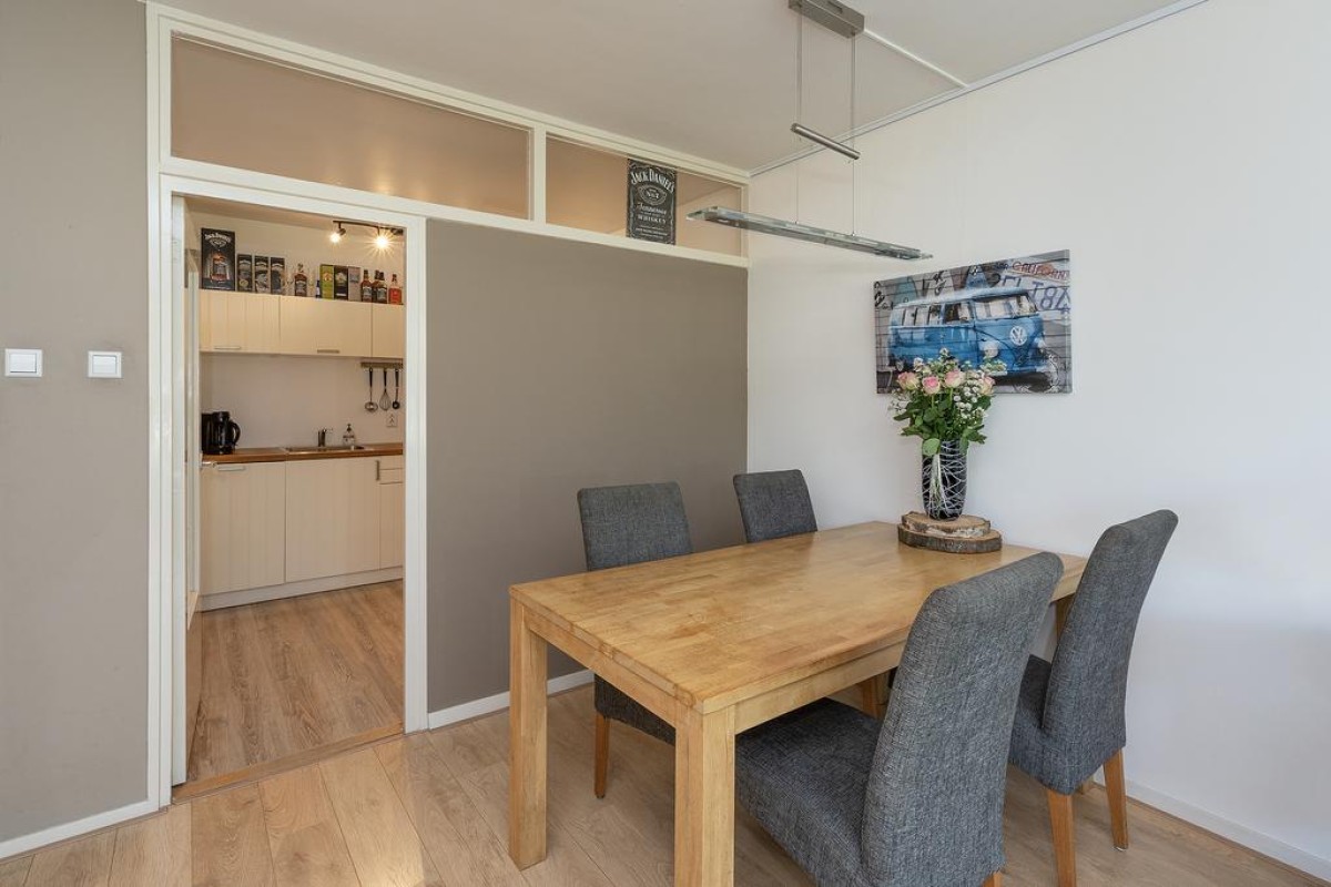 Woonkamer met een nette laminaatvloer en de luxe hoekkeuken is enkele jaren gelden geplaats voorzien van de nodige inbouwapparatuur.